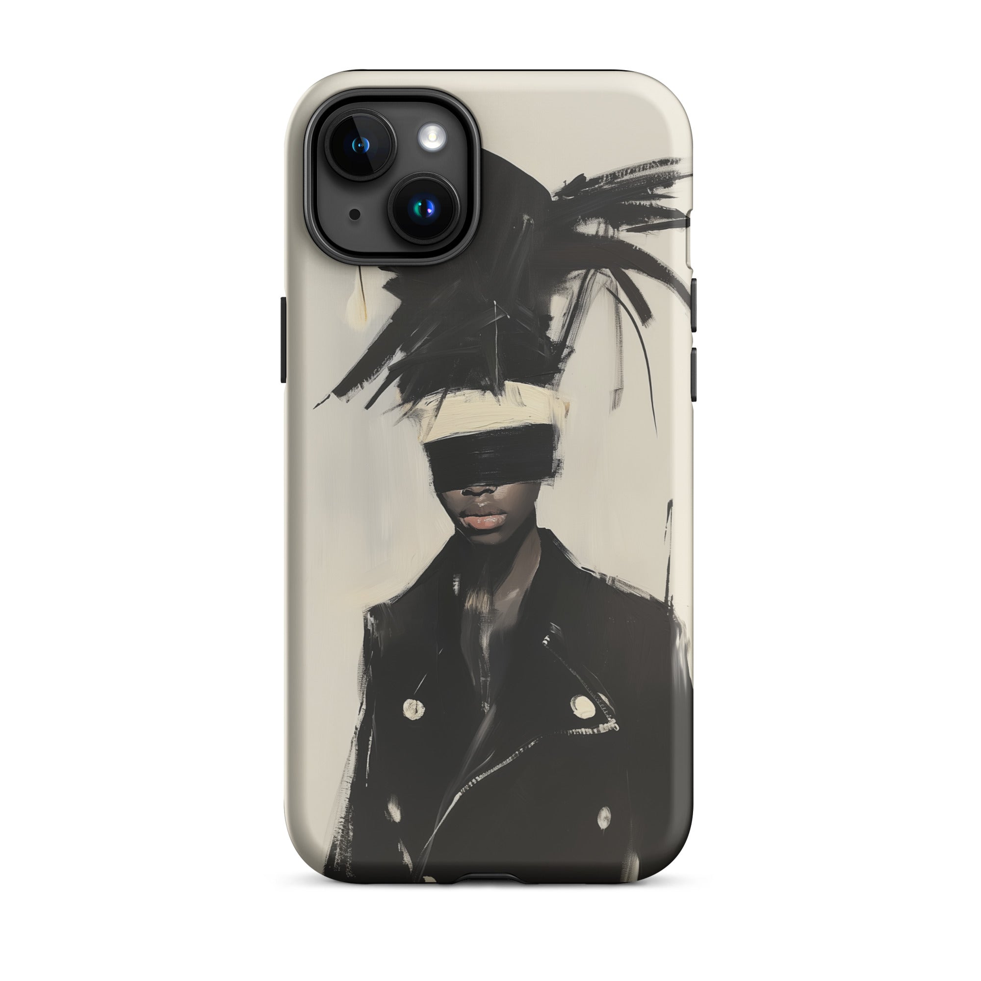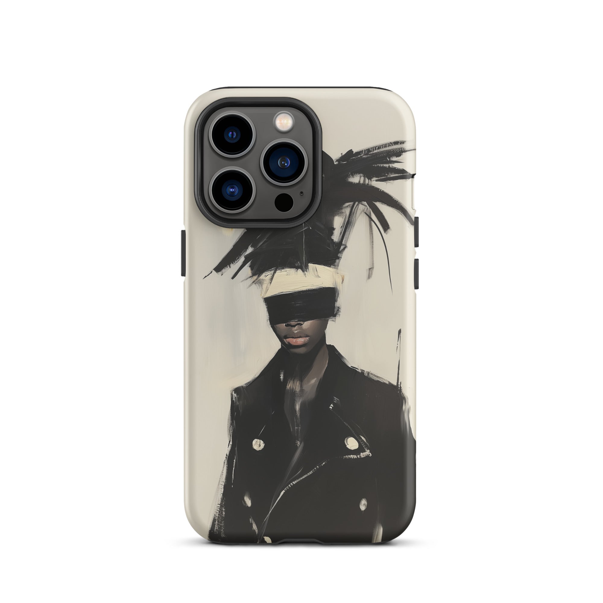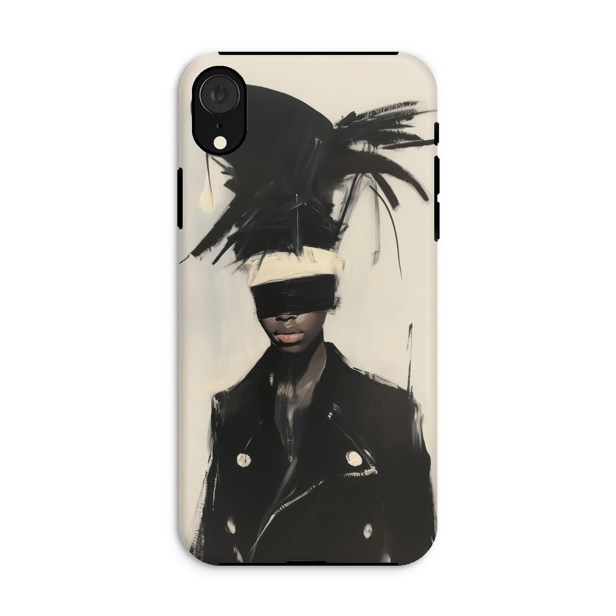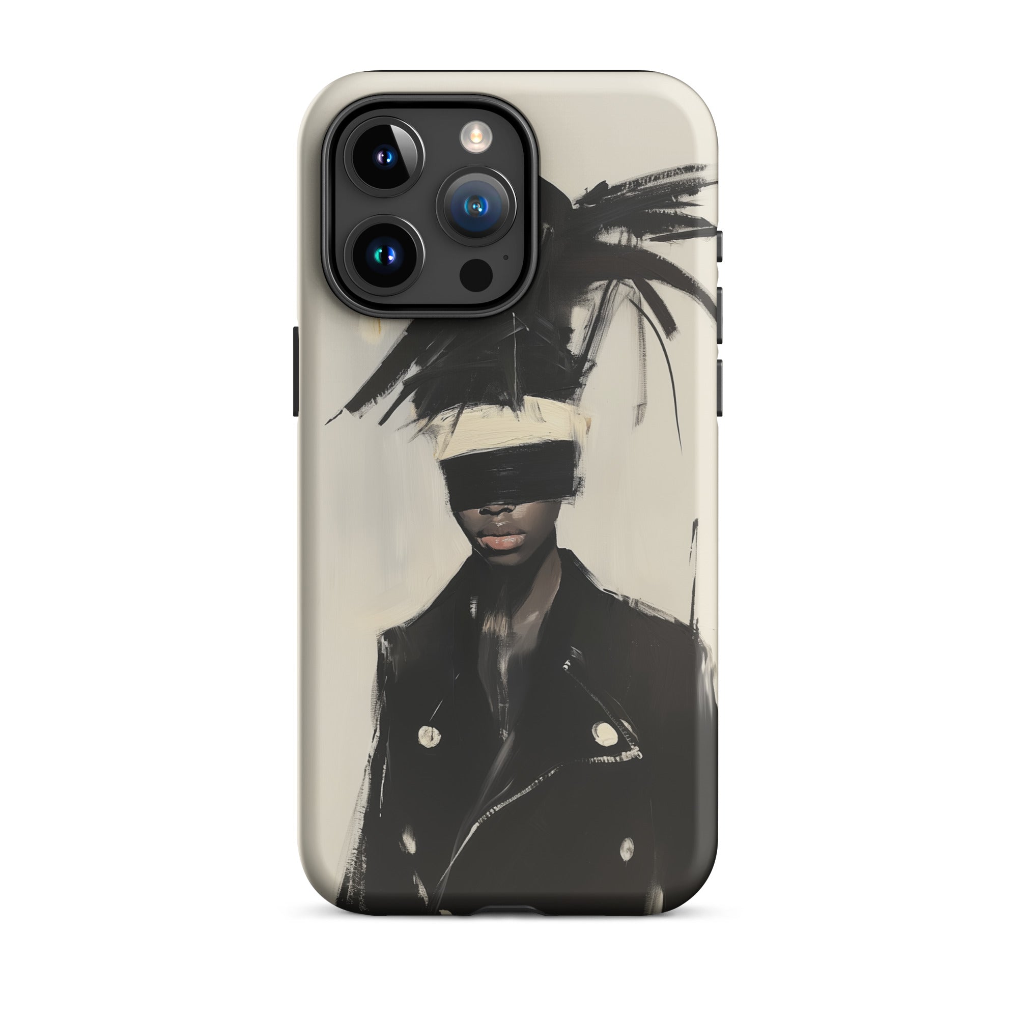 Cosa succede quando il silenzio sfila? Blindside non chiede. Dichiara. Questa custodia per iPhone è una rivolta tascabile di sfida, confezionata come un'arma segreta. Al suo centro: un'icona trans nera avvolta in pelle militante, bendata non per obbedienza ma per comando. Il piumaggio sopra? Meno ornamento, più dichiarazione—un esoscheletro di stile che erompe verso l'alto come una fenice nata dal drag.