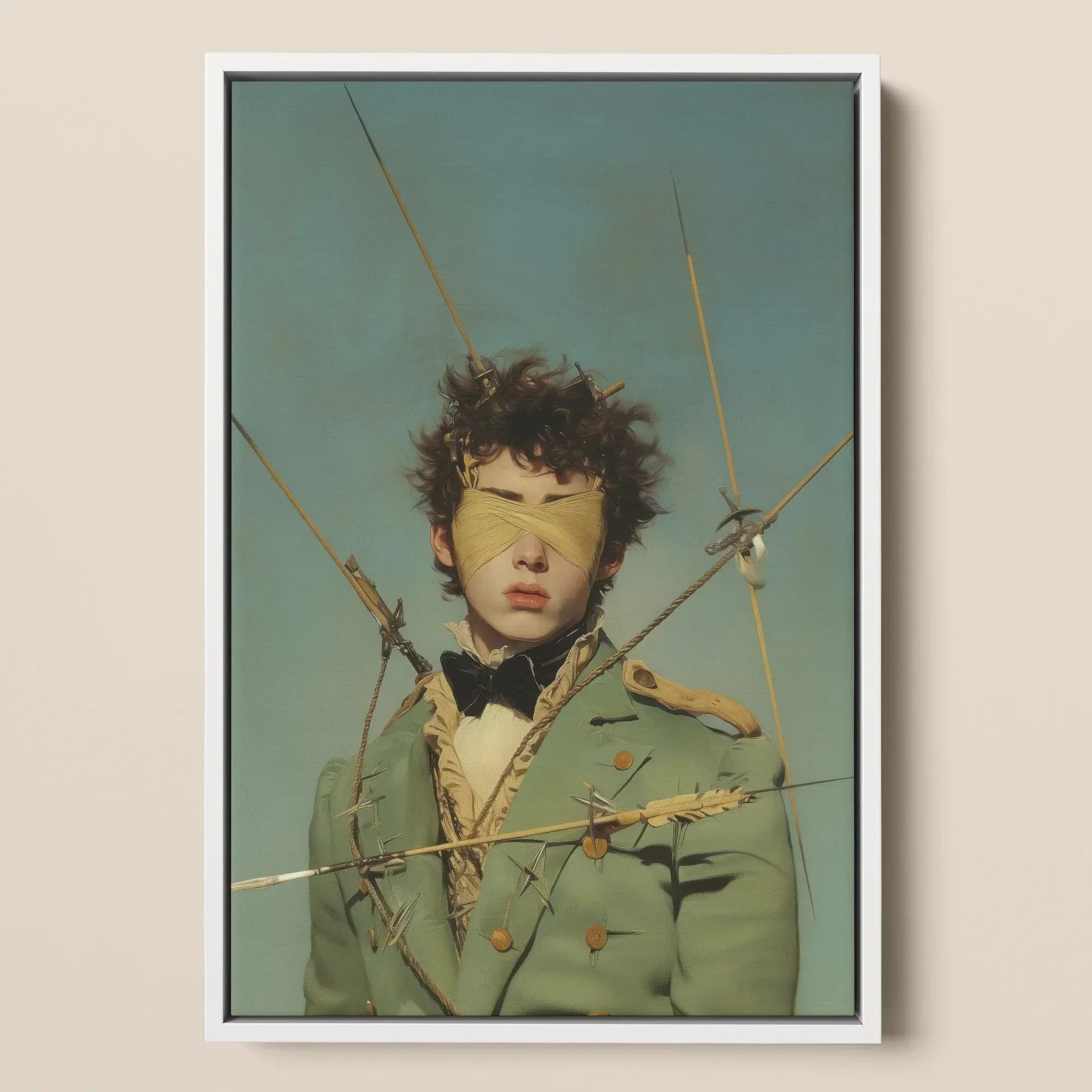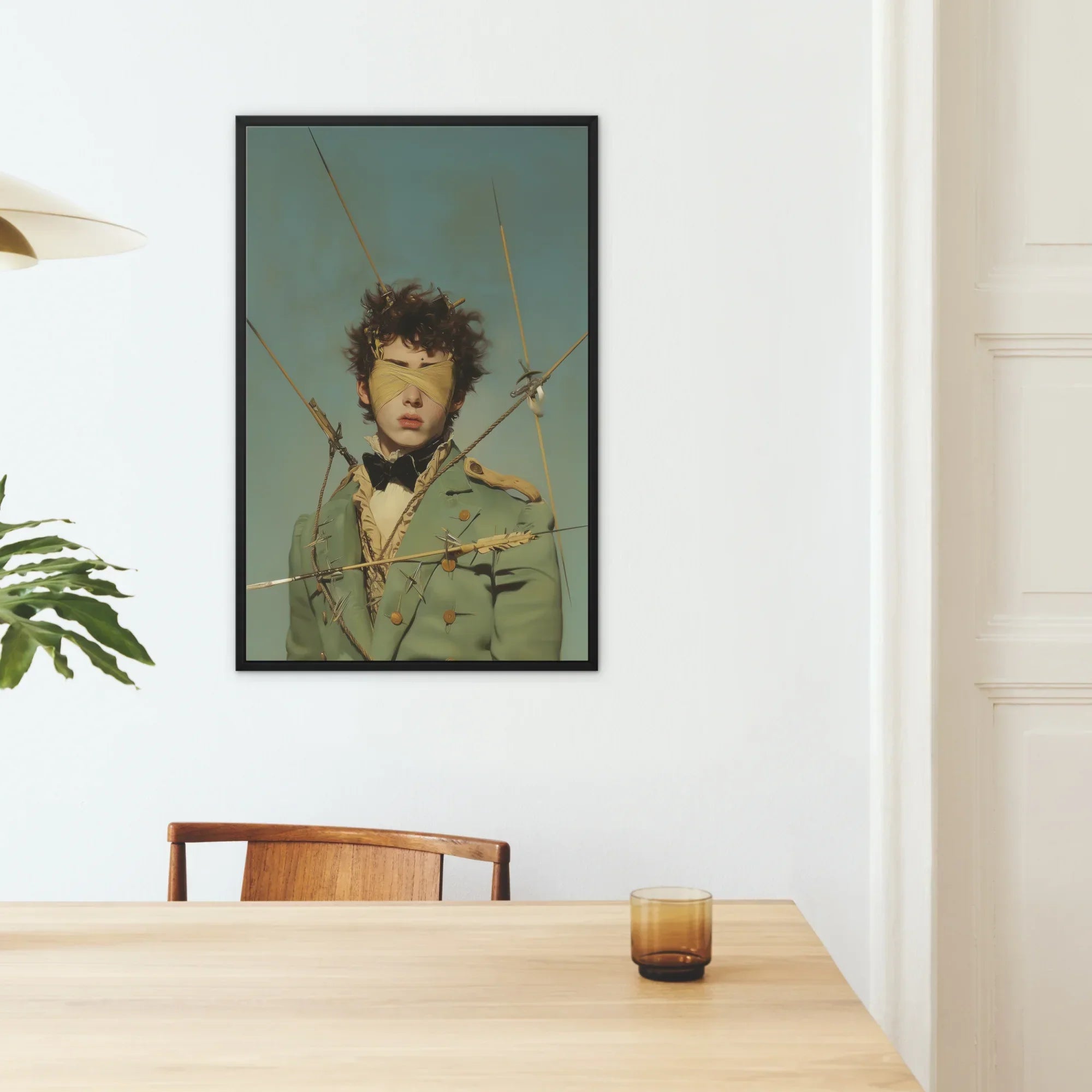 Bullseye è un'icona surrealista. Un gay militare flessibile arrestato a metà metafora. Bendato in ocra e legato da lance dorate che non feriscono ma orchestrano. Avvolto in un cappotto militare di rame ossidato. Le loro epaulette del XVIII secolo brillano come reliquie di una guerra combattuta nei sogni. Fluttuando in un cielo turchese dove la gravità non ha giurisdizione e il giudizio indossa guanti di velluto.
