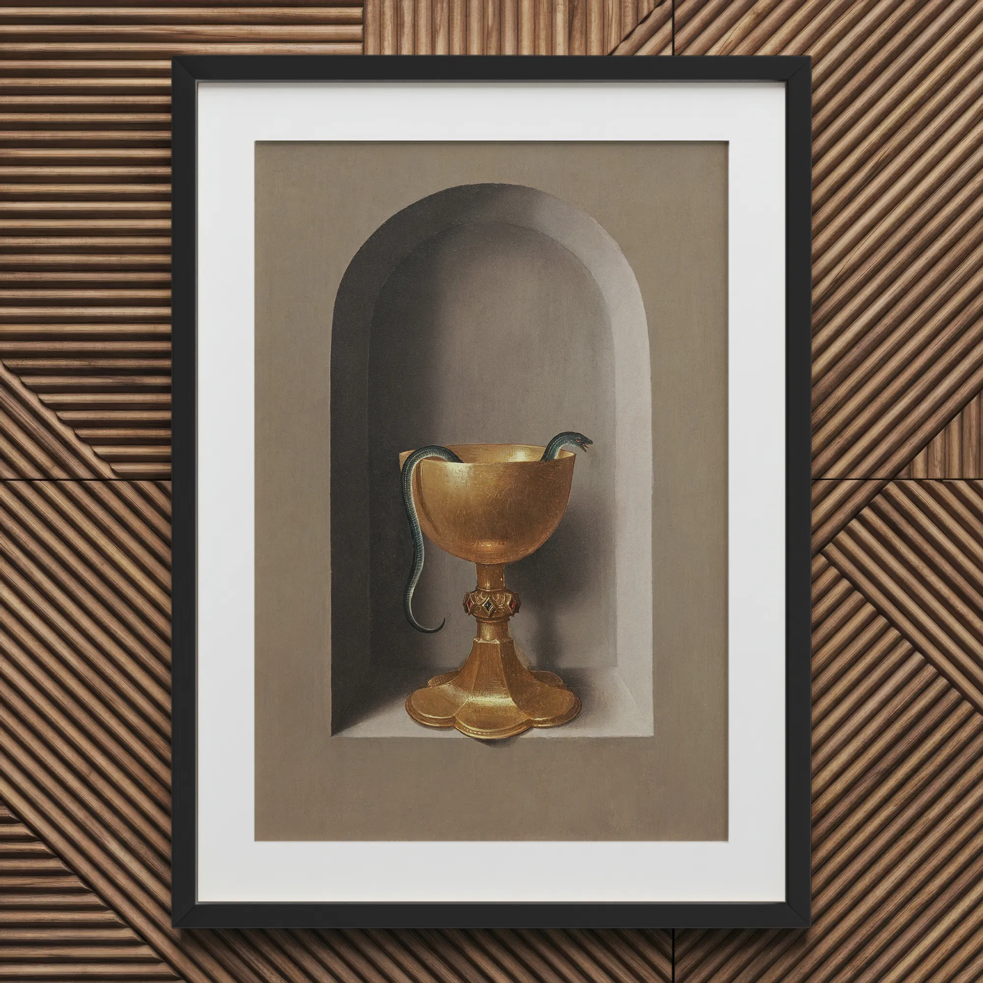 Sei attratto dall'interazione della luce e dell'ombra, dove gli intricati dettagli della Coppa sussurrano sussurri di artigianato divino. Il serpente, arrotolato di grazia sinua, introduce un elemento di pericolo e tentazione, la sua smeraldo scale un contrappunto sorprendente al bagliore caldo del calice. Questa composizione magistrale ti invita a meditare sulle dualità della fede: Purizia e pericolo, riverenza e ribellione.