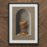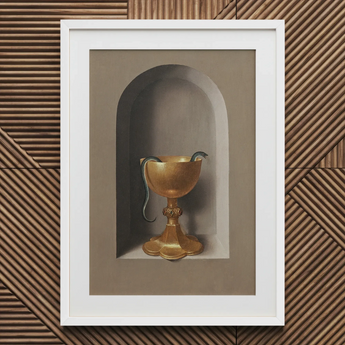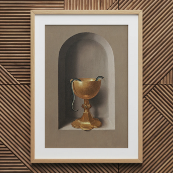 In questo affascinante stampa d'arte, "Il Calice di San Giovanni" di Hans Memling ti fa cenno in un regno in cui il sacro e profano si intrecciano. Il calice dorato, consacuto all'interno di una nicchia oscura, brilla con una luminosità ultraterrena, la sua superficie brunita una testimonianza della pennellata virtuosistica di Memling.