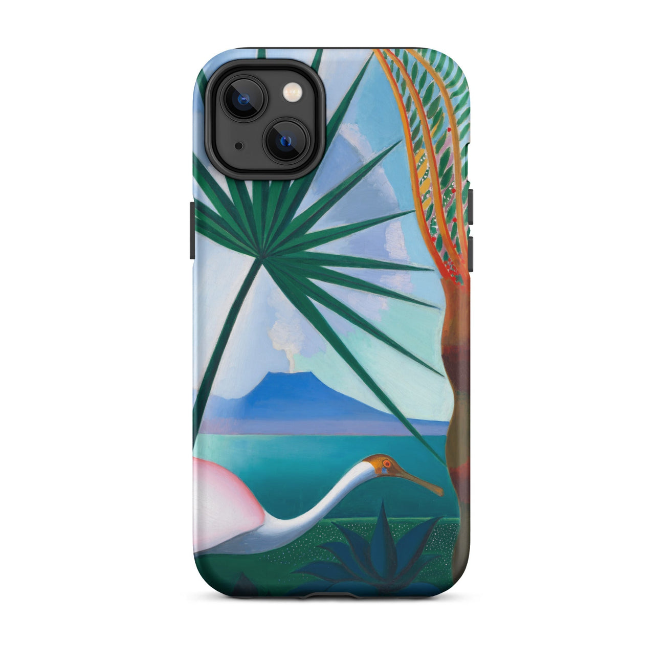 Un mondo si dispiega in una quiete elettrica—il rigoglioso modernismo tropicale si scontra con la geometria acuta dell'arte futurista, catturato in questa custodia per iPhone di Joseph Stella. Un airone, leggero ma deliberato, esplora un Eden surreale—la sua forma curva riecheggia il ritmo della pittura modernista italiana. Fronde di palme torreggianti si slanciano verso il cielo, la loro tensione angolare bilanciata contro il respiro silenzioso di un vulcano distante che fuma. Sotto, acque zaffiro si estendono verso l'orizzonte—un eterno paesaggio mediterraneo da sogno.