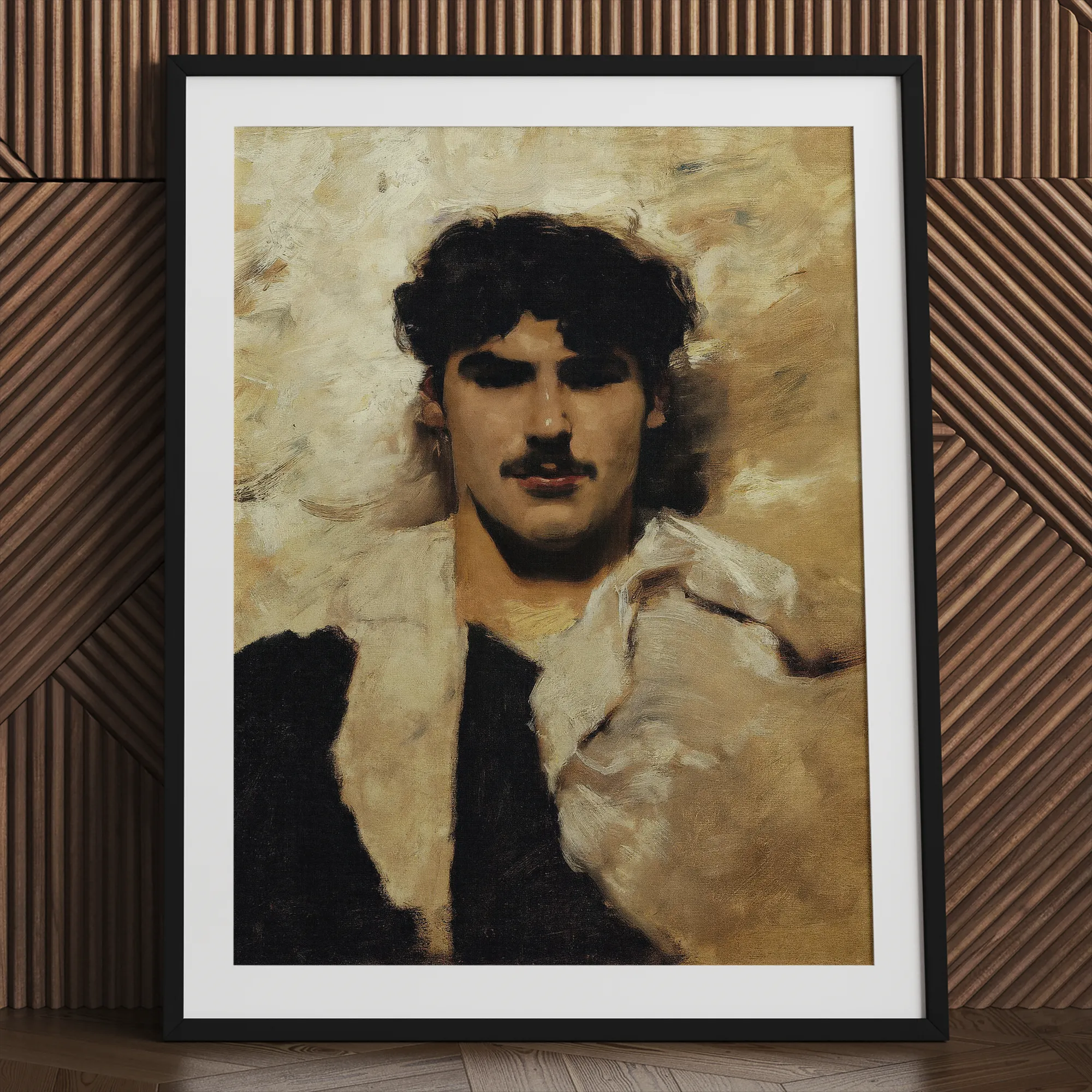 Sargent "Testa di un modello maschile" è inondata di talento grezzo. Una dimostrazione virtuosa di abilità olio su tela che farà ballare i tuoi occhi. Questo non è solo un ritratto; è un manifesto di ciò che la pittura può fare quando viene spinta al limite. Il volto del modello emerge da un vortice di ocra e terra d'ombra, i suoi occhi scuri come due buchi neri che ti attirano nella loro orbita. E quei baffi — non sono solo peli facciali. È una dichiarazione di mascolinità ardente resa in pigmento.