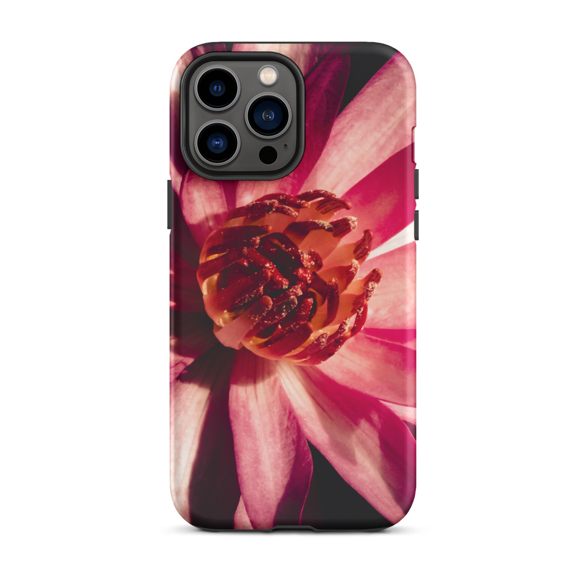 La custodia presenta un fiore di loto in piena fioritura, i suoi petali una sinfonia di fucsia e cremisi su uno sfondo di ossidiana. Ammirerai la cattura ad alta risoluzione che porta ogni dettaglio alla vita - dai petali vellutati al polline dorato che spolvera il cuore del fiore. Questo design trascende la mera estetica, incarnando il viaggio del loto dalle profondità torbide alla bellezza radiante.
