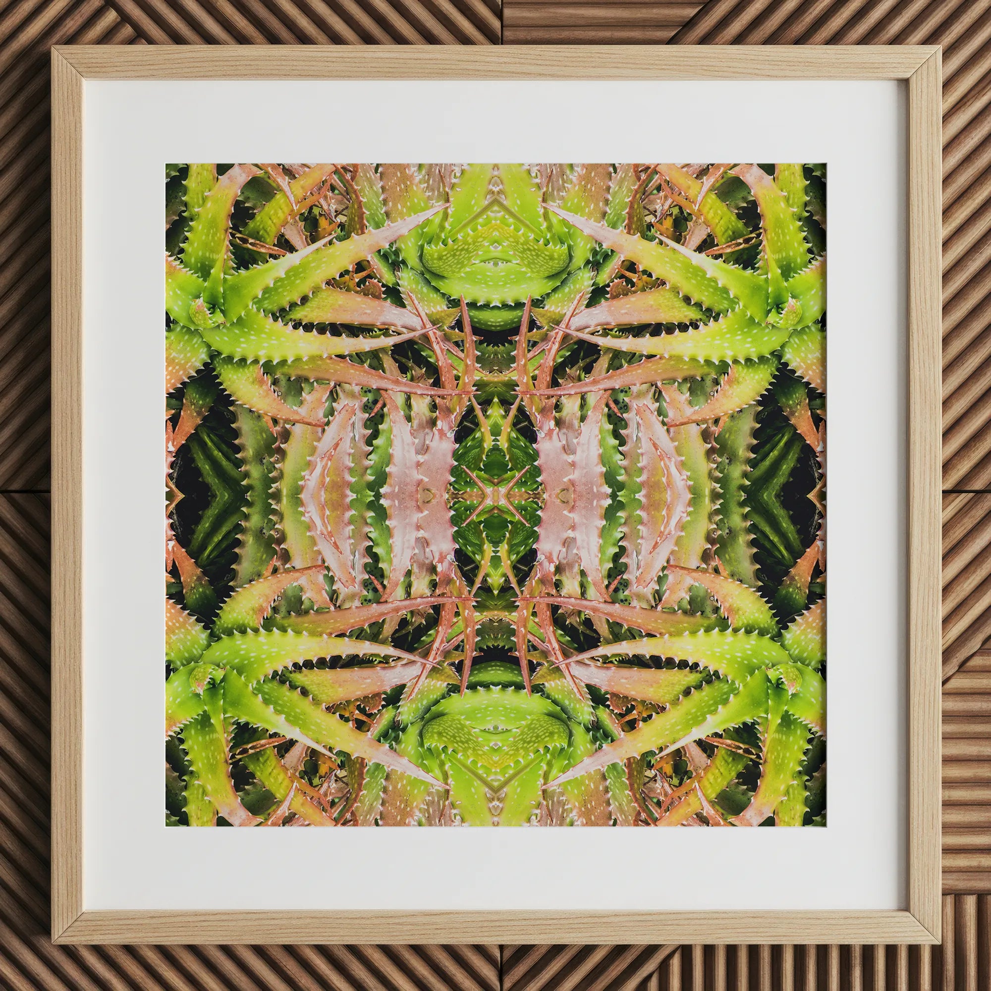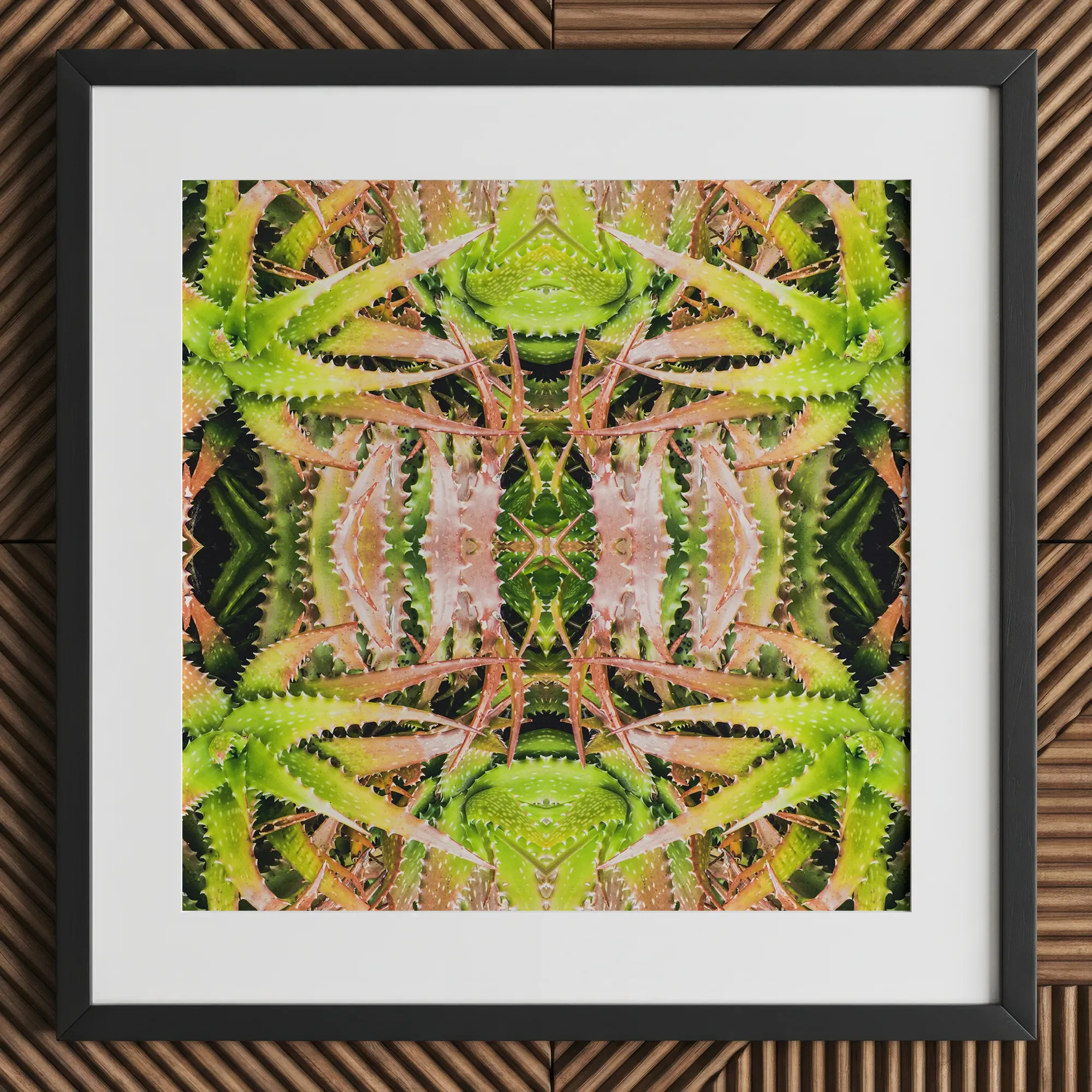 La simmetria ipnotica dell'opera d'arte, resa in verdure lussureggianti e rosa morbidi, aumenta la flora del deserto a proporzioni cosmiche. Mentre guardi questa intricata composizione, assisterai alla resilienza della natura reinventata attraverso una lente di perfezione geometrica. Ogni spina e foglia, meticolosamente rispecchiata e moltiplicata, crea una sinfonia visiva che sfida la percezione.