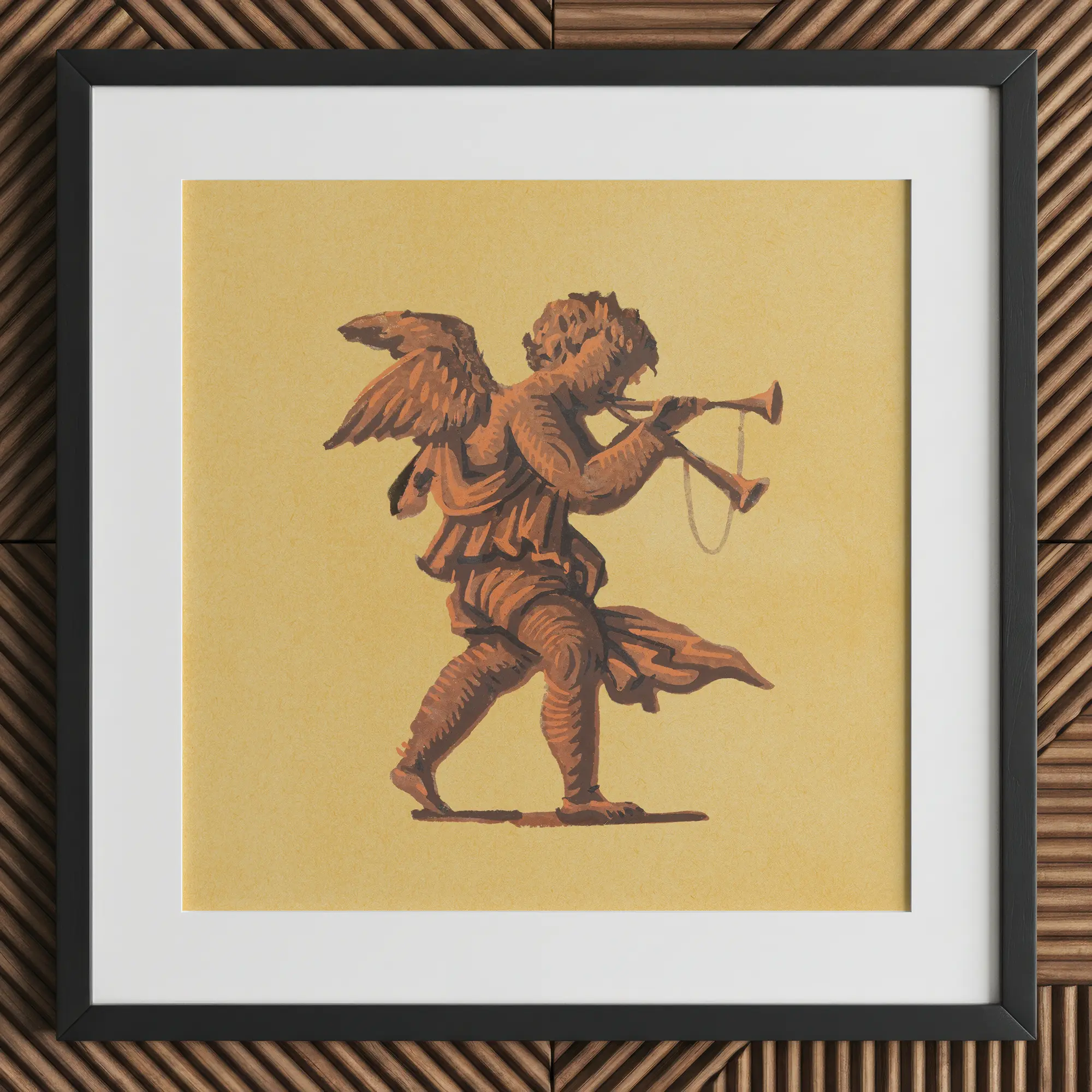 Questo cherubino avanza come se attraverso l'aria di pergamena, vesti a metà cascata. Non di dolcezza, ma di processione. Le sue doppie trombe si allungano in avanti come rami che cercano il mattino, cucite insieme con una corda allentata che oscilla con il tiro di un suono invisibile.