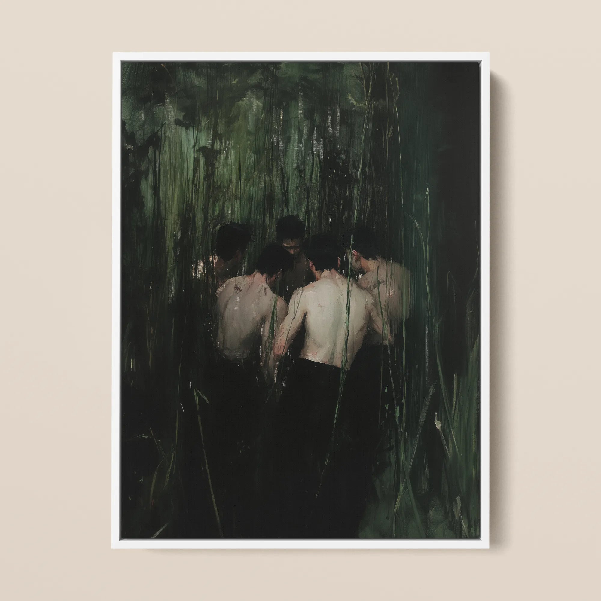 Non entrano come uomini ma come rottura. Schiene arcuate come cenotafi pagani, lucide del sudore umido della confessione. La pelle, pallida e splendente, diventa una scrittura eretica scarabocchiata contro canne e crepuscolo. Questa è una convergenza di calore e patto. Un salmo appiccicoso scritto nella lingua franca della carne anonima. Nessun nome, nessun volto. Solo la santa geometria del loro cerchio, teste chine per spingersi più a fondo della dottrina.