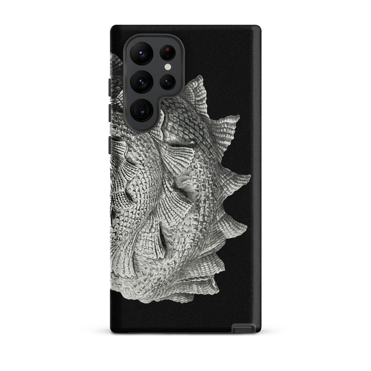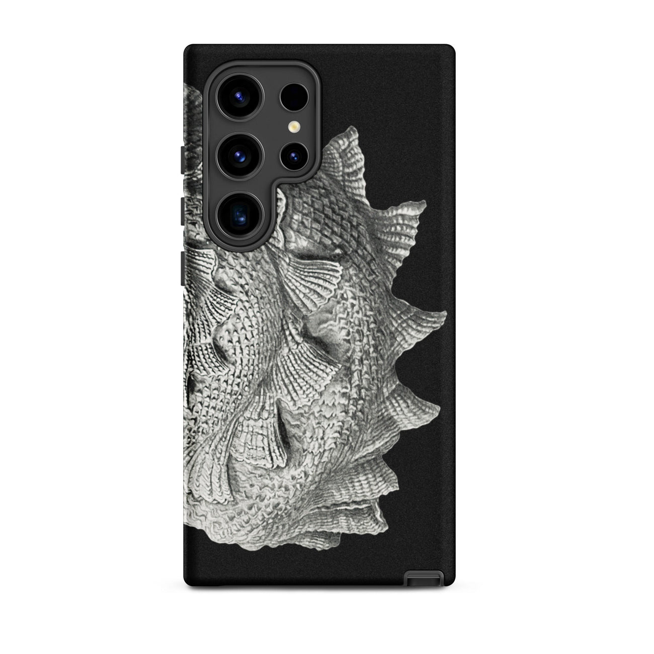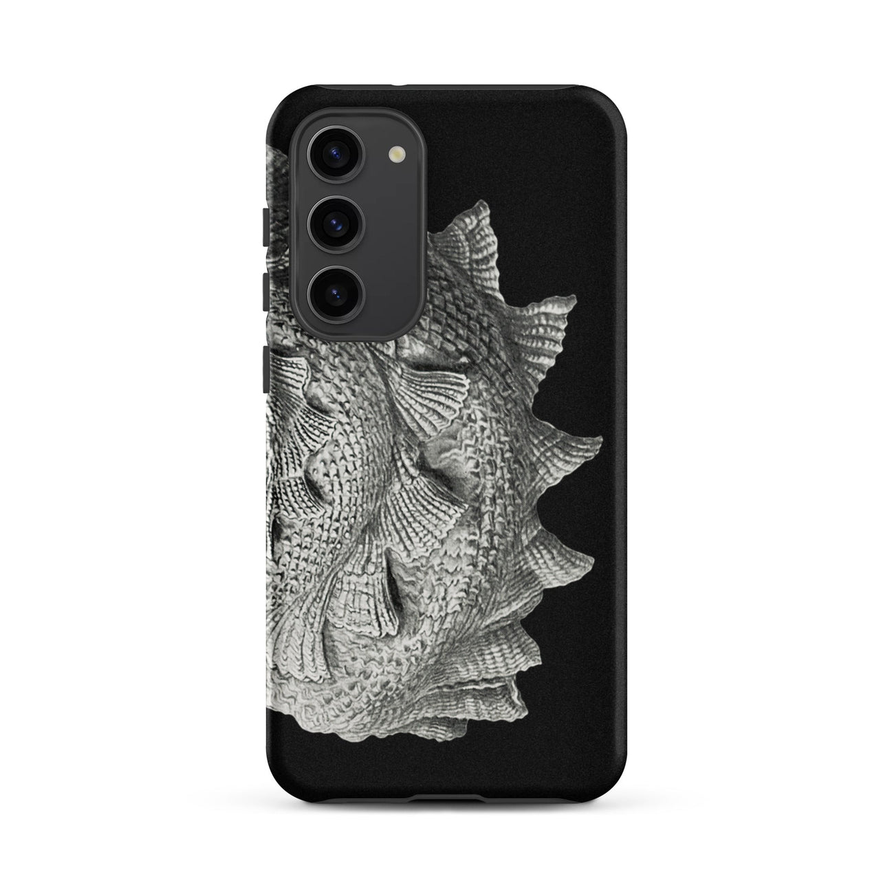 Il capolavoro a spirale di Ernst Haeckel sboccia su questa custodia Samsung come una tempesta fossilizzata, ogni cresta è un'ondata congelata di qualche marea primordiale. I suoi vortici barocchi e le sporgenze pinnate richiamano cittadelle di corallo, volte di ammoniti, l'armatura costolata di antichi cefalopodi.