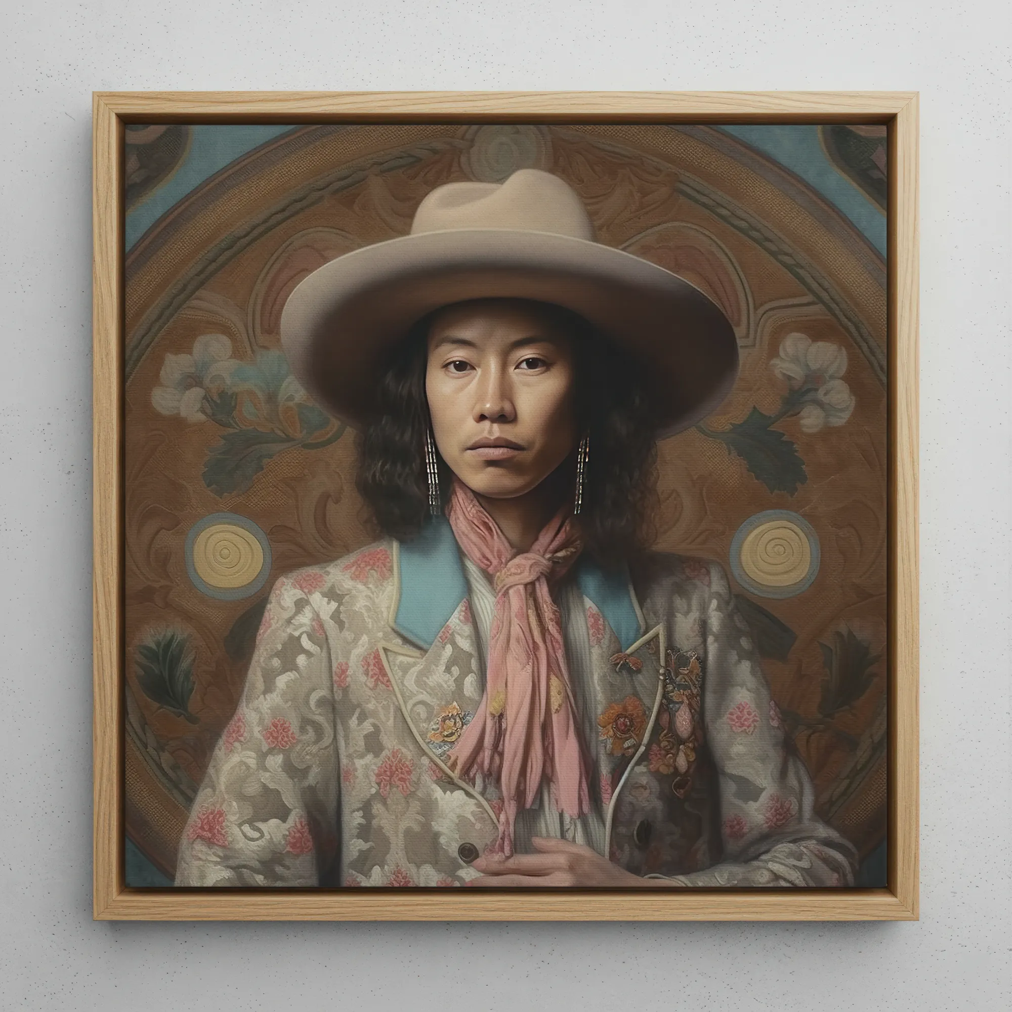 Dorjee si trova al crocevia della storia, un cowboy tibetano gay avvolto in seta e sfida, dove i venti degli altipiani himalayani incontrano la polvere della frontiera americana. Il suo Stetson color crema khata a tesa larga proietta un'ombra tagliente come il destino, posandosi sopra occhi che hanno visto vite intere—storie sussurrate da commercianti nomadi e rivoluzionari queer. La sua giacca in broccato di lana e seta unisce il sacro e il sensuale. Ricamata con motivi che riecheggiano l'arte del thangka tibetano, ogni punto è una ribellione silenziosa, ogni fioritura floreale un inno alla resilienza.