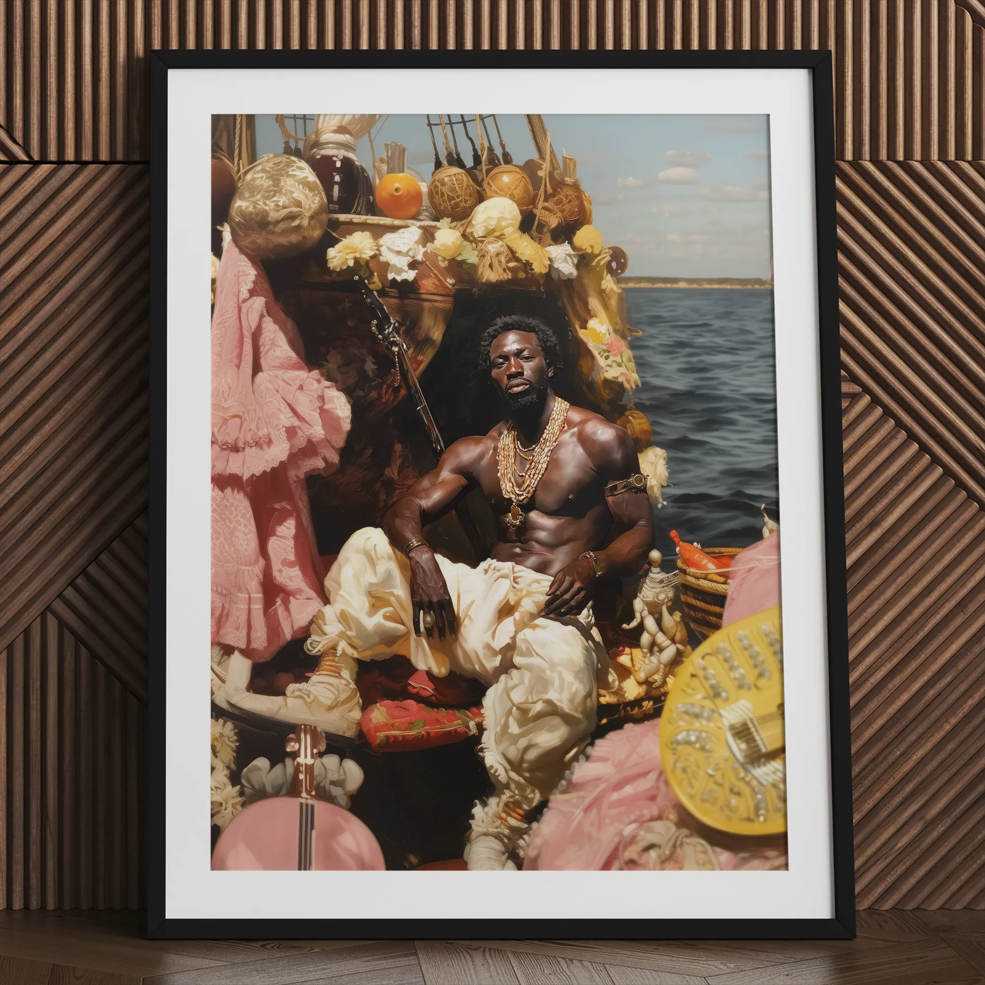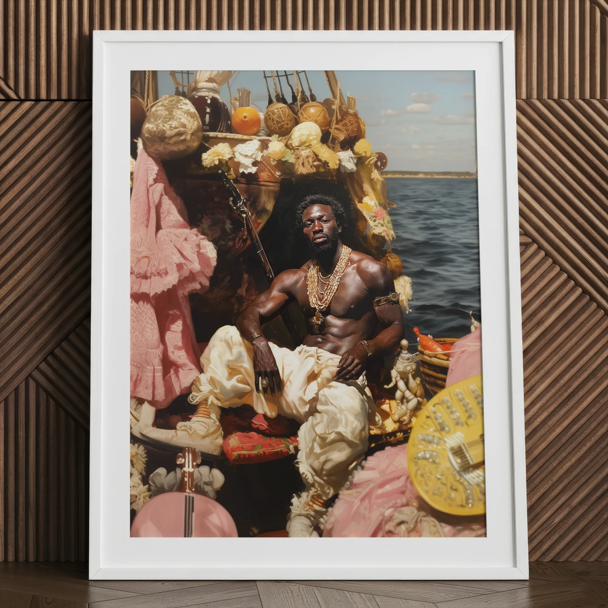 Senti il suo sguardo prima ancora che tu lo veda: Douglas, il pirata gay nero, a mito Fresh fatta, avvolta in seta e catena, al suo corpo una mappa di forza e sopravvivenza. Si siede sul suo trono circondato da una bellezza saccheggiata: frutta dorata e sete drappeggiate, ogni pezzo un frammento del mondo che ha preso per se stesso.