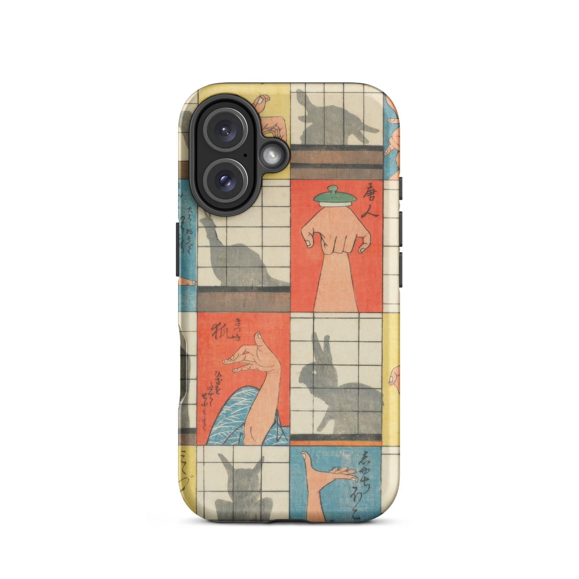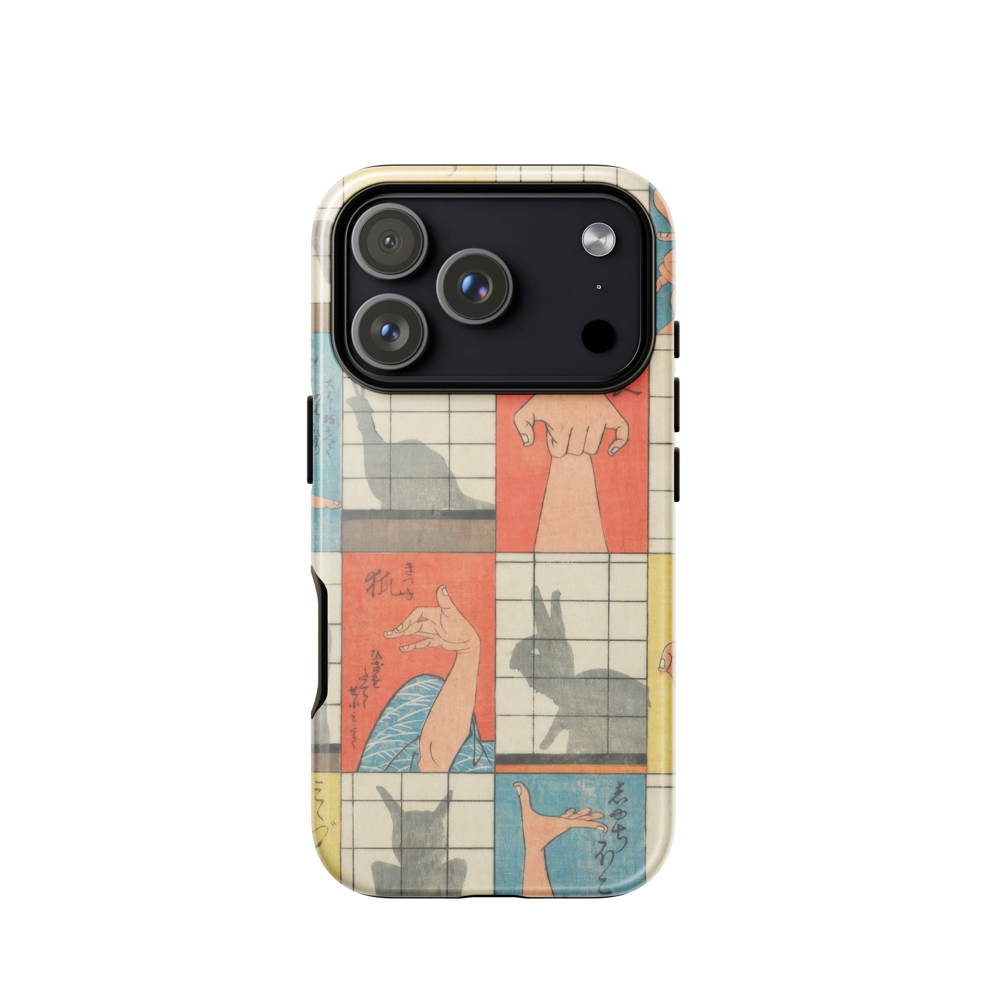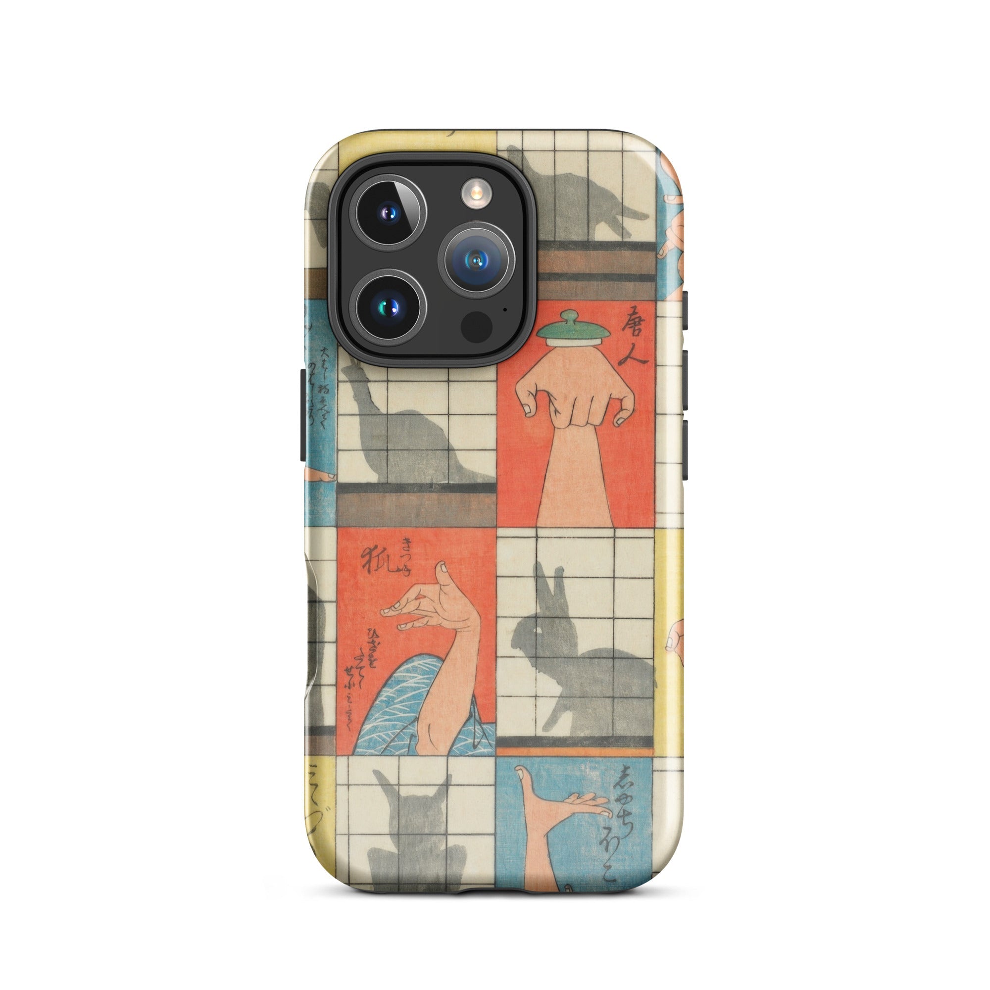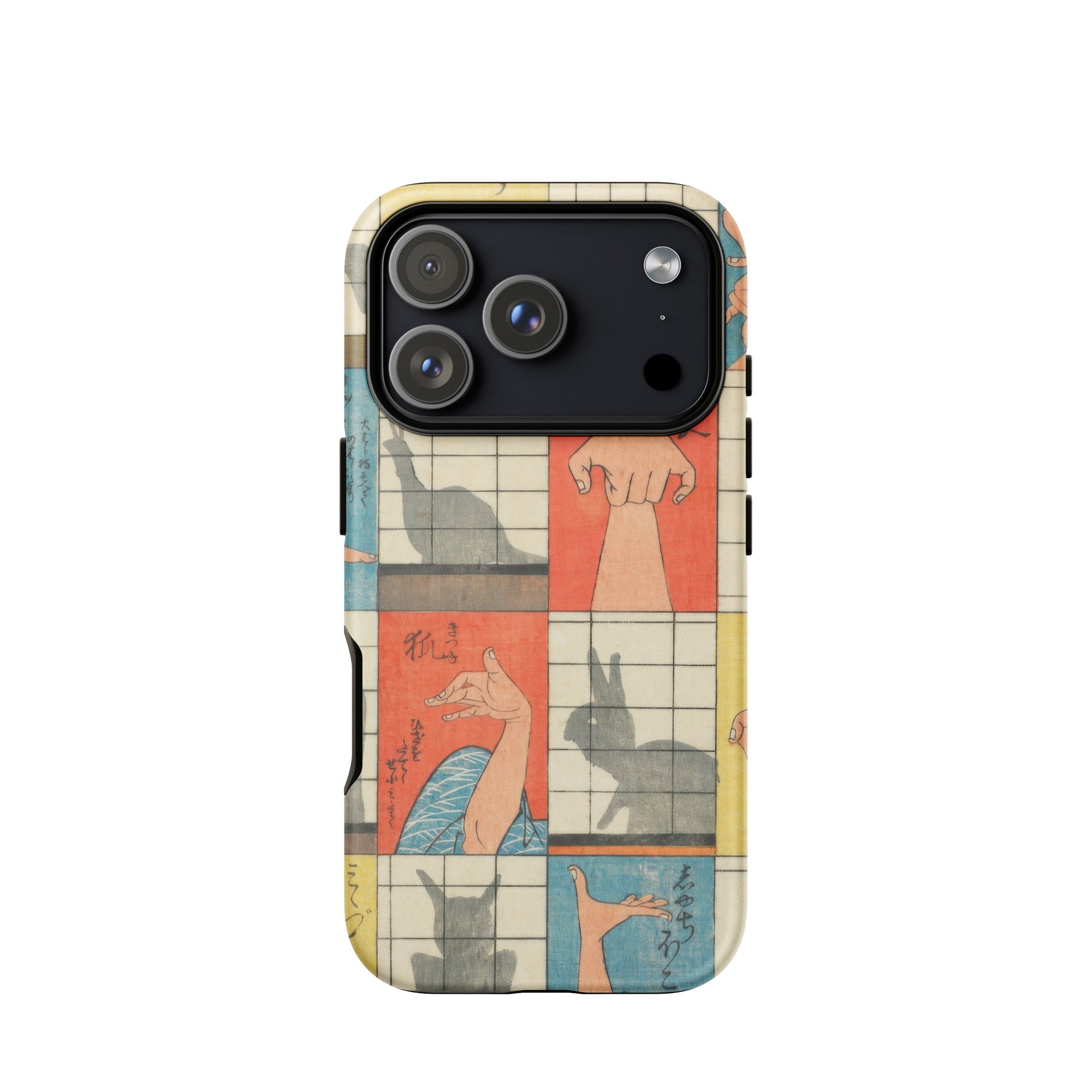 La scrittura giapponese etichetta le bestie evocate—ogni kanji una didascalia per questo gioco del mondo fluttuante di finzione illuminata dalle candele. La custodia del telefono lega la cultura dell'intrattenimento di Tokyo degli anni 1840 al tuo palmo, un documento ukiyo-e dell'arte del kageboshi dove carne e ombra collaborano in un gioco ancestrale.