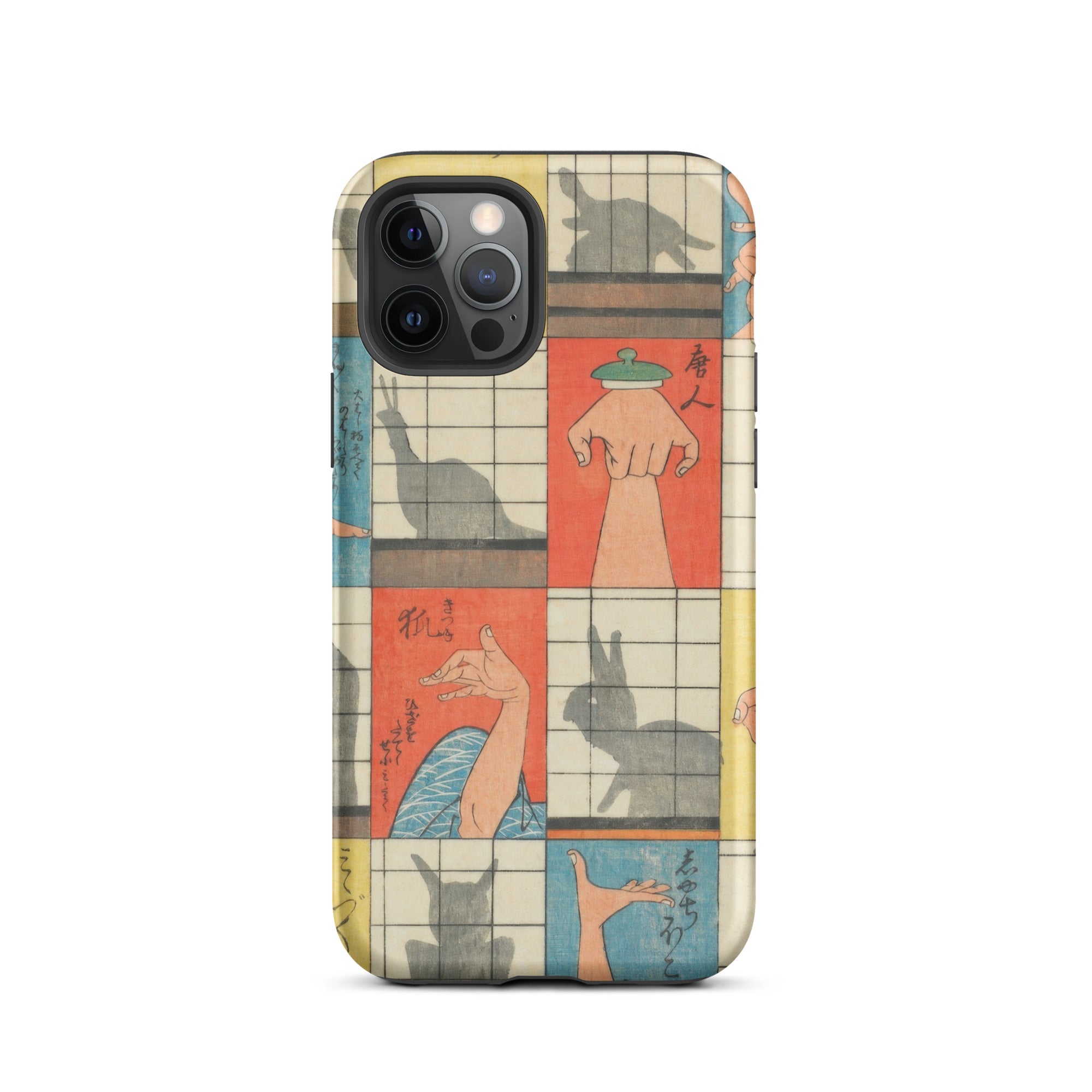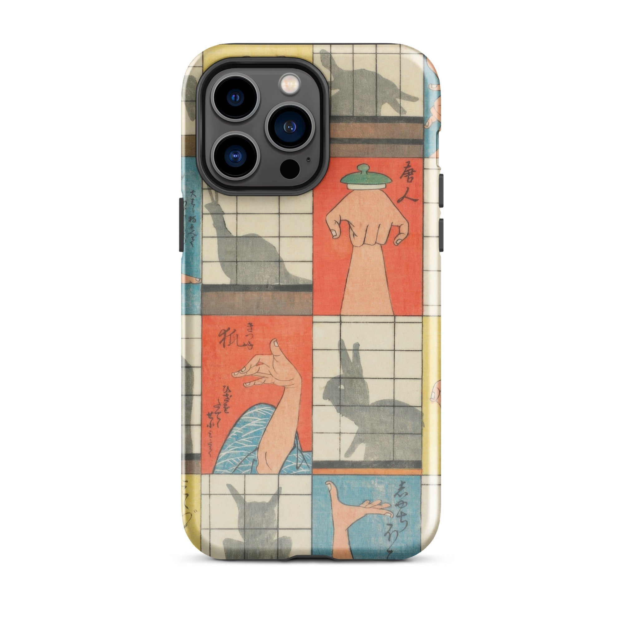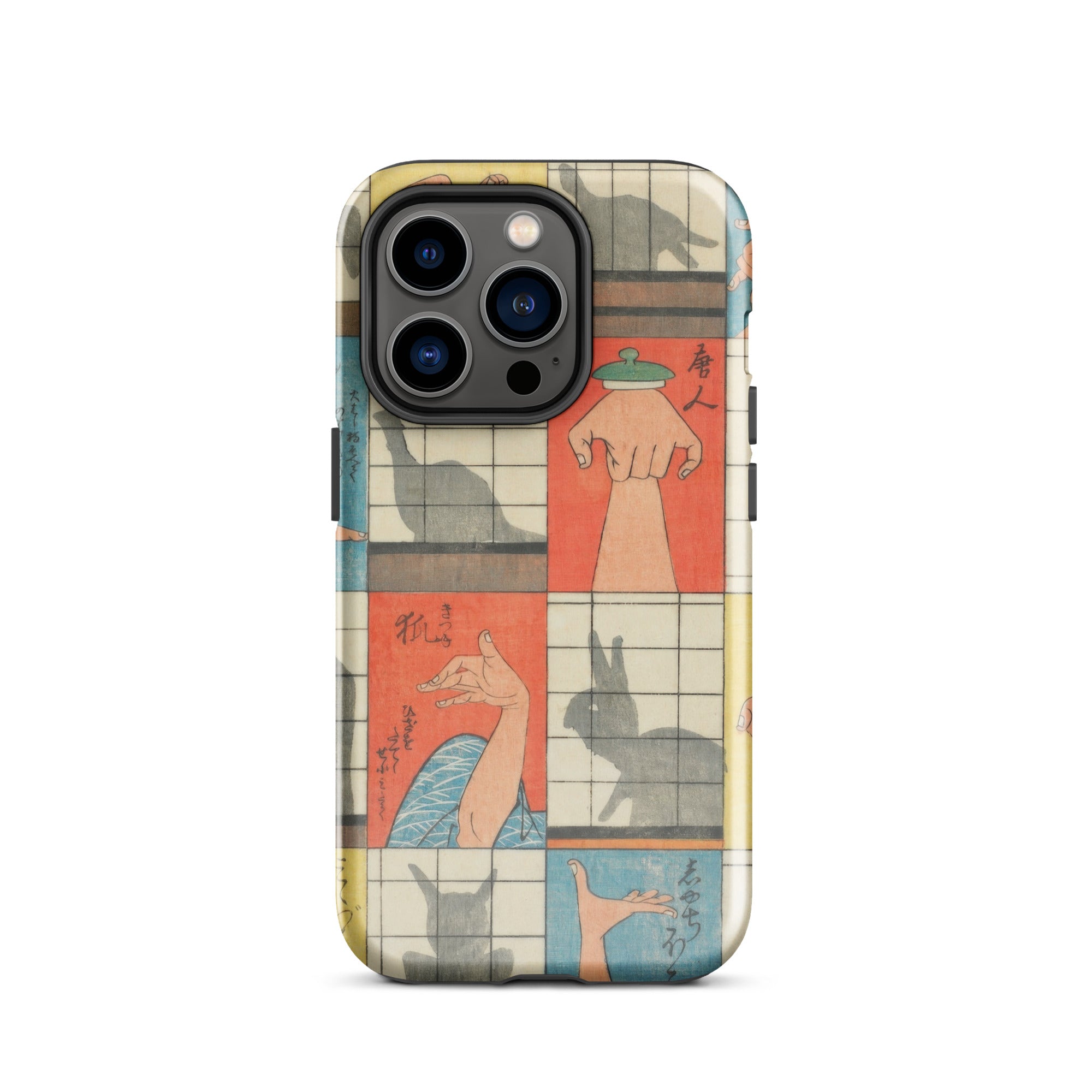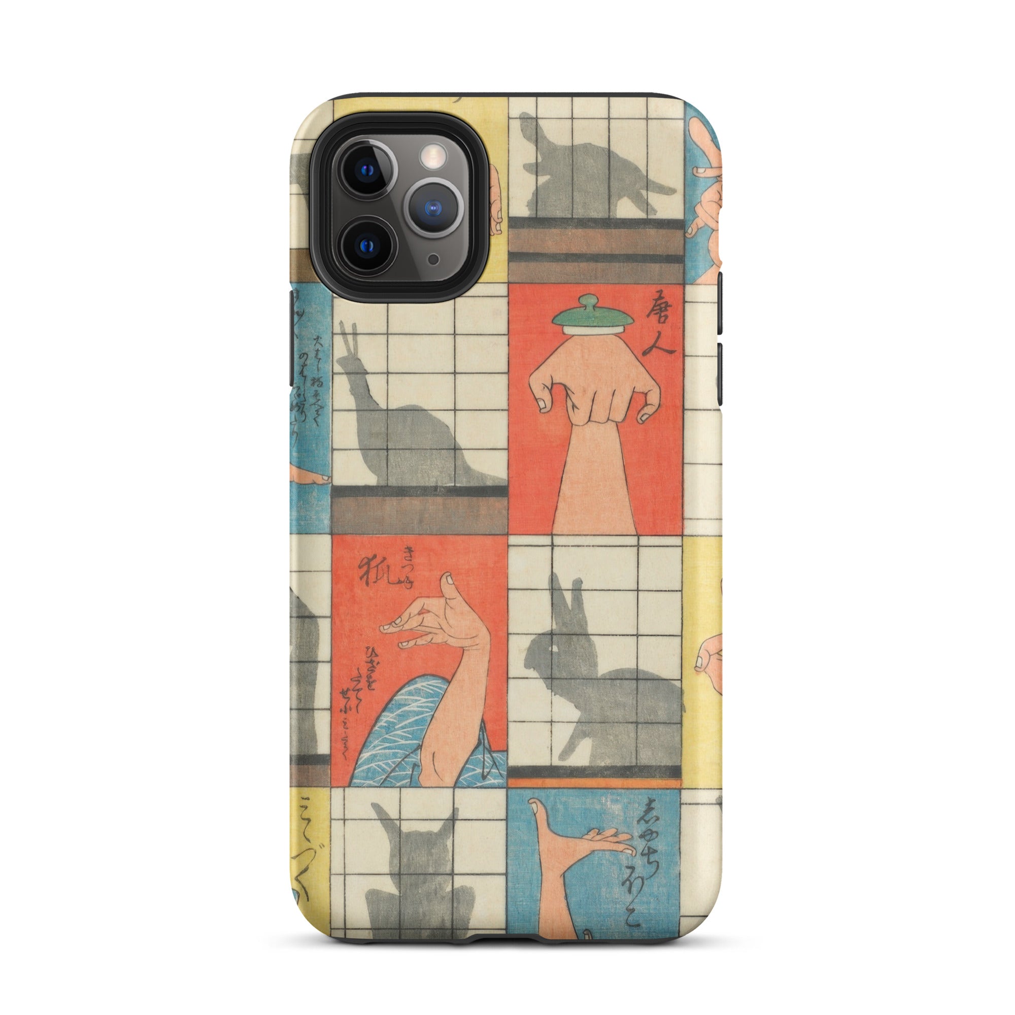 La scrittura giapponese etichetta le bestie evocate—ogni kanji una didascalia per questo gioco del mondo fluttuante di finzione illuminata dalle candele. La custodia del telefono lega la cultura dell'intrattenimento di Tokyo degli anni 1840 al tuo palmo, un documento ukiyo-e dell'arte del kageboshi dove carne e ombra collaborano in un gioco ancestrale.