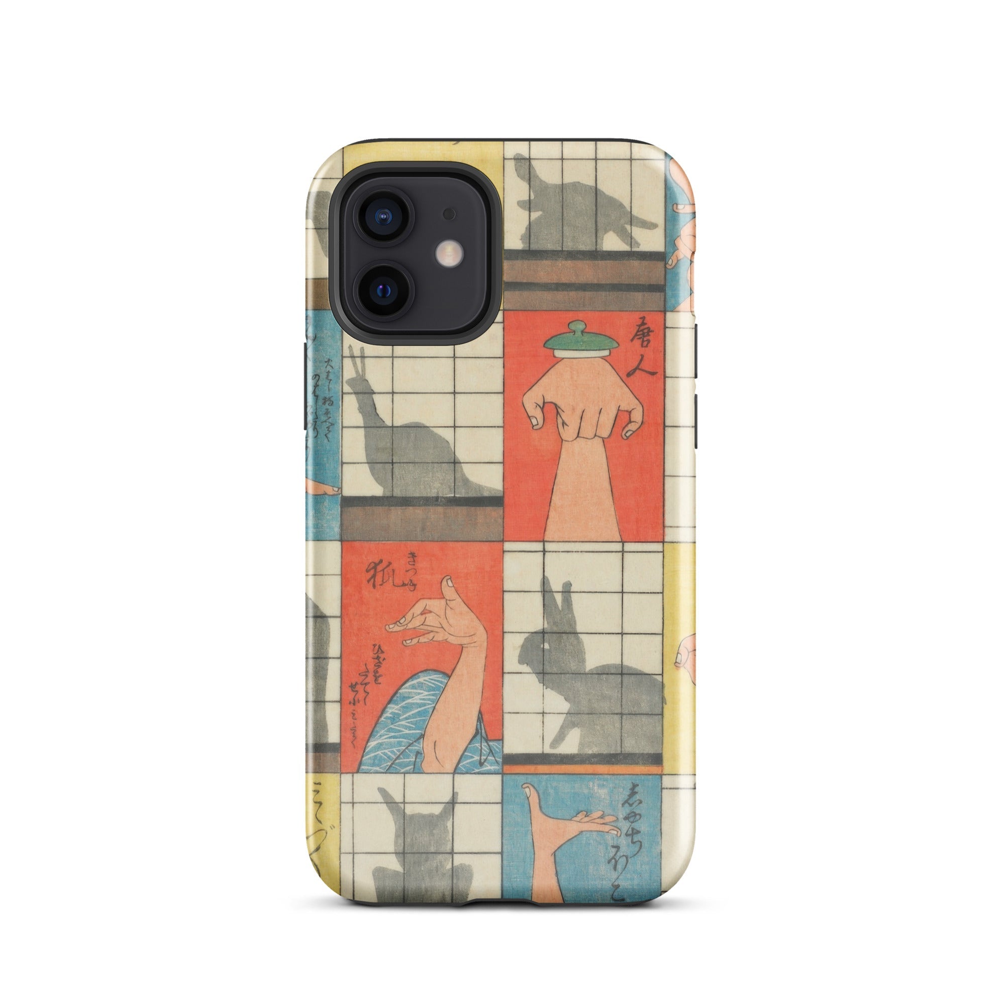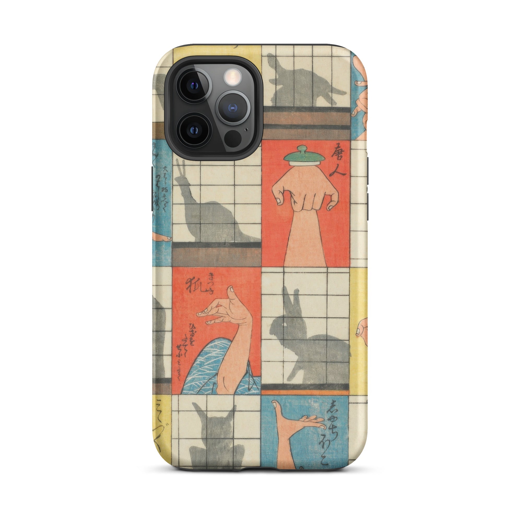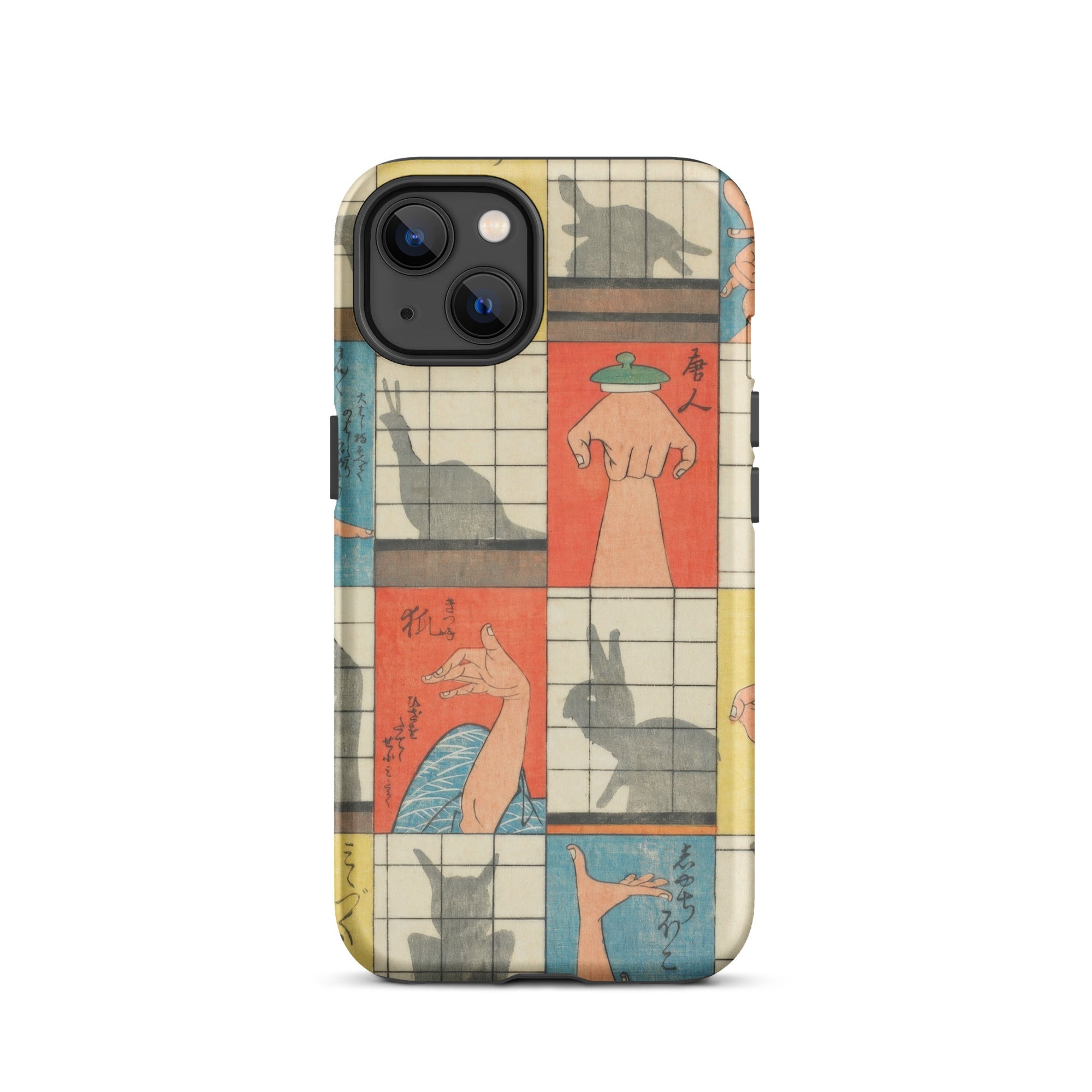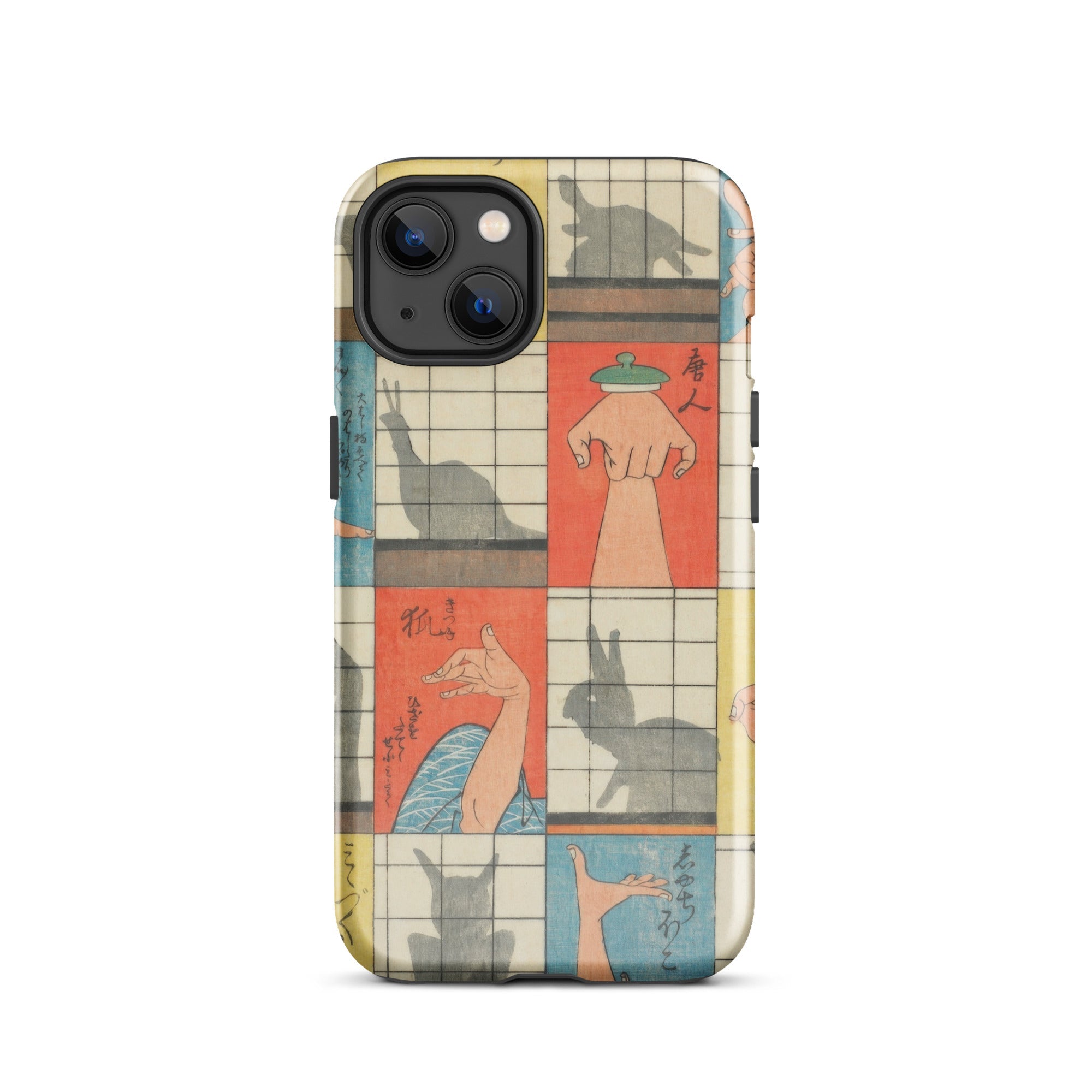 La scrittura giapponese etichetta le bestie evocate—ogni kanji una didascalia per questo gioco del mondo fluttuante di finzione illuminata dalle candele. La custodia del telefono lega la cultura dell'intrattenimento di Tokyo degli anni 1840 al tuo palmo, un documento ukiyo-e dell'arte del kageboshi dove carne e ombra collaborano in un gioco ancestrale.