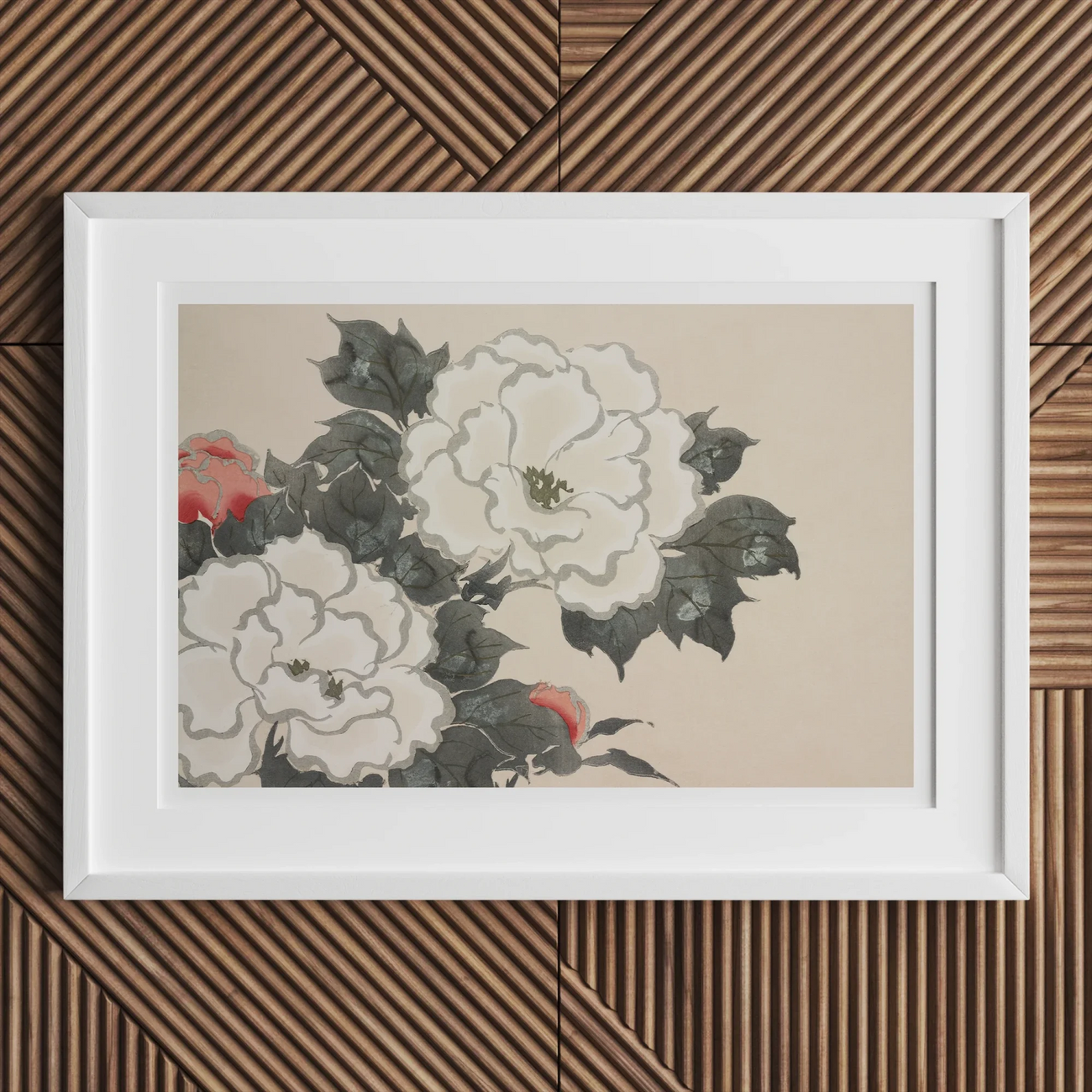 Le peonie bianche luminose si aprono contro una tranquilla tela beige, il loro gossamer delinea intrecciato con fogliame grigio fumoso in una danza botanica affascinante. Un sottile accento di corallo aggiunge profondità, facendo eco al fermento artistico di Meiji-era Giappone.