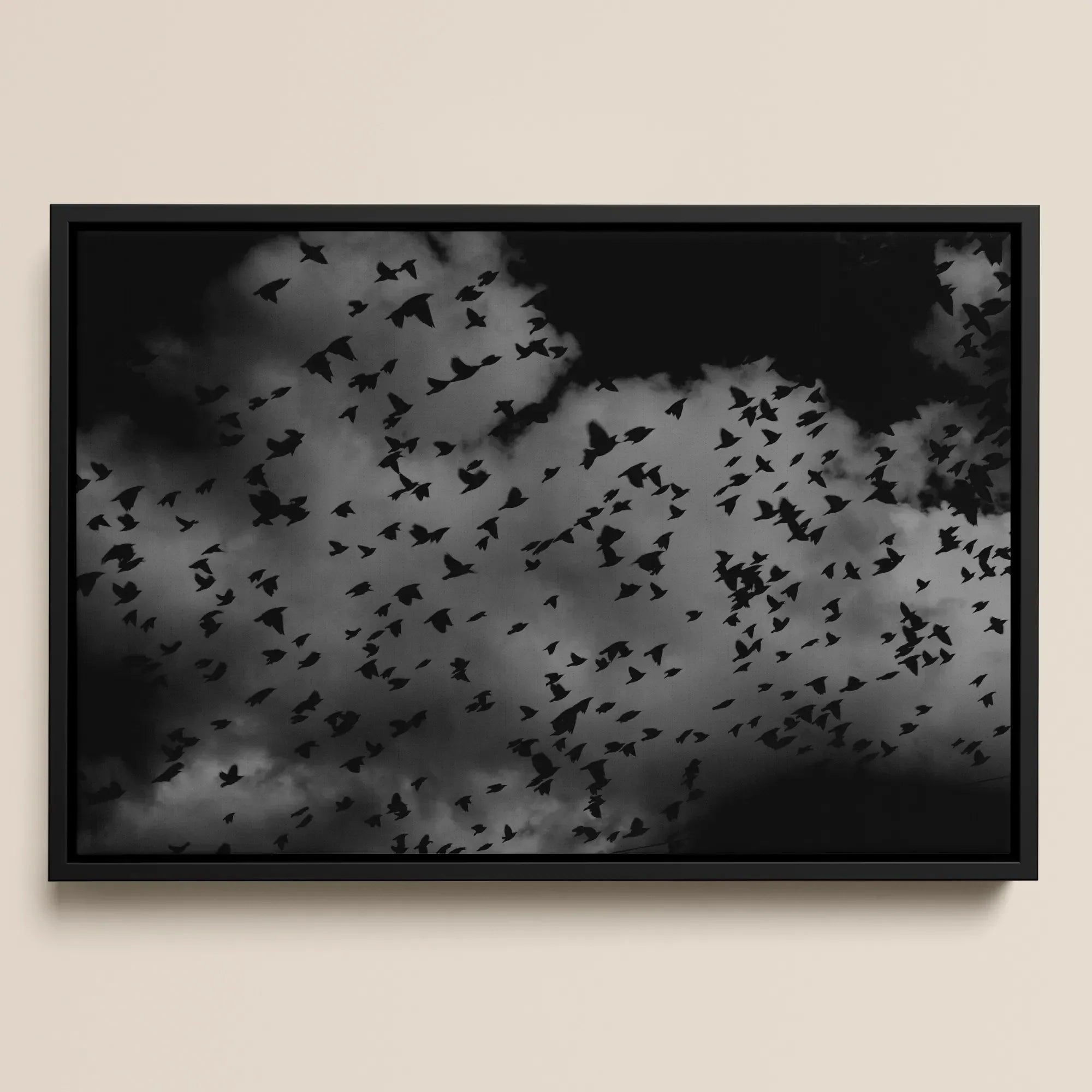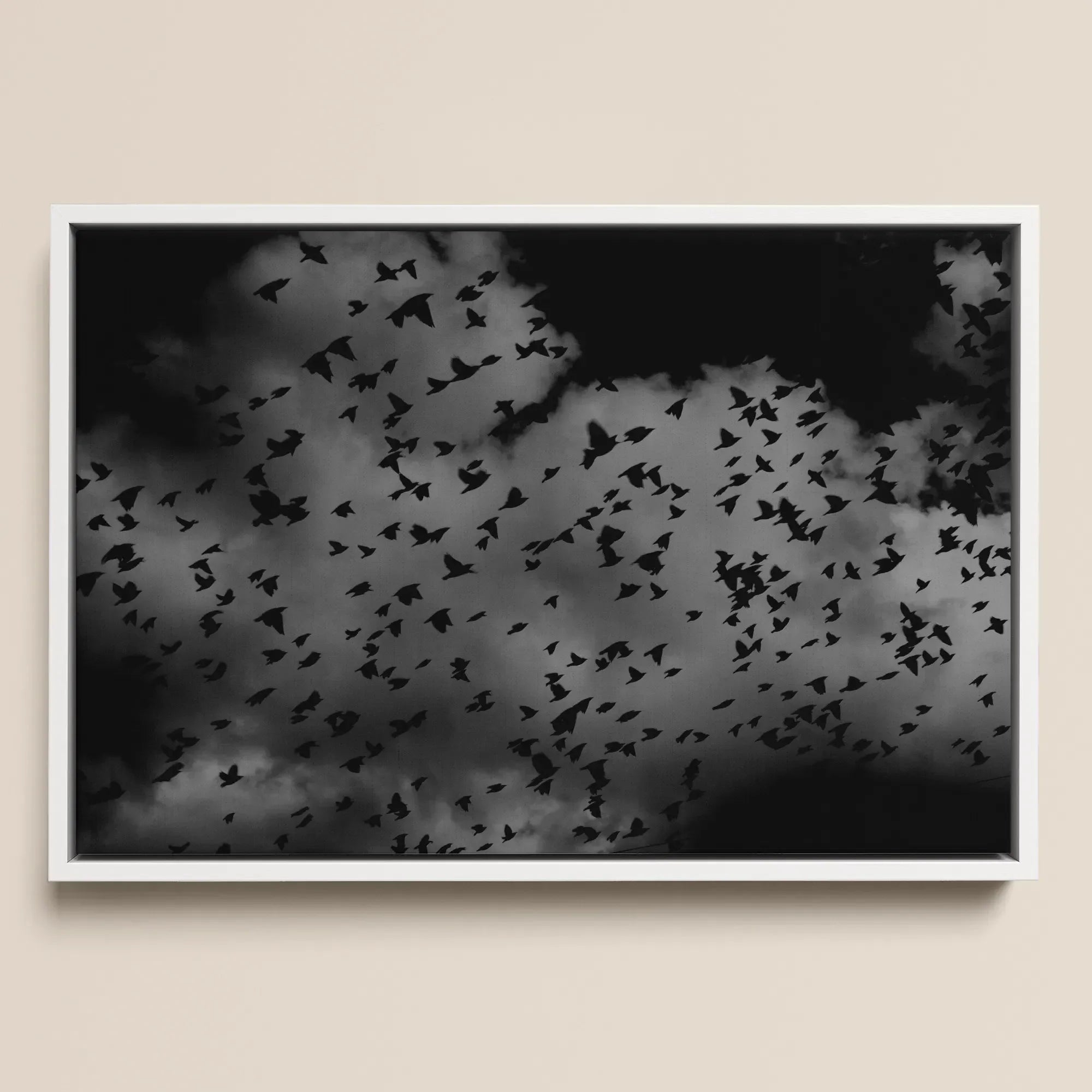 Flock of Birds at Dusk - Black and White Framed Canvas