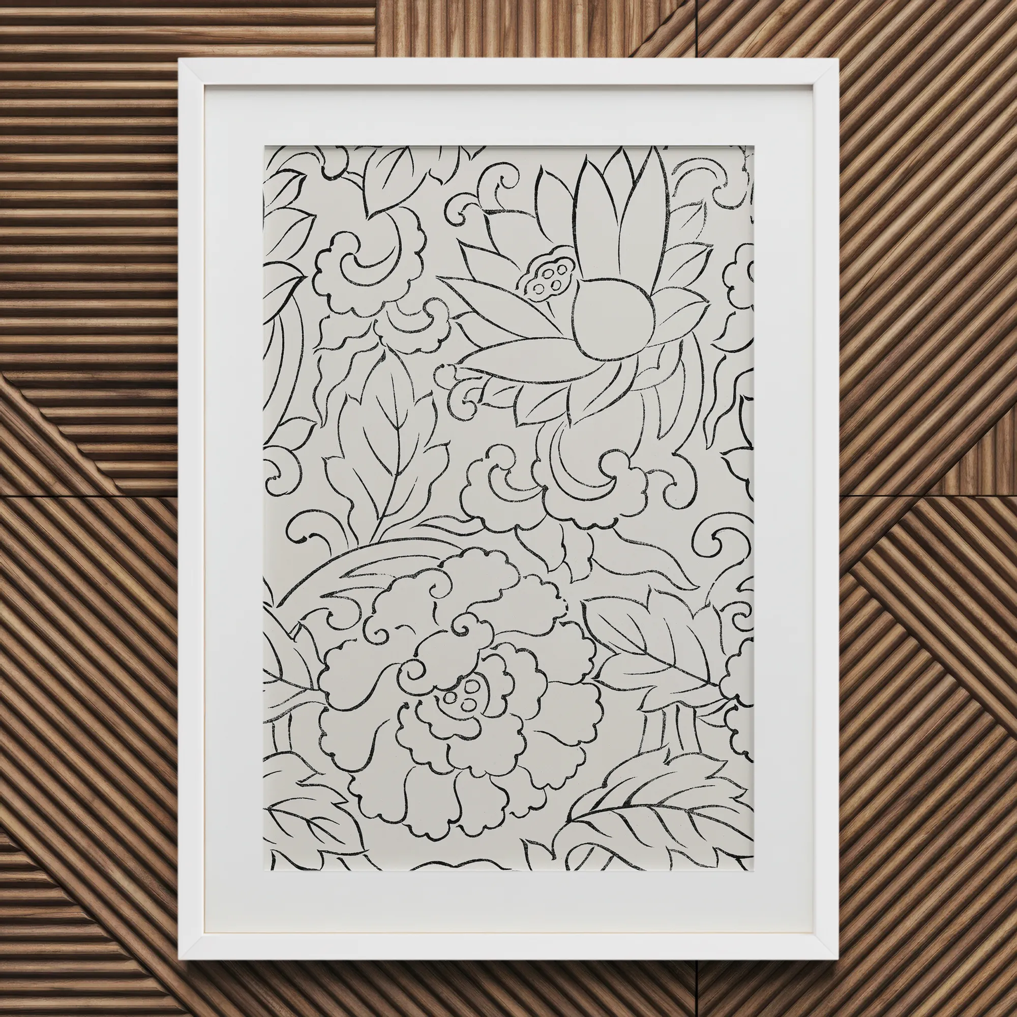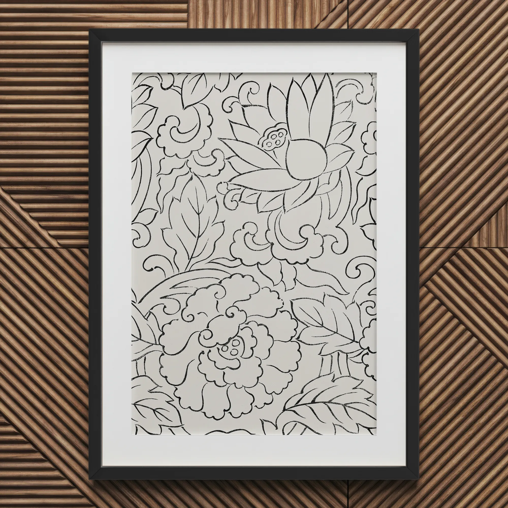 La "stampa giapponese vintage giapponese n. 7" di Taguchi Tomoki incarna la quintessenza dell'estetica edo-period, mostrando un affascinante arazzo di flora in stark monocromatico. Questo squisito stampa d'arte affascina con la sua linea complessa e l'uso magistrale dello spazio negativo.