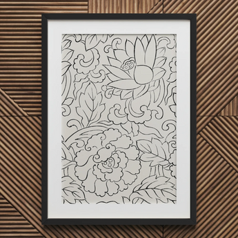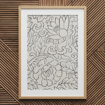 La mano abile di Tomoki intreccia un arazzo di fiori di loto e fogliame ondulato, ogni curva e viticcio a testimonianza della precisione del medium del blocco di legno. La composizione pulsa con la vita, le sue forme organiche che turbinano in una danza che fa eco alla bellezza transitoria della natura così venerata nella cultura giapponese.