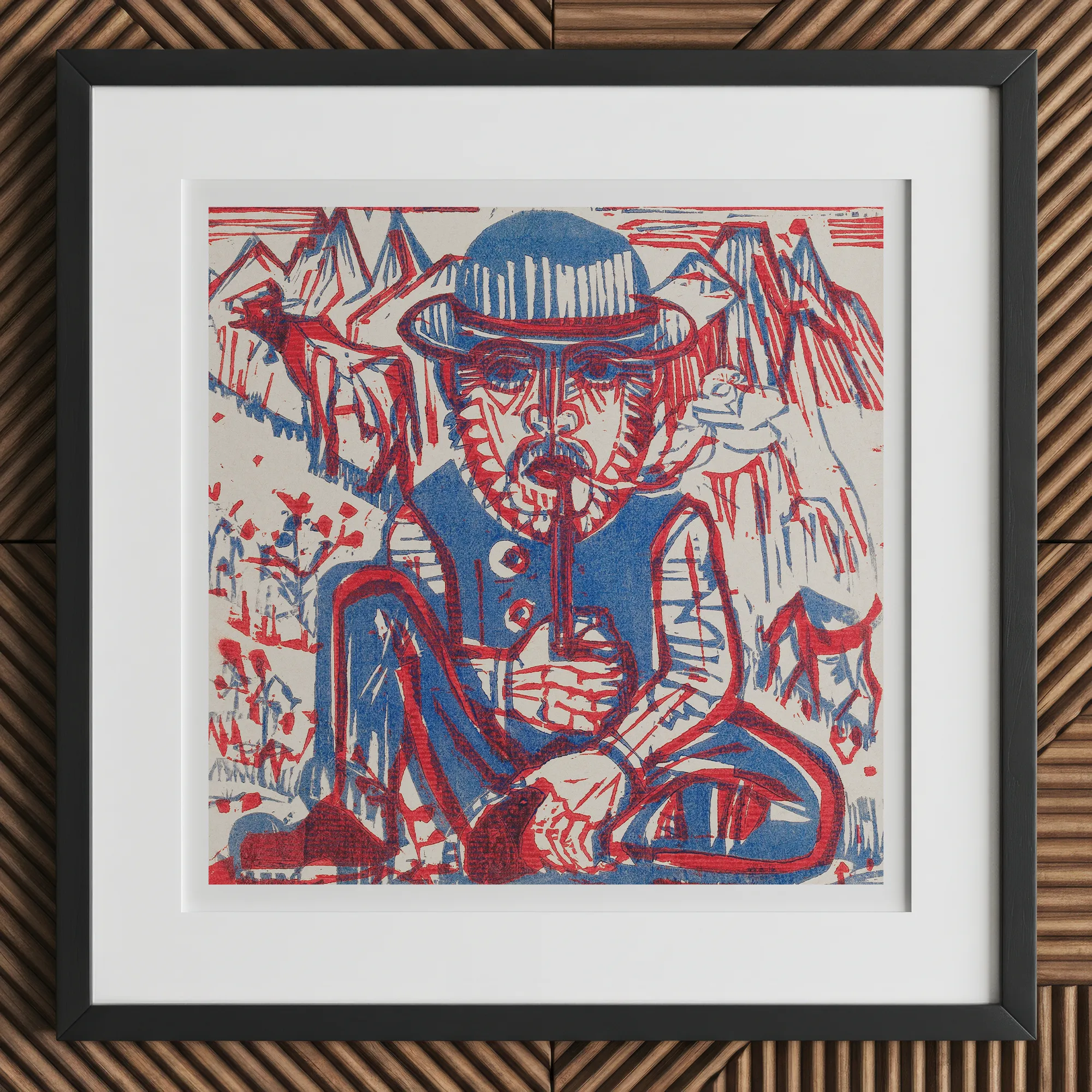 Il volto angolare del soggetto, inciso con i solchi della vita, domina la composizione, la sua pipa un atto di ribellione. Dietro di lui, sagome alpine frastagliate e bordi di Flora Blur Reality astratti. Questa non è la scena pastorale di tua nonna - è un manifesto visivo di tedesco Potere grezzo dell'espressionismo.