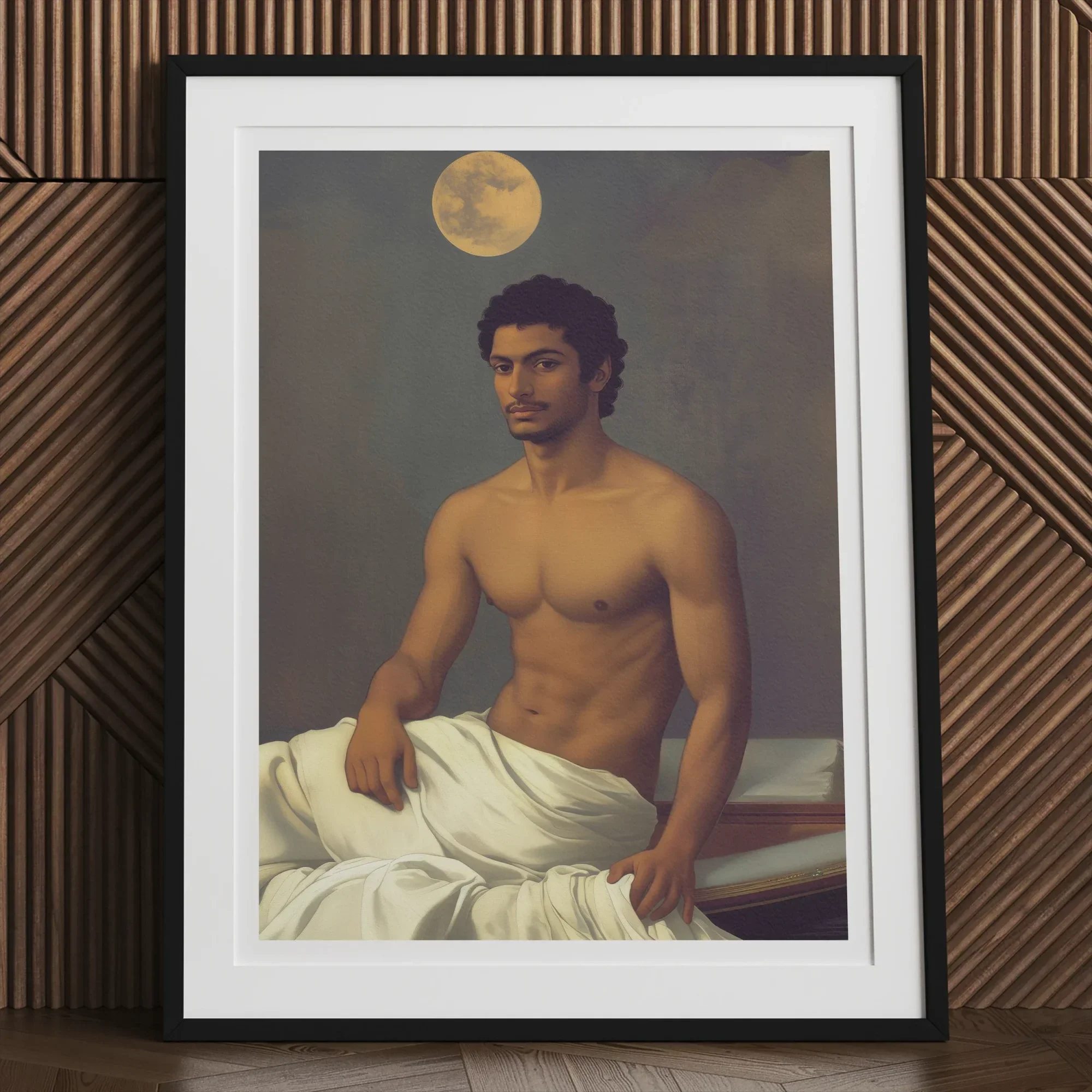 Il desiderio illuminato dalla luna ti fa cenno in un regno di succulenta sensualità. Questo ritratto omoerotico cattura un Rajasthan marinaio, la sua forma muscolare bagnata di luce eterea. I toni della terra caldi accarezzano la sua bellezza vulnerabile, mentre le ombre giocano sul suo petto cesellato. La luna piena sopra i sussurri di desideri proibiti e contemplazione tranquilla.