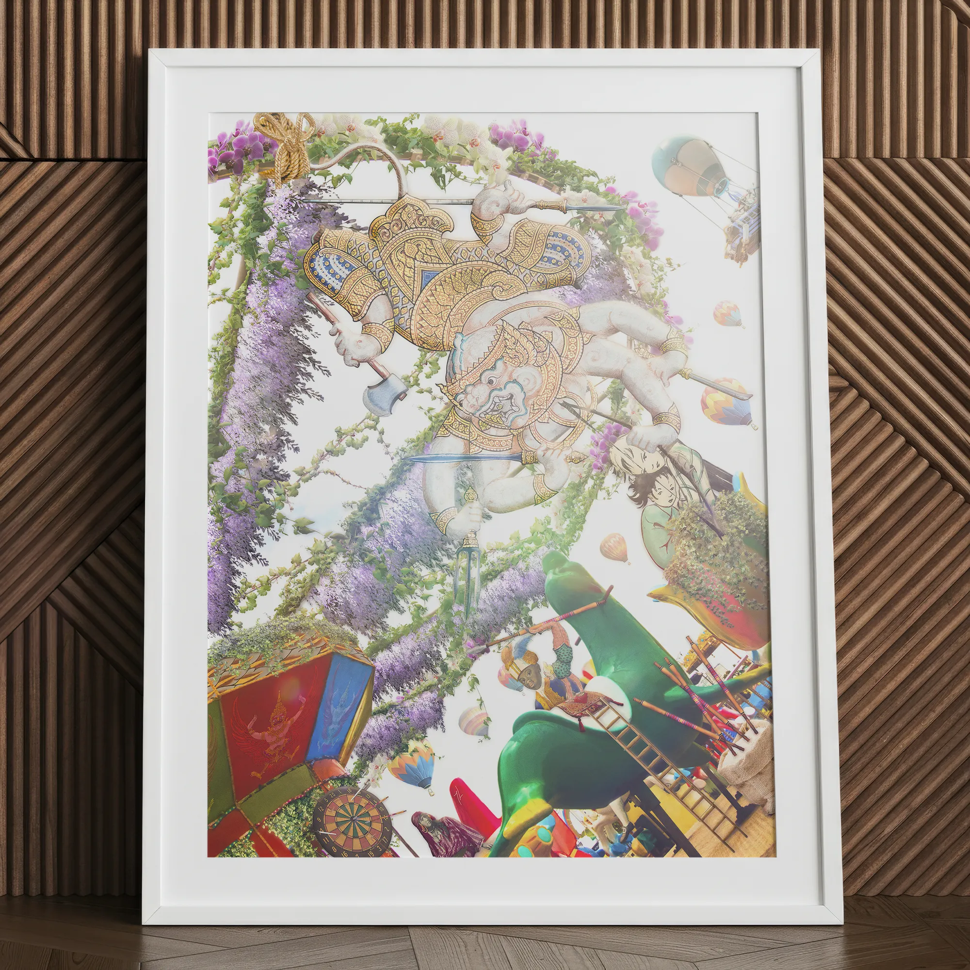 Ecco il re delle scimmie, straordinario shifter, saltando attraverso le divisioni culturali. Da Delhi a Denpasar, la leggenda di Hanuman aumenta. Qui, è reinventato come artista cosmico, destreggiarsi con armi e glicine con uguale aplomb. I suoi occhi brillano di malizia, invitandoti a svelare millenni di mitologia in un unico momento elettrizzante.