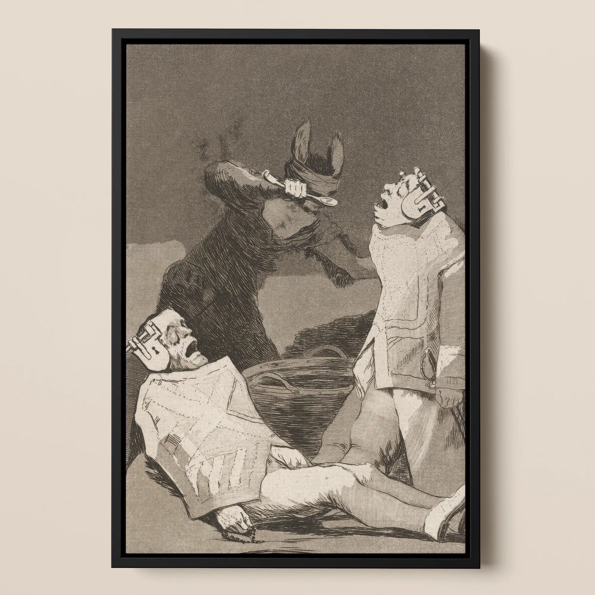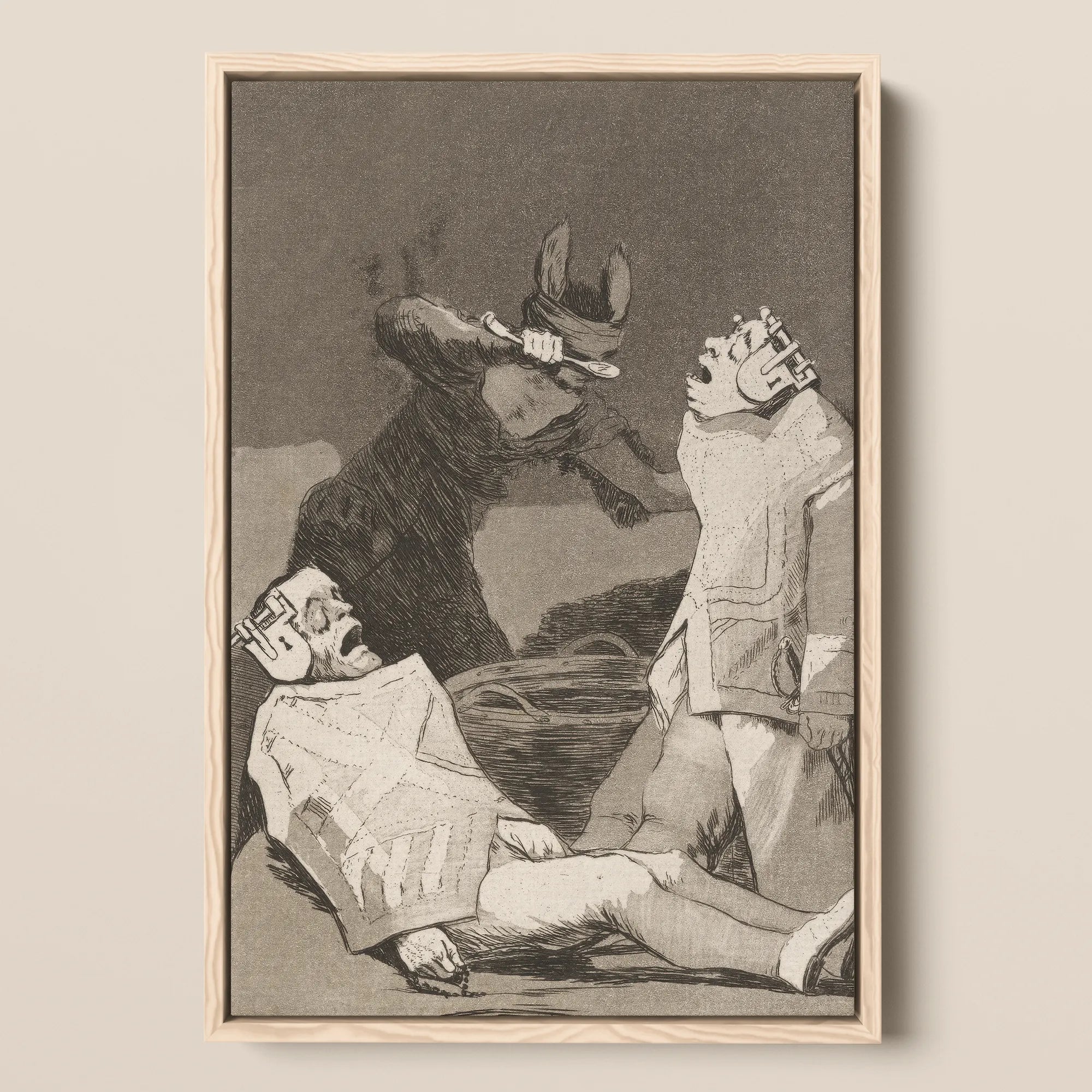 Un pasto grottesco di ignoranza si svolge sotto il peso dell'ombra. Goya incide l'anatomia della sottomissione: due figure avvolte in un'ignoranza imbottita mentre un alimentatore mascherato impone la fede.