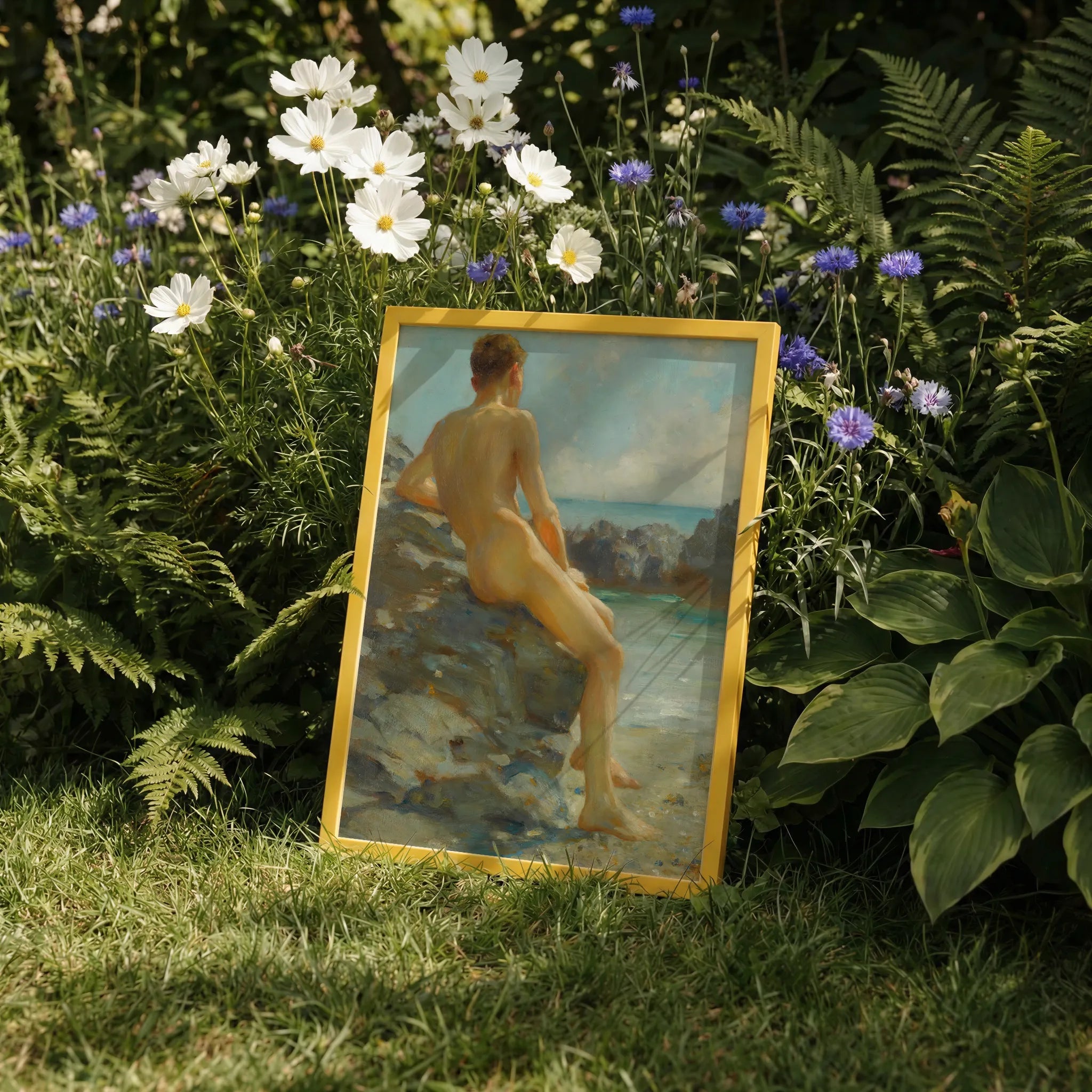 Questa stampa vibra con la devozione del pittore—ogni pennellata è un silenzioso richiamo di delizia pagana, ogni curva del corpo snello del ragazzo è un silenzioso testamento al luccicante silenzio del desiderio e del mare.