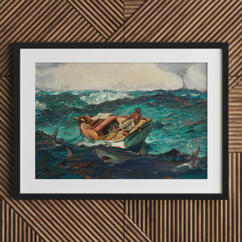 Immergiti nel mondo tumultuoso di "Gulf Stream" di Winslow Homer con questa ipnotizzante stampa d'arte. Sarai trasportato in un maelstrom caraibico dove onde turchesi si scontrano con la resilienza umana. I magistrali colpi di pennello di Homer danno vita a una scena di cruda sopravvivenza - un solitario marinaio nero alla deriva su un'imbarcazione malconcia, circondato da squali minacciosi sotto un minaccioso tromba marina.