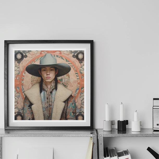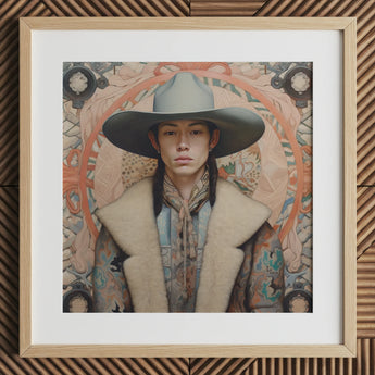 Il West non è mai stato una storia unica. Era mille vite indomate, che si scontravano come zoccoli contro la terra arida, che si spostavano come un incendio su un'area aperta. Ecco Jacy—un cowboy nativo americano gay immortalato in questa stampa d'arte—non come un'eco della storia, ma come una forza che la riscrive.