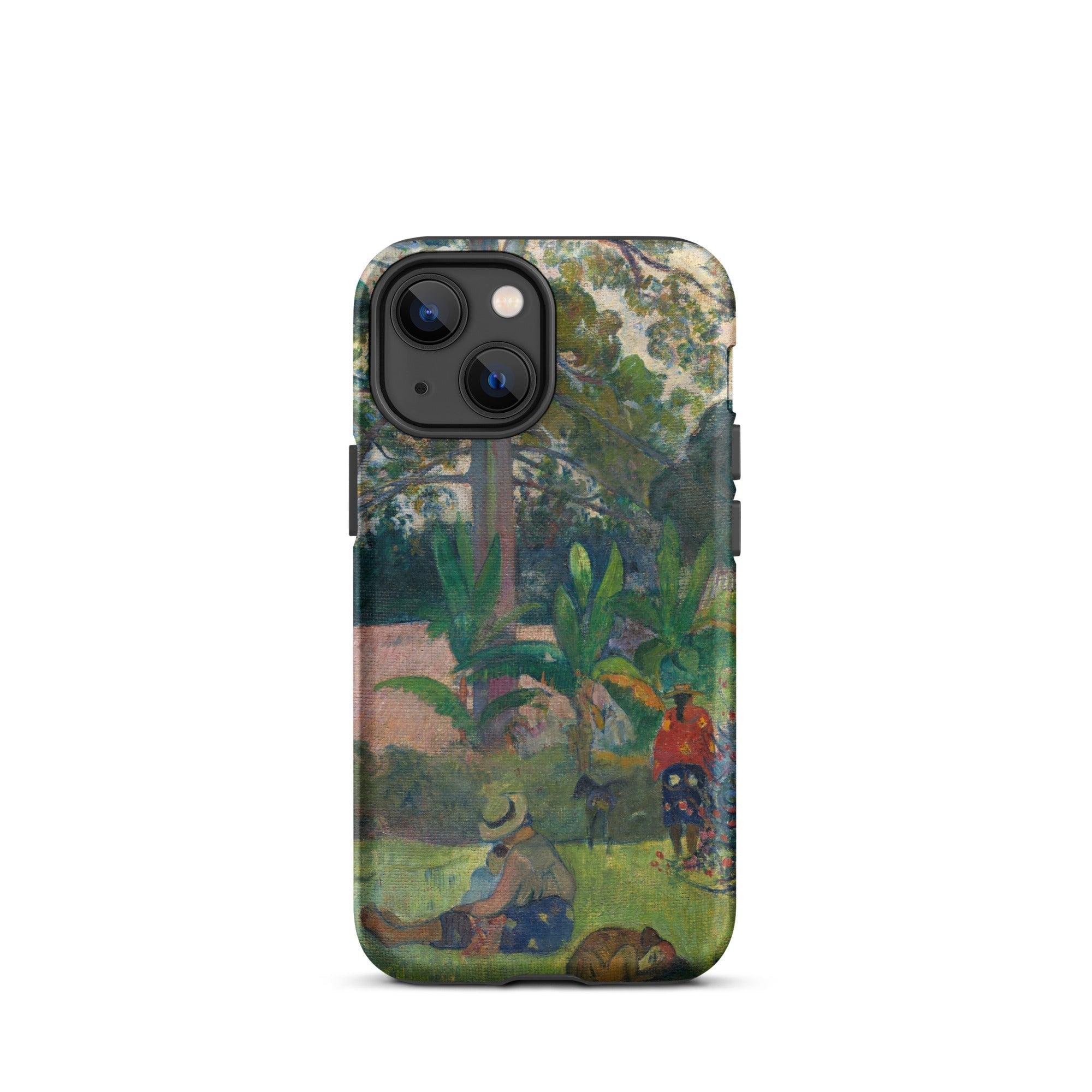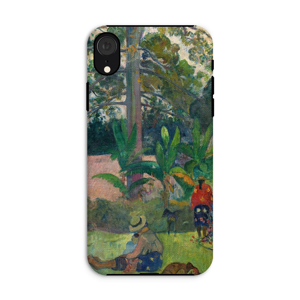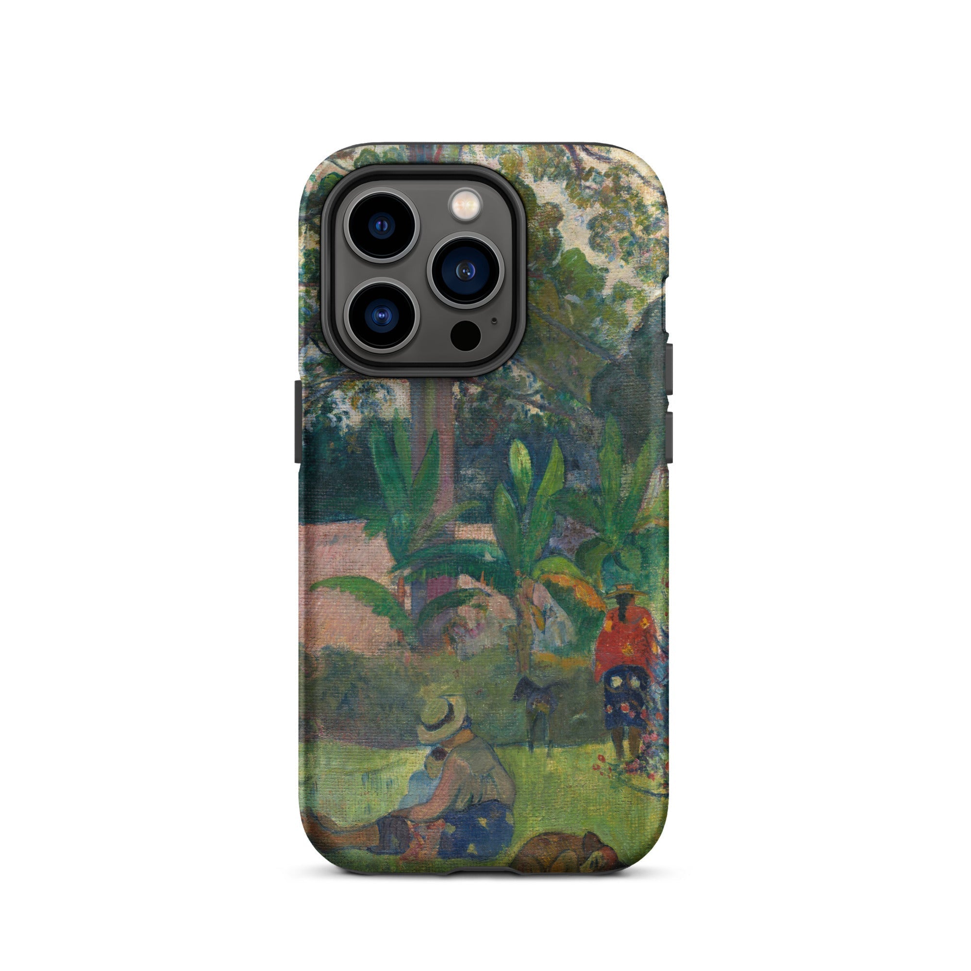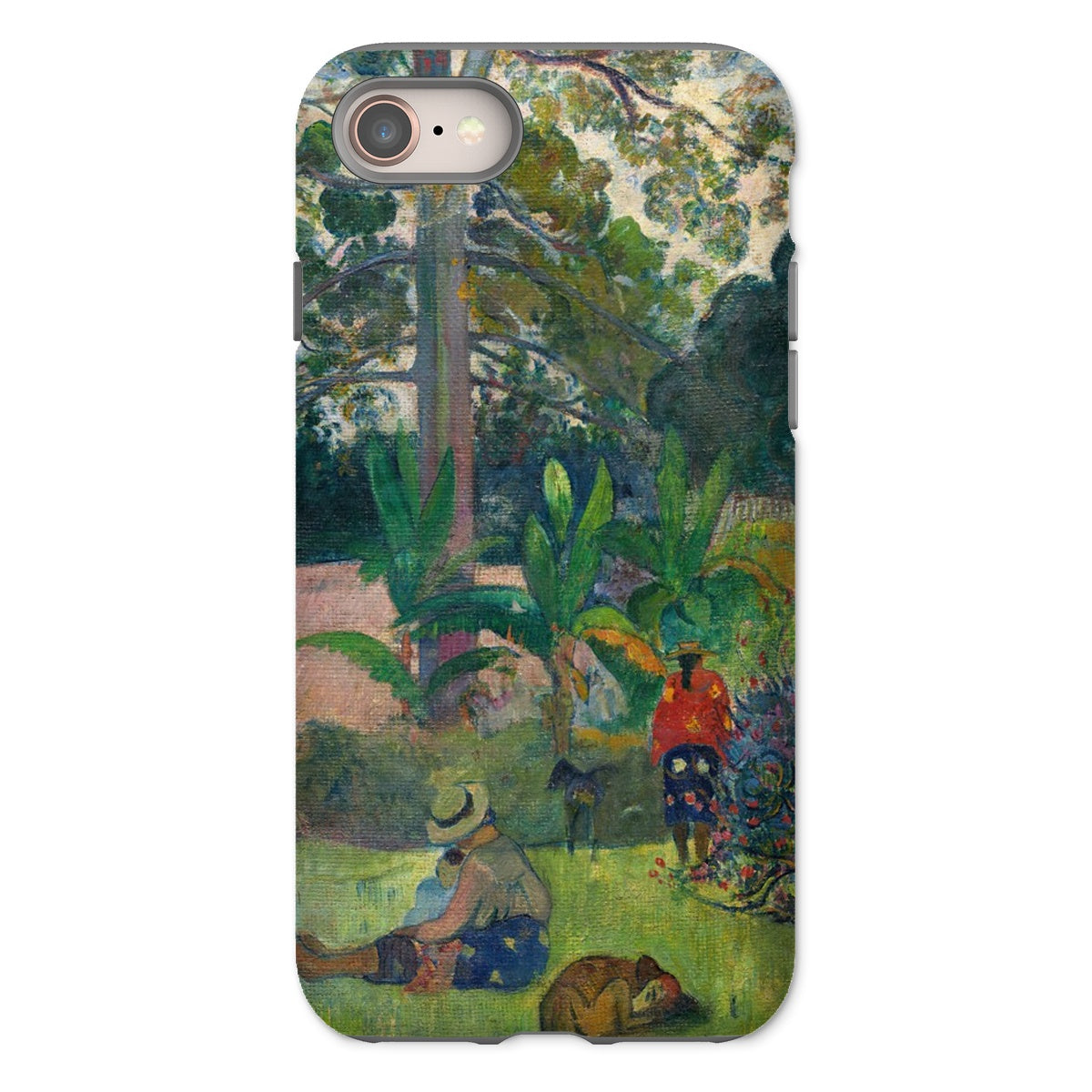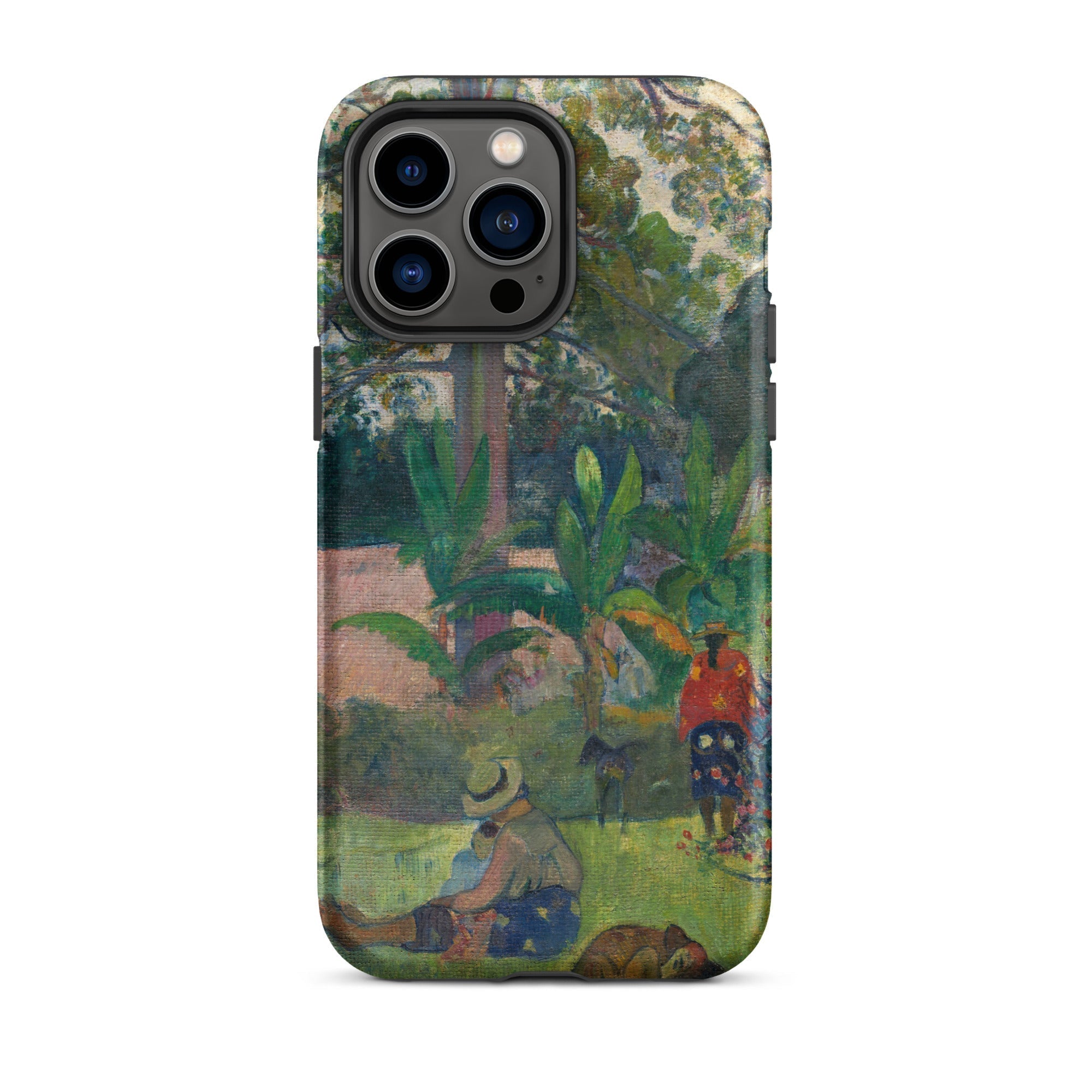 Immergiti nel tahitian Dreamscape di Gauguin con questa custodia per iPhone con "The Big Tree". Sei immediatamente portato a una radura da sole dove la natura regna suprema. Le lussureggianti foglie di banana incorniciano il primo piano, le loro tonalità verdeggianti che saltano su uno sfondo silenzioso. Una figura solitaria in rosso e blu, a malapena distinguibile, aggiunge un tocco umano a questo Eden selvaggio.