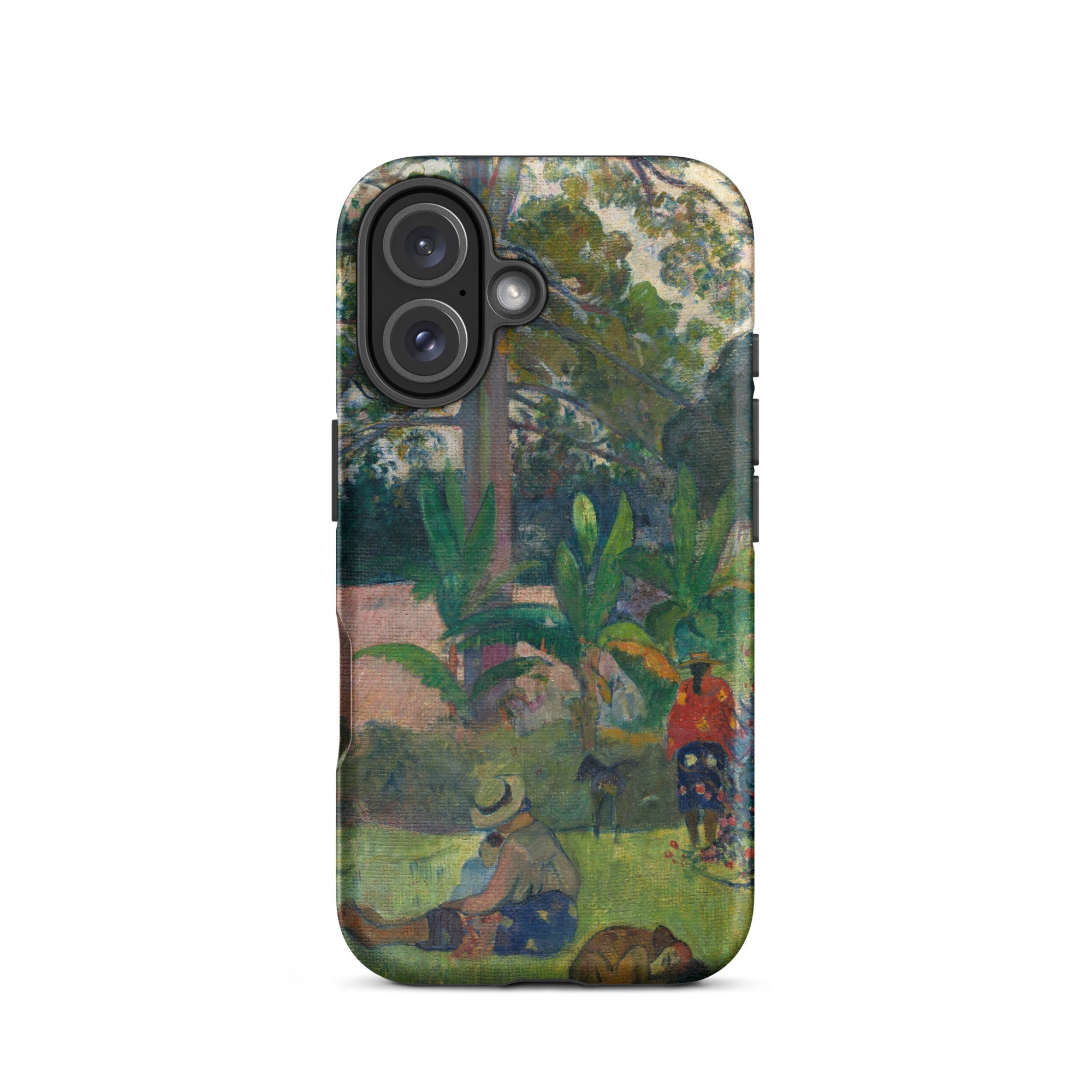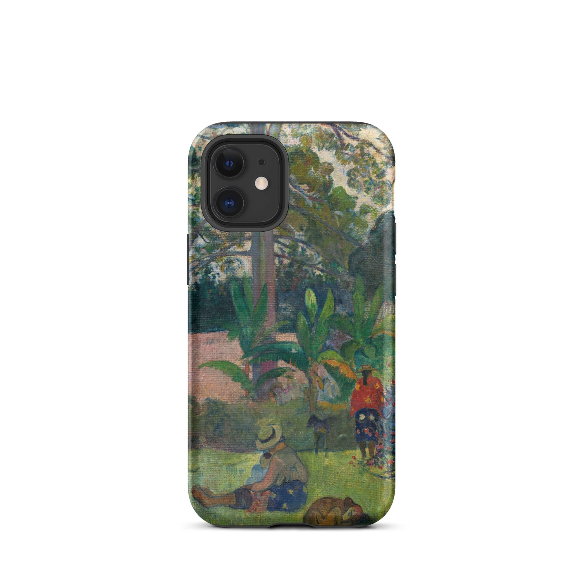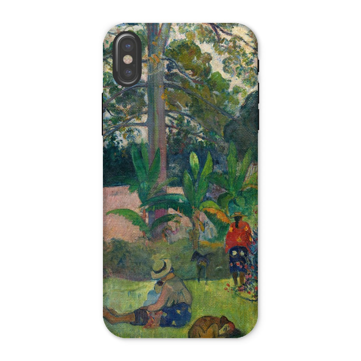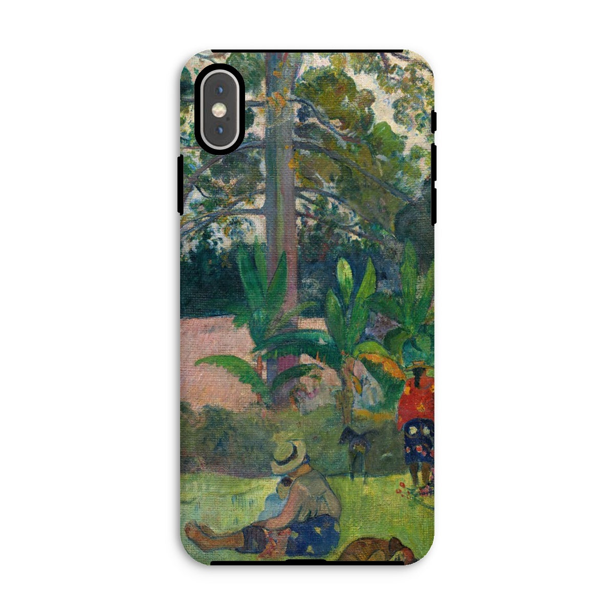 Immergiti nel tahitian Dreamscape di Gauguin con questa custodia per iPhone con "The Big Tree". Sei immediatamente portato a una radura da sole dove la natura regna suprema. Le lussureggianti foglie di banana incorniciano il primo piano, le loro tonalità verdeggianti che saltano su uno sfondo silenzioso. Una figura solitaria in rosso e blu, a malapena distinguibile, aggiunge un tocco umano a questo Eden selvaggio.