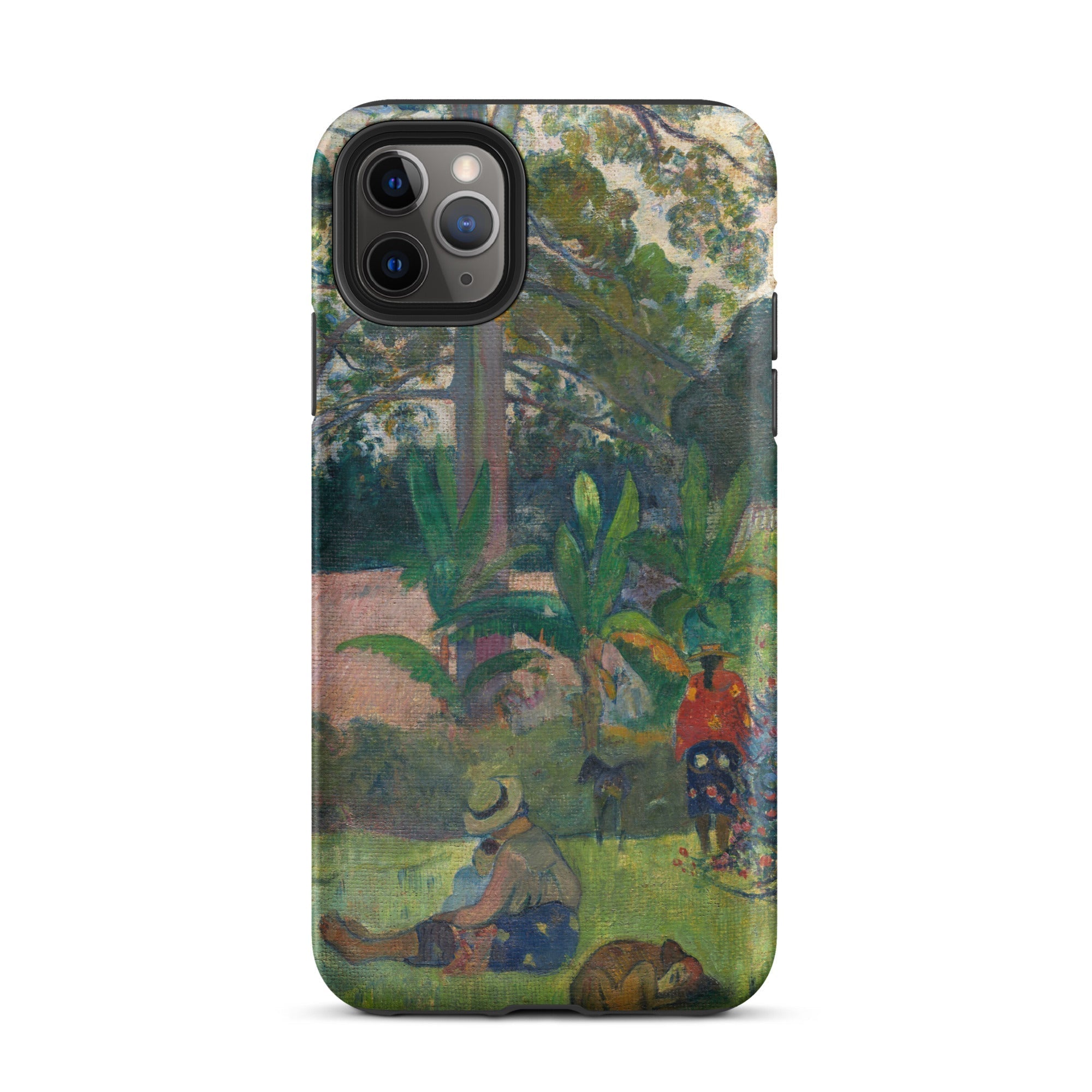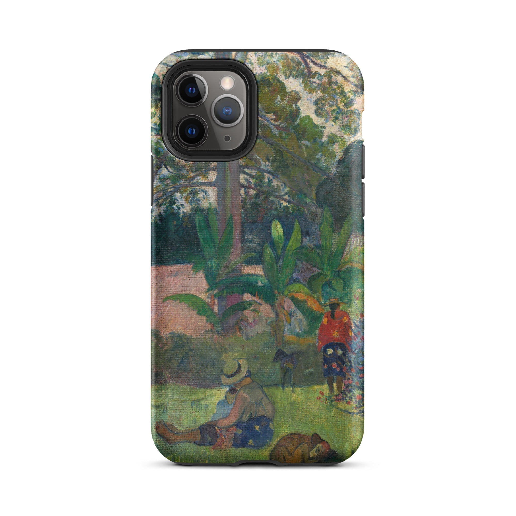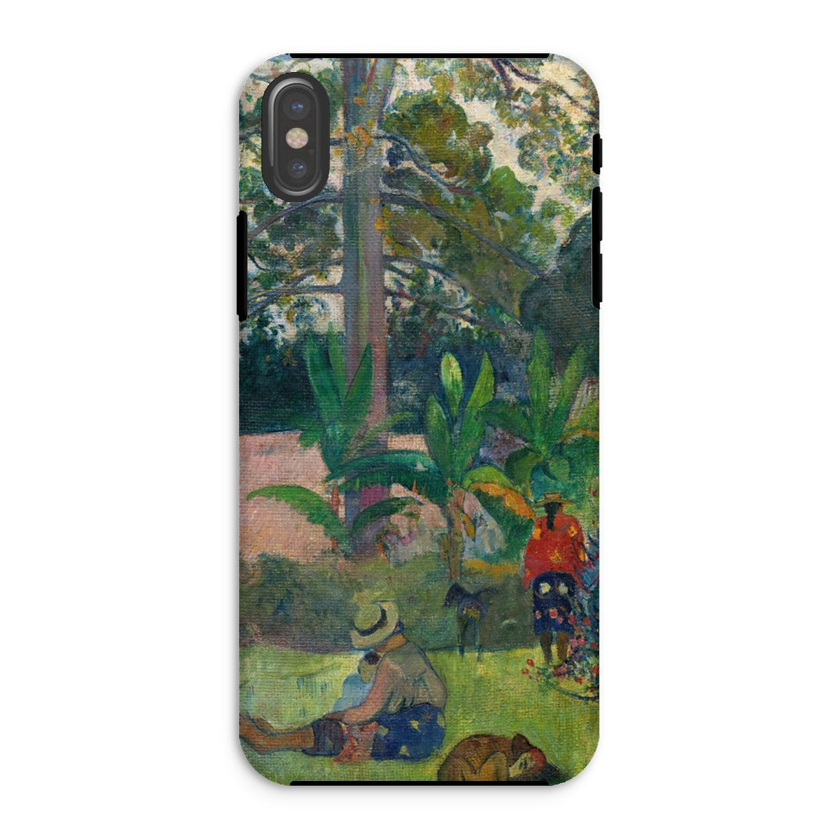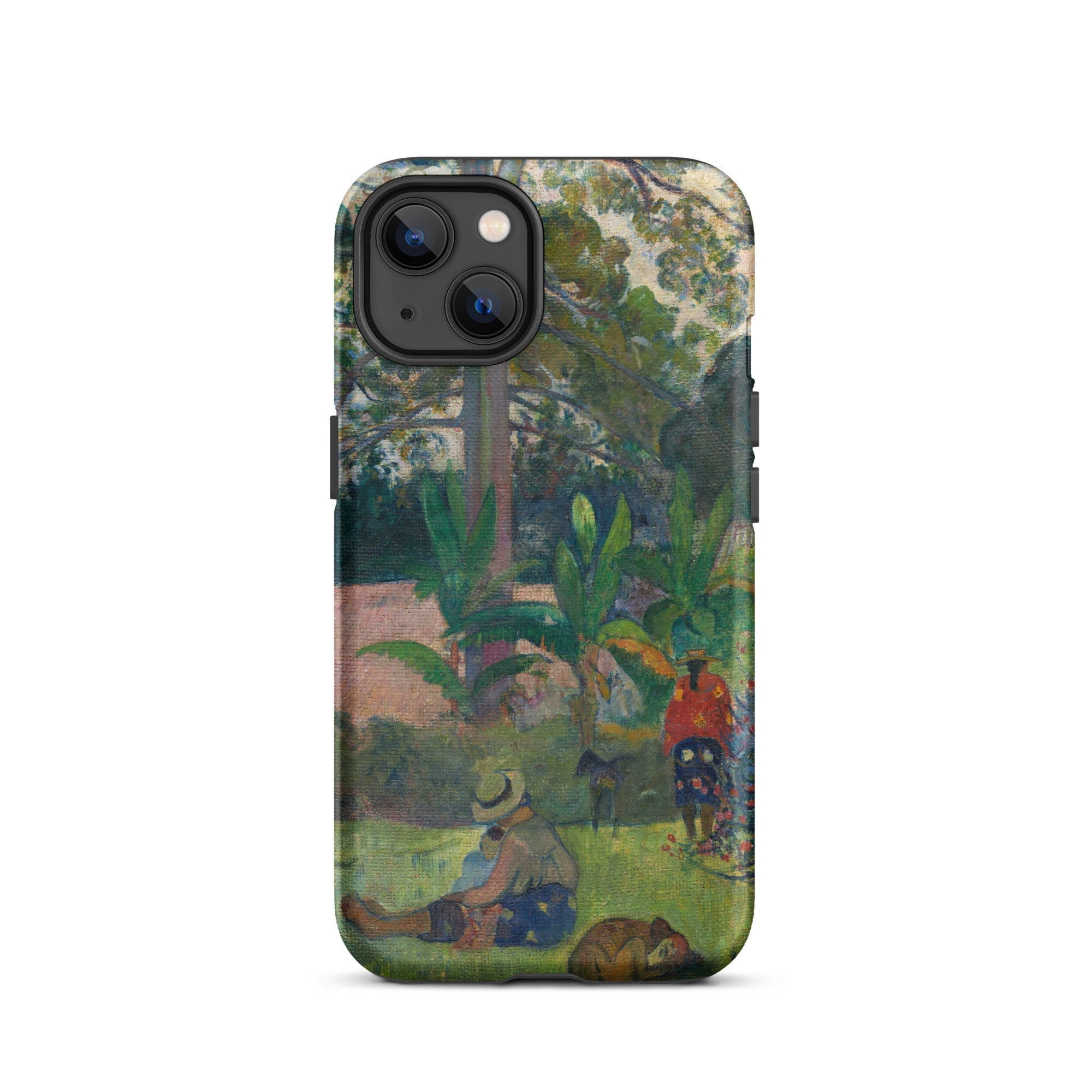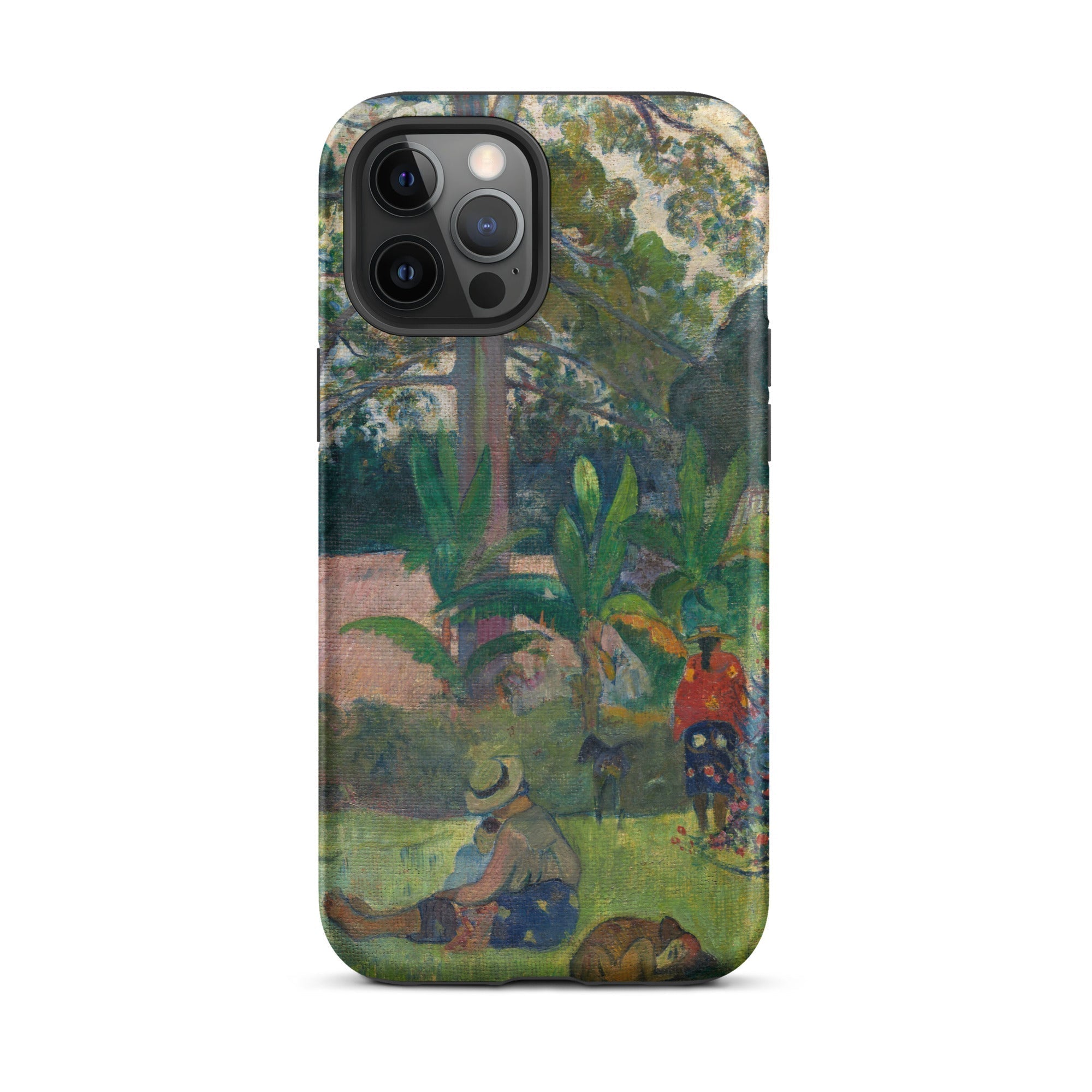 Immergiti nel tahitian Dreamscape di Gauguin con questa custodia per iPhone con "The Big Tree". Sei immediatamente portato a una radura da sole dove la natura regna suprema. Le lussureggianti foglie di banana incorniciano il primo piano, le loro tonalità verdeggianti che saltano su uno sfondo silenzioso. Una figura solitaria in rosso e blu, a malapena distinguibile, aggiunge un tocco umano a questo Eden selvaggio.