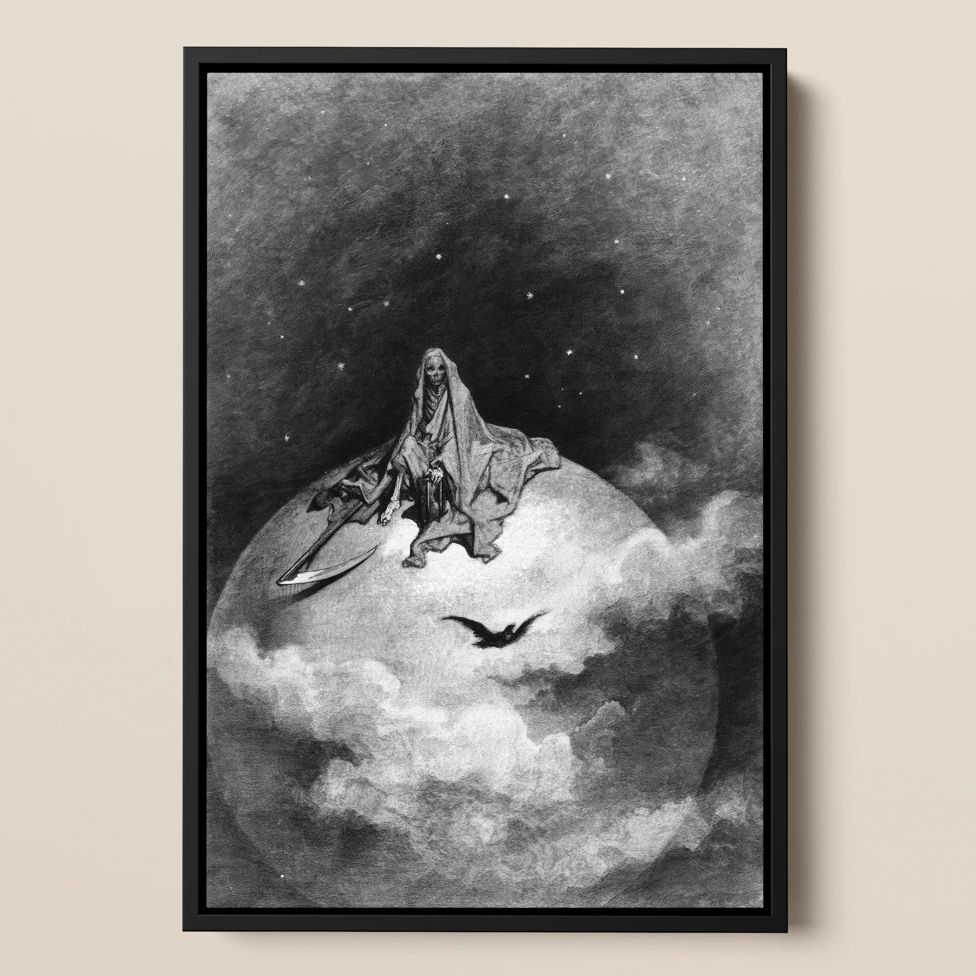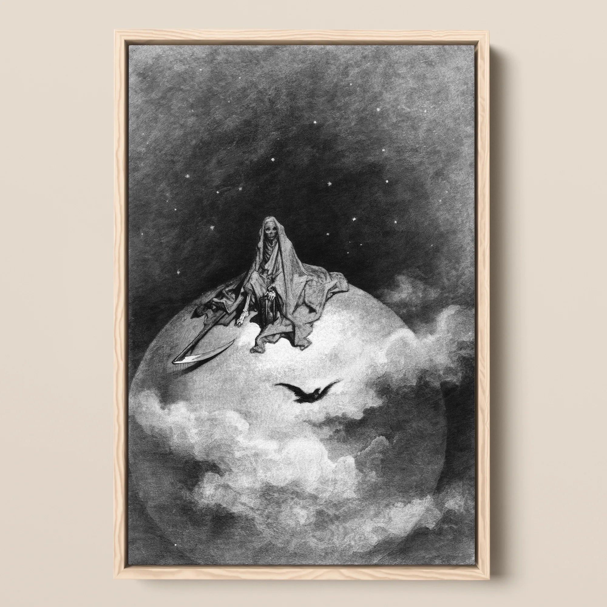 Egli sta a cavalcioni del buio rotante, un monarca dell'estinzione. La falce brilla, tracciata attraverso nuvole e scie di comete, disegnando la circonferenza della nostra fine. Doré incide l'annientamento come architettura: ossa che riecheggiano colonne di marmo, costellazioni deformate in costole di cattedrale.