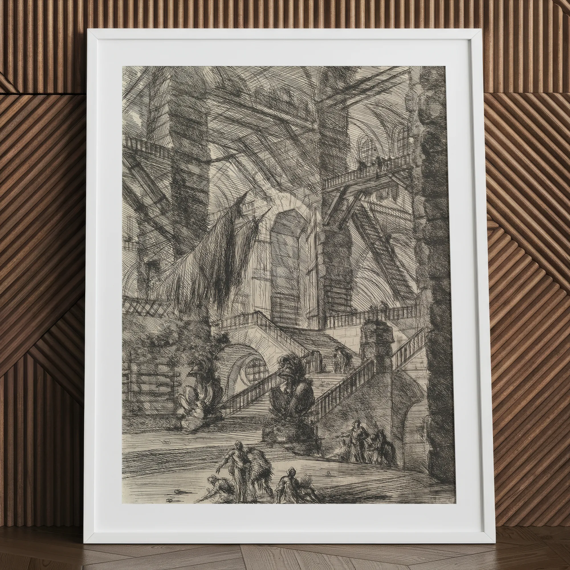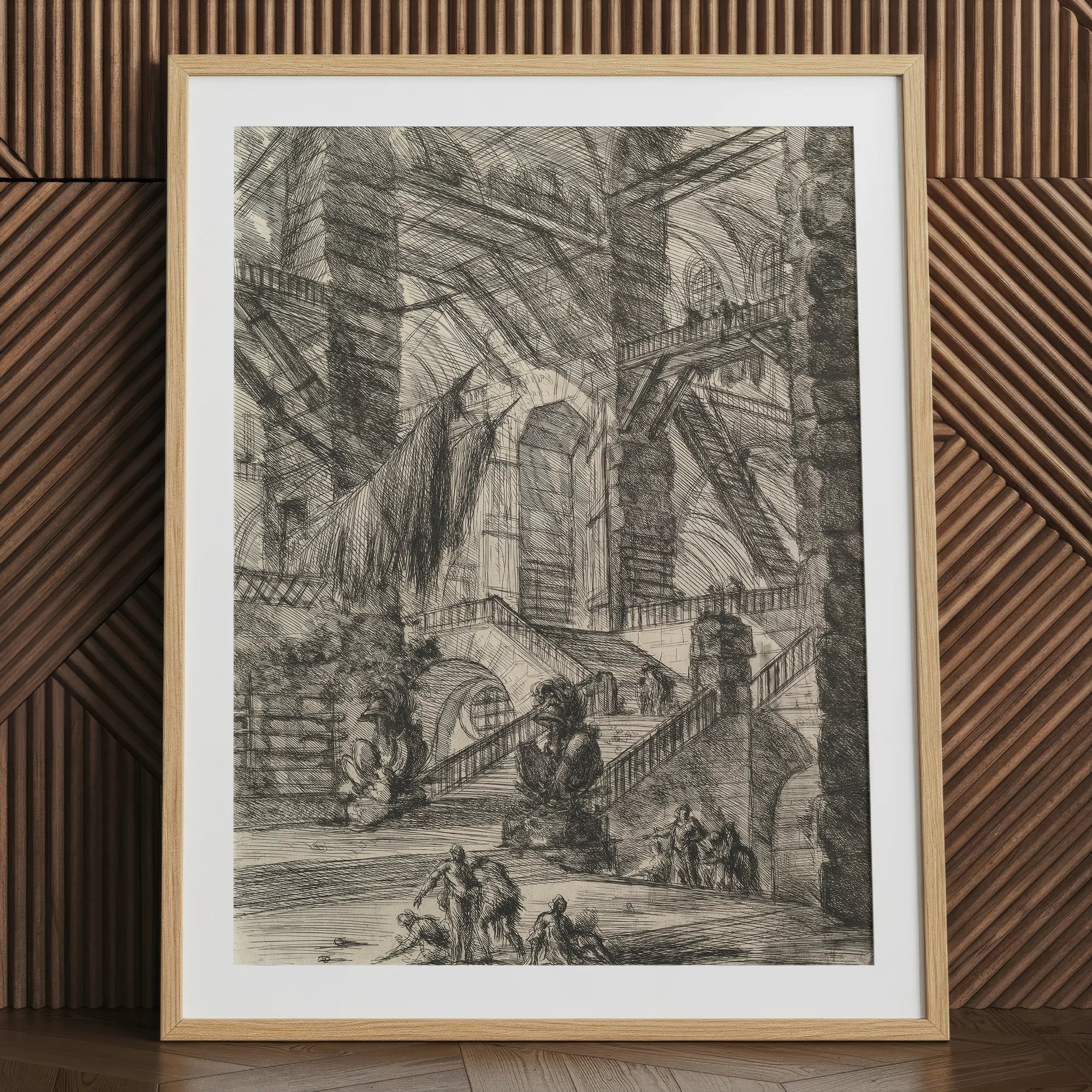 Trofei—armature rotte, teste laureate—presiedono corridoi troppo vasti per la misericordia. Piranesi trasforma l'architettura in confessione: ambizione incisa fino a quando non decade. Le scale inclinano nella follia, non portando verso l'alto ma verso l'interno, nell'abisso del disegno umano.