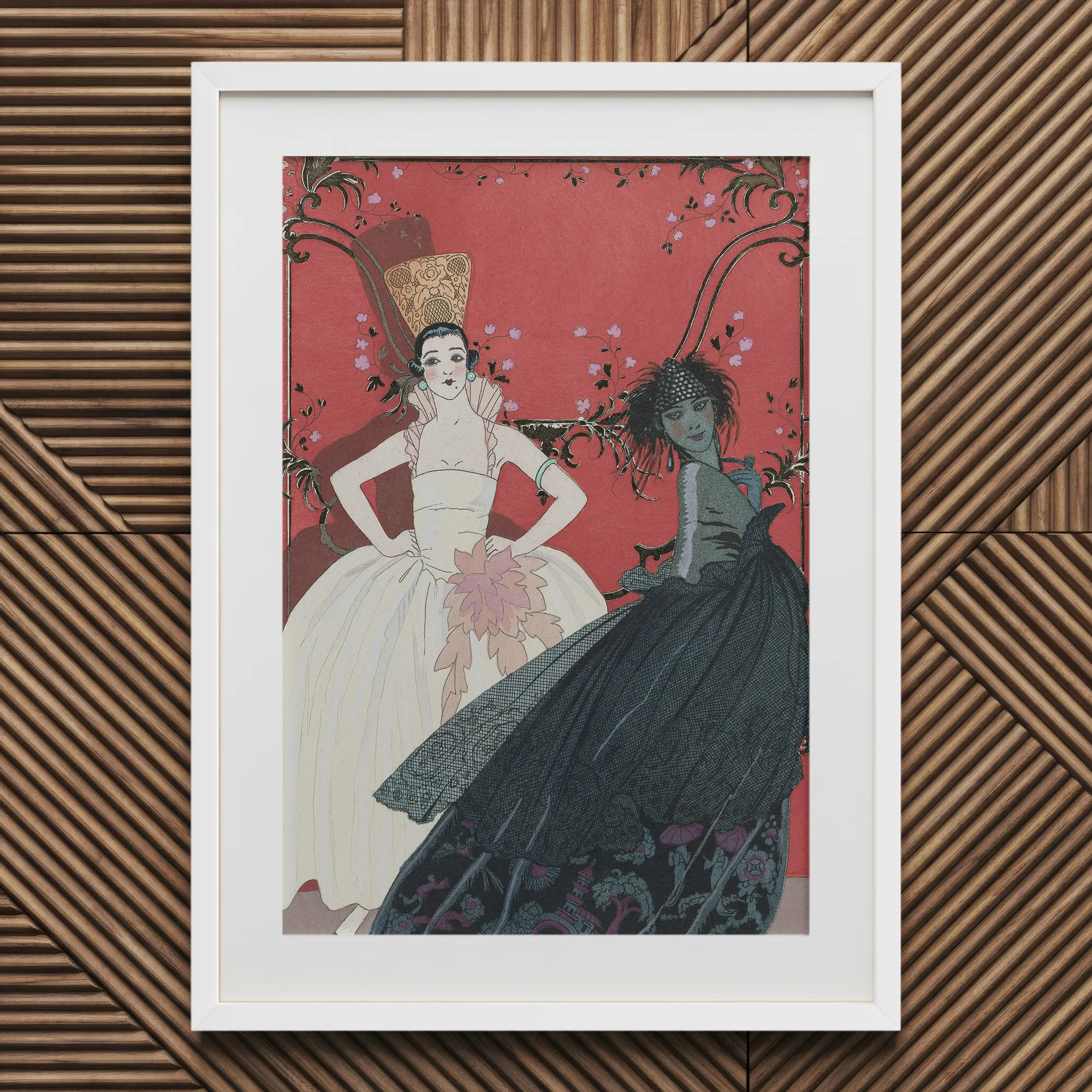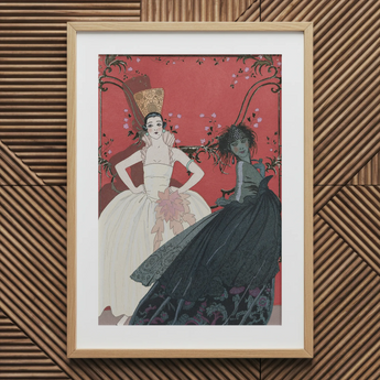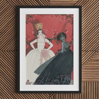 Mentre i tuoi occhi si deliziano sullo sfondo rosso cinese, assisti alla drammatica trasformazione che si svolge. Il radioso Giorno, adornato con un abito bianco splendente e un maestoso copricapo, si erge trionfante. La Notte, avvolta nel mistero e adornata con un complesso abito nero, si ritira nell'ombra. L'uso magistrale del contrasto e del simbolismo di Barbier dà vita a questa metamorfosi in stile Cenerentola, catturando l'essenza della predilezione dell'alta società degli anni '20 per i cambi di guardaroba multipli giornalieri.