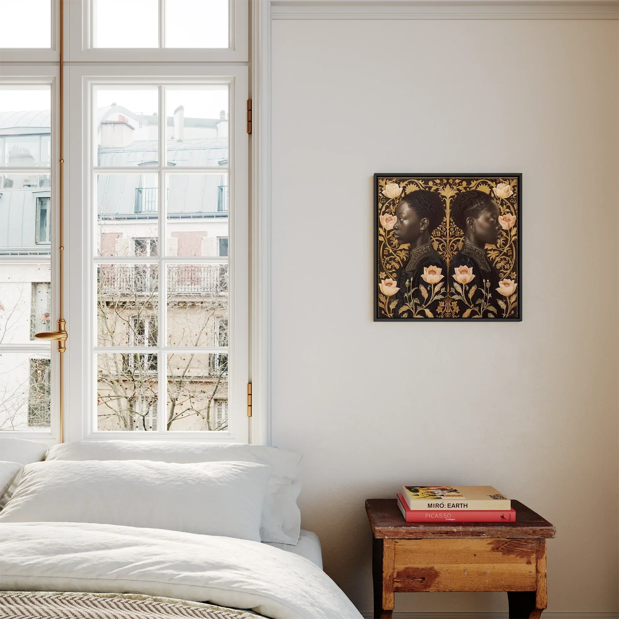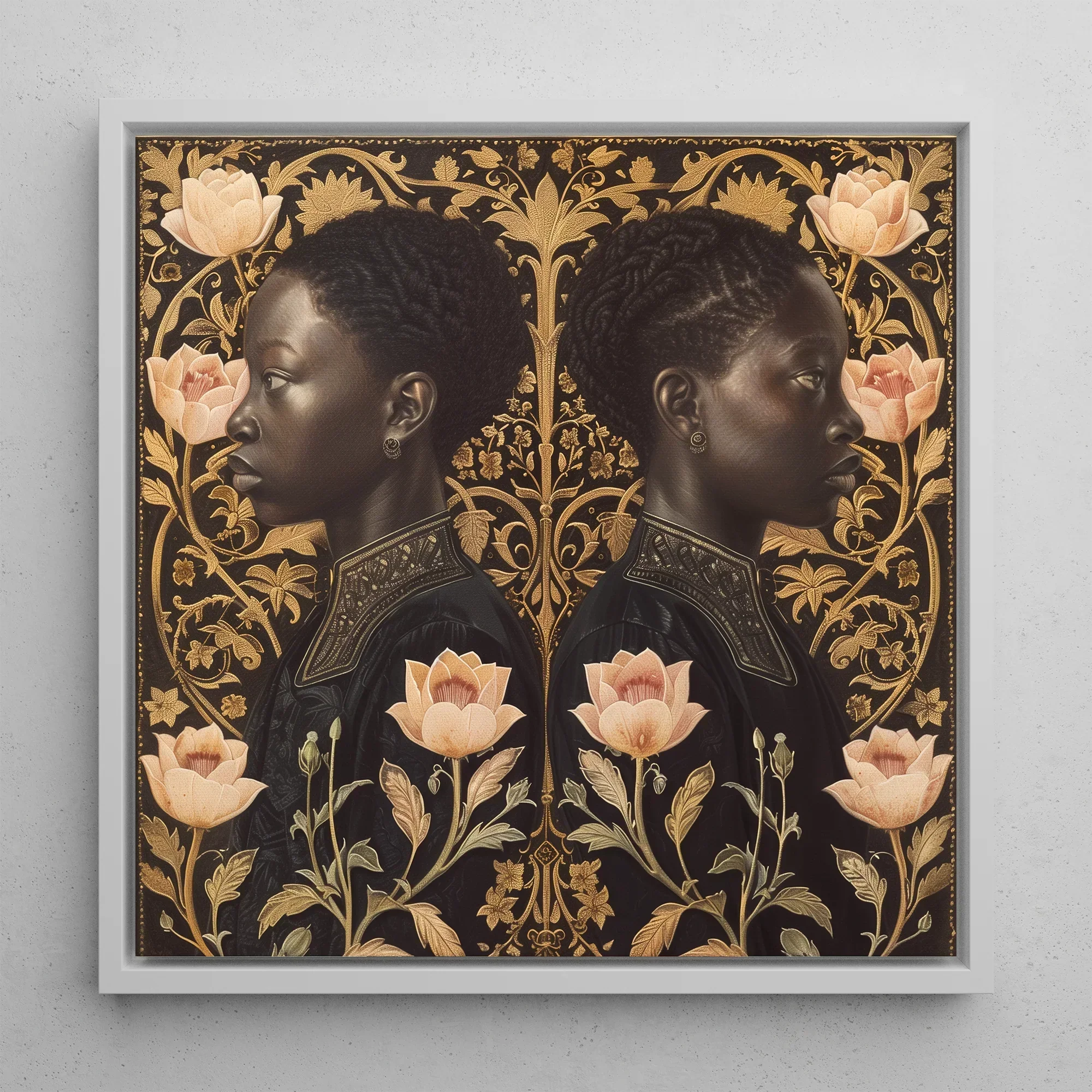 Piantati in un mondo in cui passati e presenti si scontrano. Lizzie e Carlotta Beckon, una meraviglia neo-rinascimentale che pulsa con la vitalità moderna. I profili gemelli di gemelli neri regali emergono da campi rosa e dorati, il loro sguardo penetrante secoli. Intricate danza da filigrana ambra intorno a loro, facendo eco Art nouveauLe curve sensuali mentre evocano la precisione olandese.