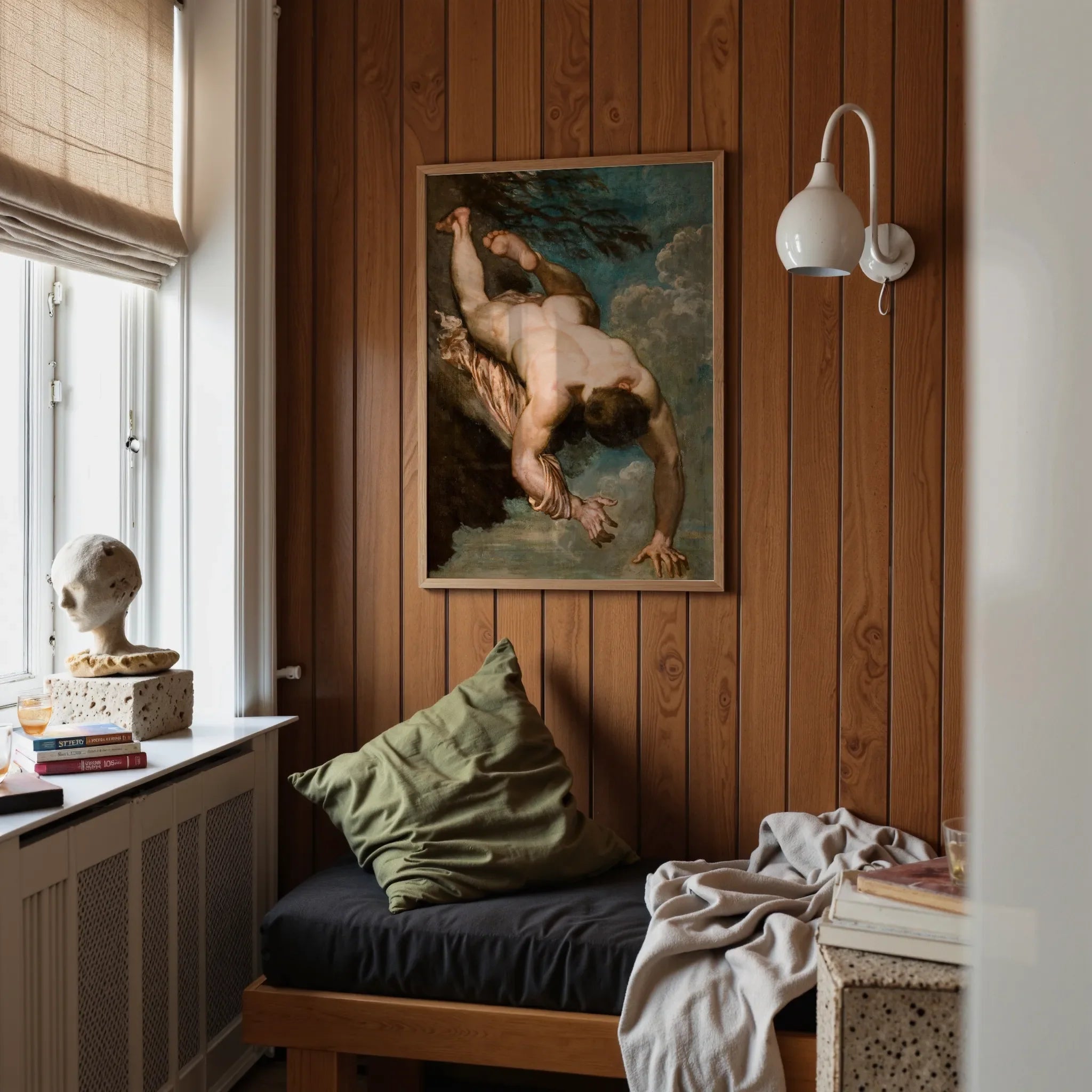 La figura nuda di Manlius si tuffa a capofitto con la sua forma muscolare contorta in una lotta finale e disperata. L'effetto del Chiaroscuro mette in evidenza la tensione nervosa del suo corpo contro la roccia oscura e il cielo minaccioso, evocando un senso di destino. La meticolosa pennellata di Etty e l'uso di toni ricchi e terrosi portano sul realismo viscerale sulla scena, sottolineando la fisicità e l'emozione grezza del momento.