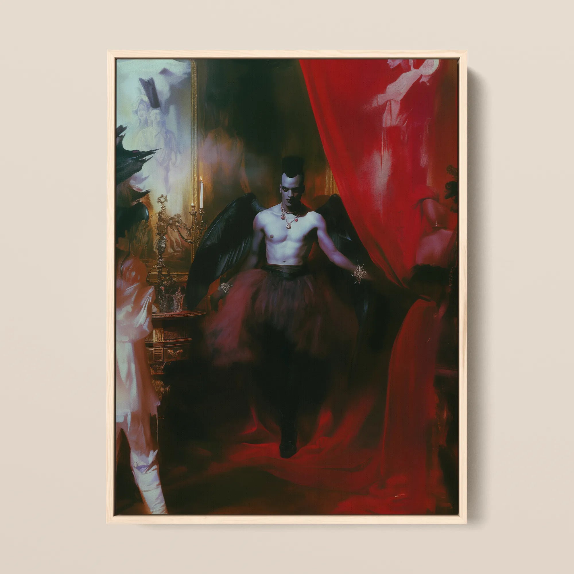 Uno strappo nel tempo, una scheggia di oscurità vellutata—Marius emerge, una visione cucita dalla luce delle candele e dall'ombra. La sua presenza è un'invocazione, il suo corpo è per metà illuminato nel bagliore tremolante, adornato con strati di tulle come il fantasma di un principe dimenticato. L'aria vibra con il peso dei secoli, il sapore del sangue antico persiste come una maledizione sussurrata. Le sue ali, nere come il vuoto tra le stelle, si piegano e si spiegano con misurata eleganza, proiettando silhouette ondulanti contro uno specchio dorato dove le figure vacillano—spettri di ossessioni passate, congelati nella periferia.