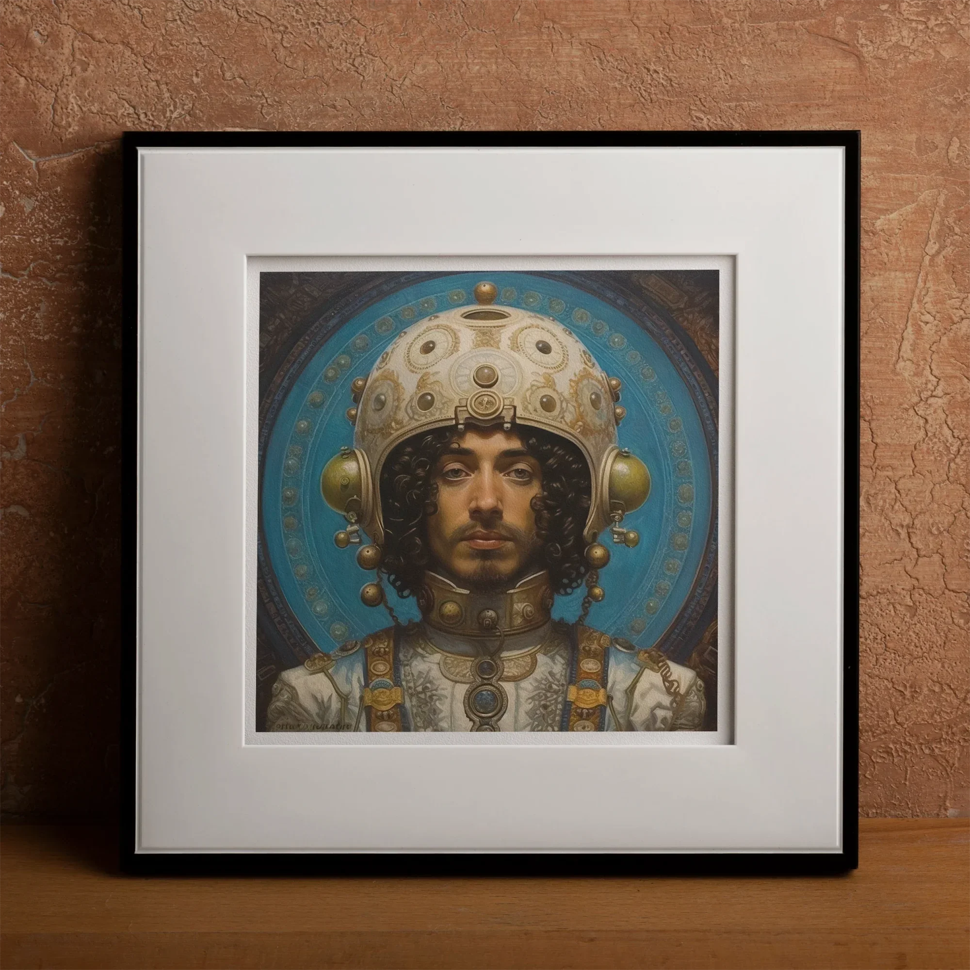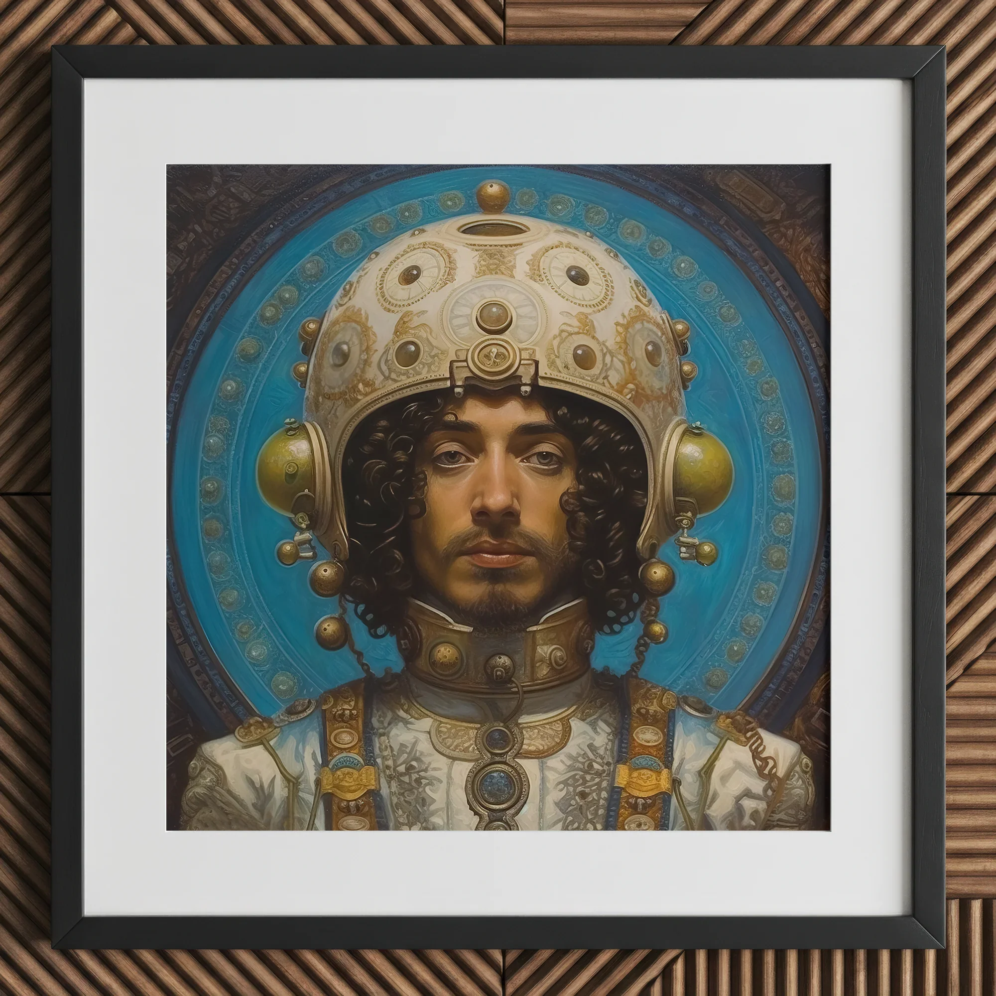 Il suo sguardo? Incrollabile. Una costellazione di sfida e desiderio. I motivi ricamati della sua tuta spaziale brillano come i mosaici del Levante. Calligrafia dorata intrecciata nel tessuto stesso del suo viaggio. Mehdi non recide i legami con la Terra; porta con sé la sua eredità, ogni ornamento un talismano contro la cancellazione. La geometria islamica incontra la metallurgia futuristica—la sua armatura, la sua eredità, la sua ribellione.
