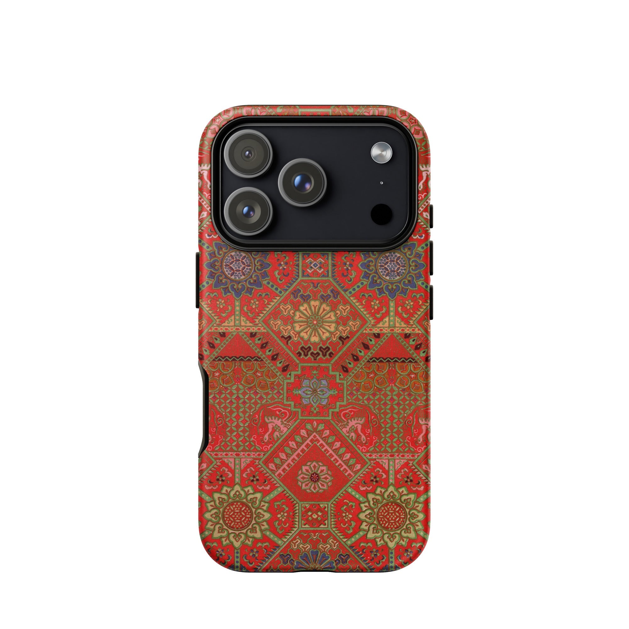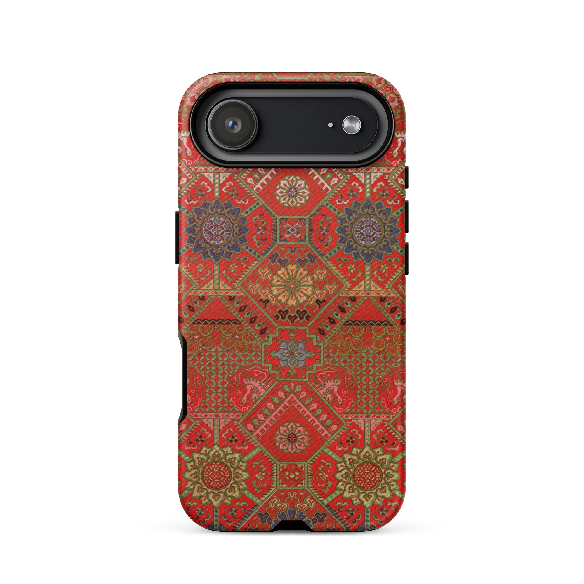 Questa custodia per iPhone sembra di tenere un frammento di un giardino infinito. Caratterizzata dal motivo Flower Fan di G.A. Audsley, sboccia all'intersezione tra l'ingegno umano e il ritmo sconfinato della natura. La superficie è viva con rossi radianti, una profonda tonalità di battito cardiaco che ancora un intricato mosaico di vita. All'interno della sua griglia esagonale si trova una sinfonia di motivi: i fiori si aprono con precisione matematica, i loro petali si estendono verso l'esterno come promesse sussurrate all'universo, mentre accenti dorati ondeggiano come ruscelli illuminati dal sole attraverso una foresta densa.
