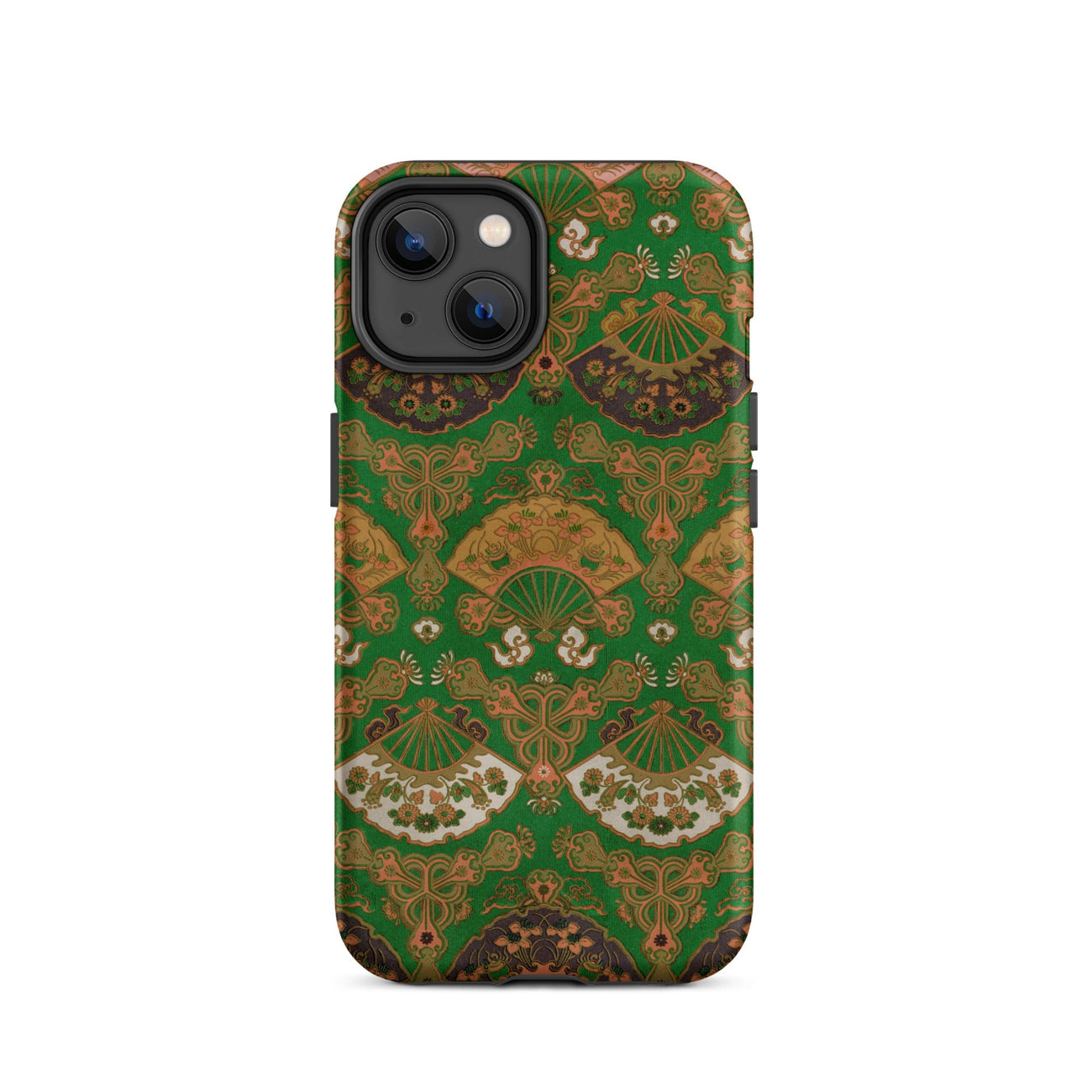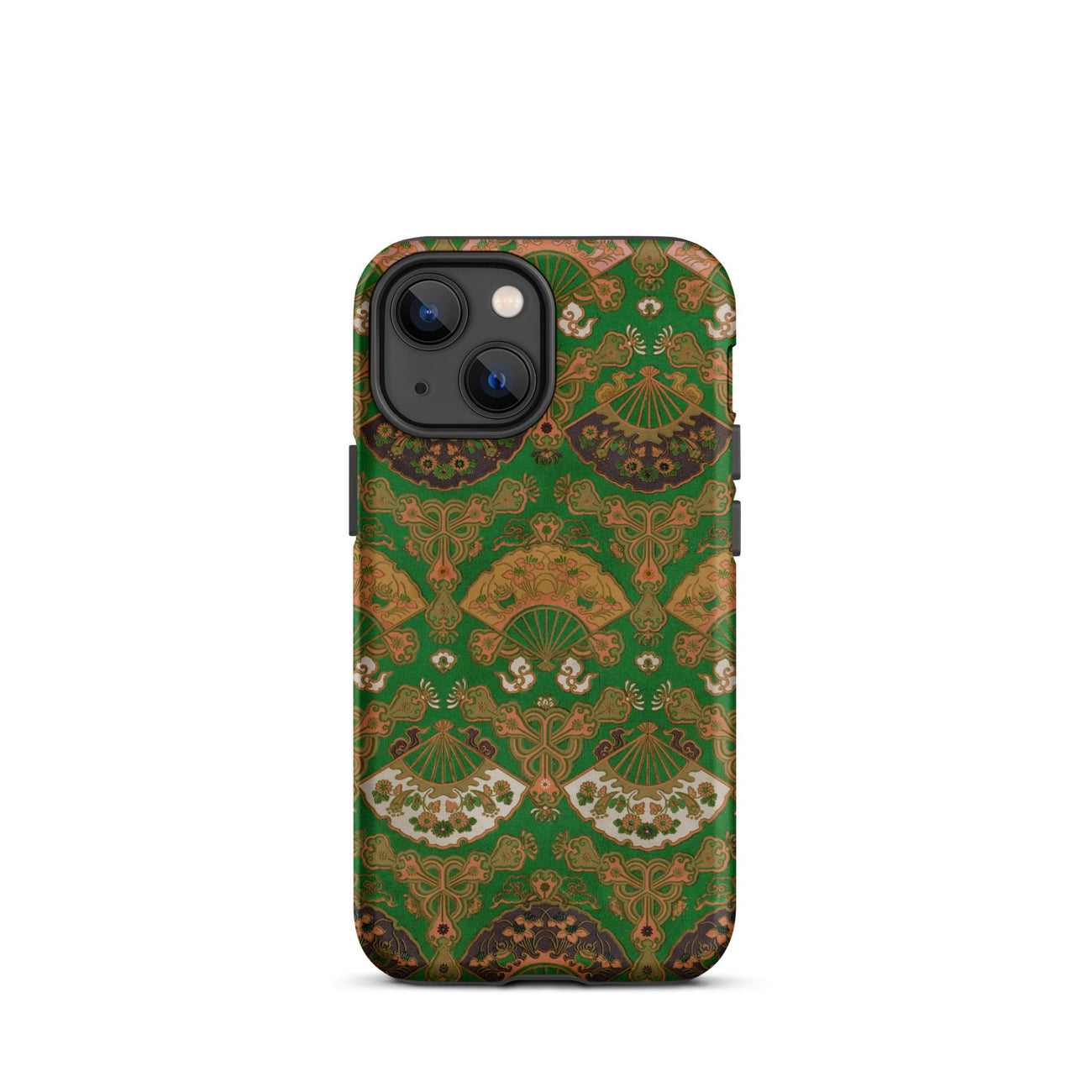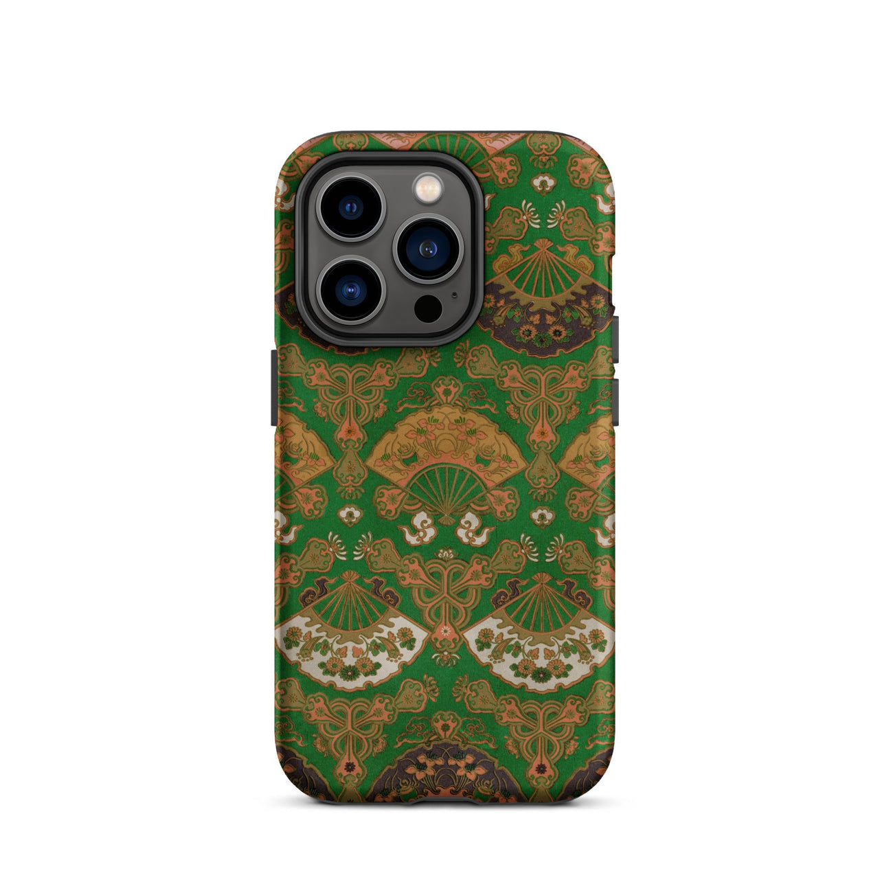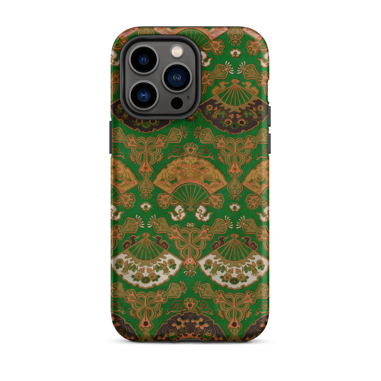 La custodia per iPhone con motivo a ventaglio floreale giapponese si apre come un giardino segreto inciso su un cielo di seta. La visione di George Ashdown Audsley sussurra attraverso il tempo: un labirinto di ventagli pieghevoli, ciascuno un santuario della danza eterna della natura. Le loro forme sbocciano come mezze lune, portando il peso delle stagioni effimere, mentre accenti floreali dorati si riversano su campi di smeraldo, brillando come la luce del sole che rompe attraverso il fogliame denso.