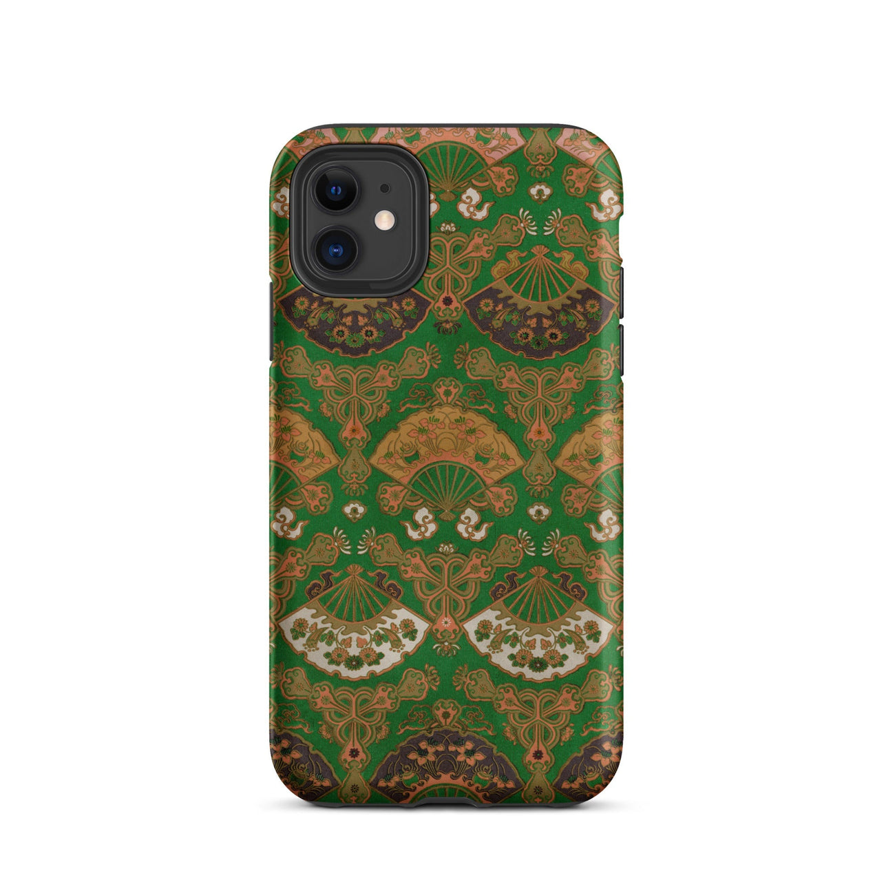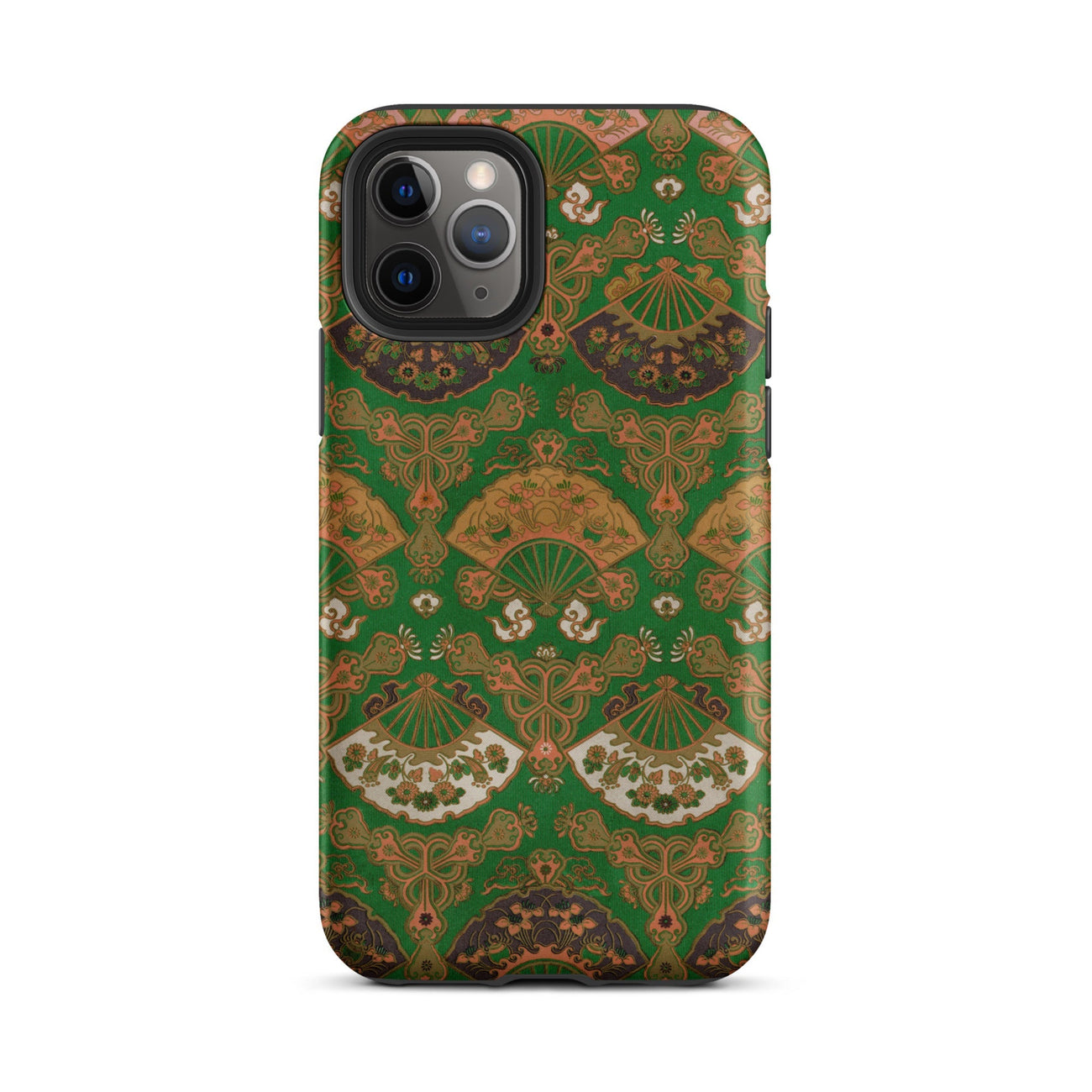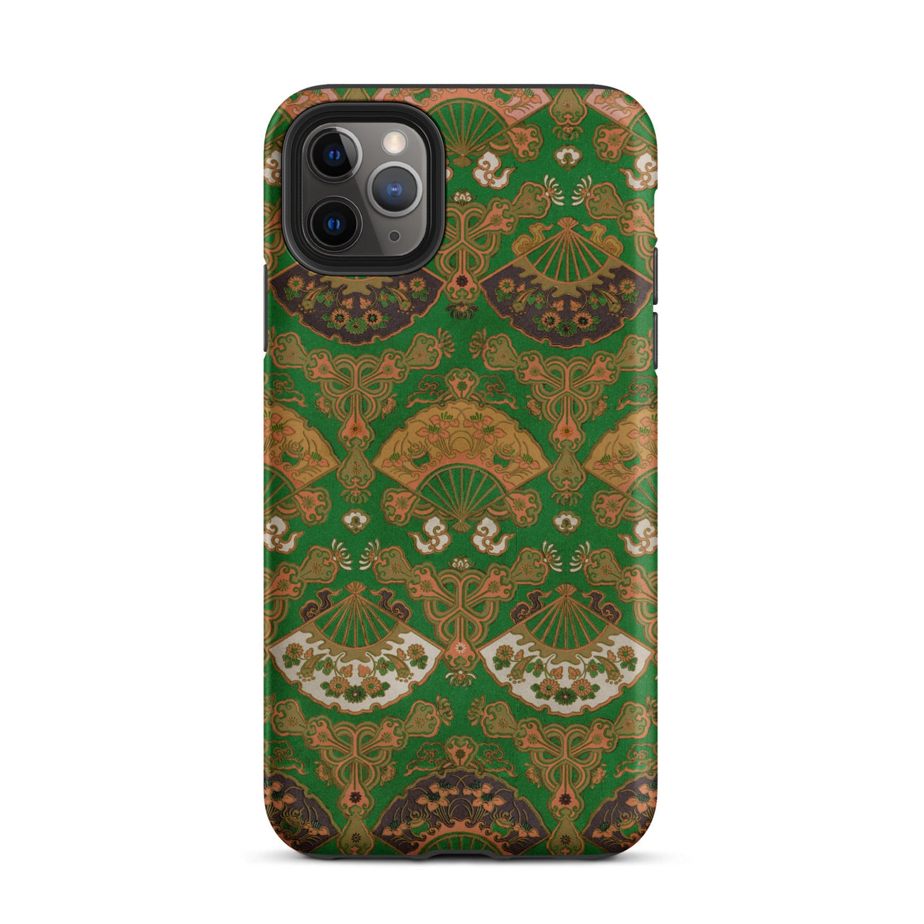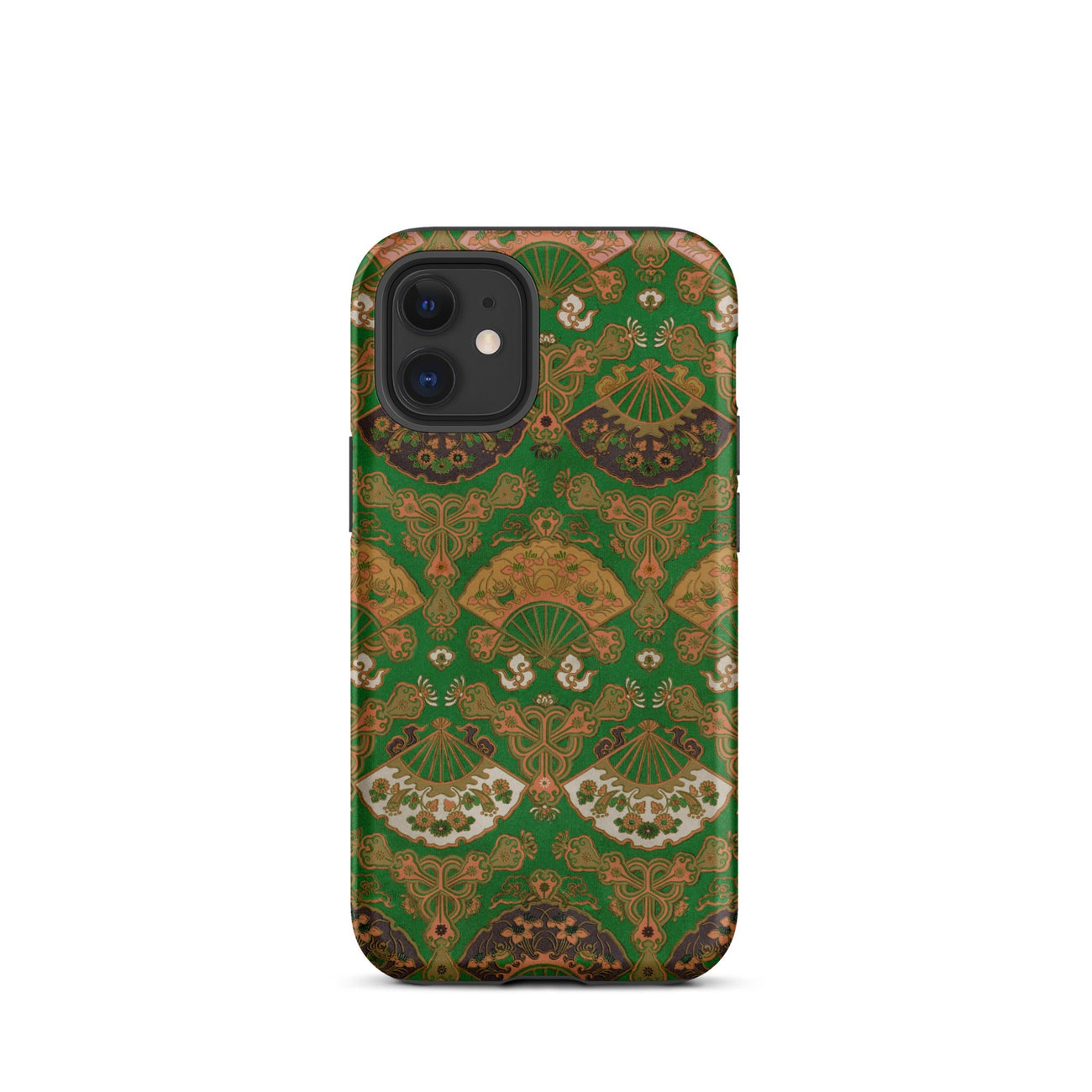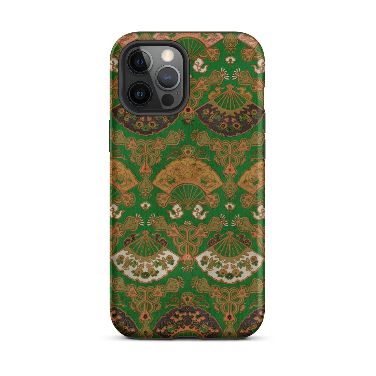 La custodia per iPhone con motivo a ventaglio floreale giapponese si apre come un giardino segreto inciso su un cielo di seta. La visione di George Ashdown Audsley sussurra attraverso il tempo: un labirinto di ventagli pieghevoli, ciascuno un santuario della danza eterna della natura. Le loro forme sbocciano come mezze lune, portando il peso delle stagioni effimere, mentre accenti floreali dorati si riversano su campi di smeraldo, brillando come la luce del sole che rompe attraverso il fogliame denso.