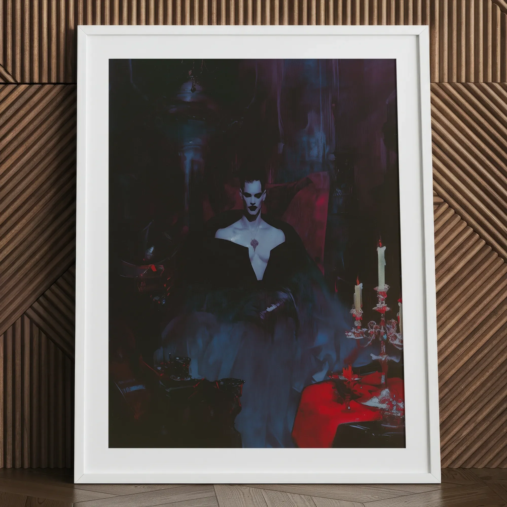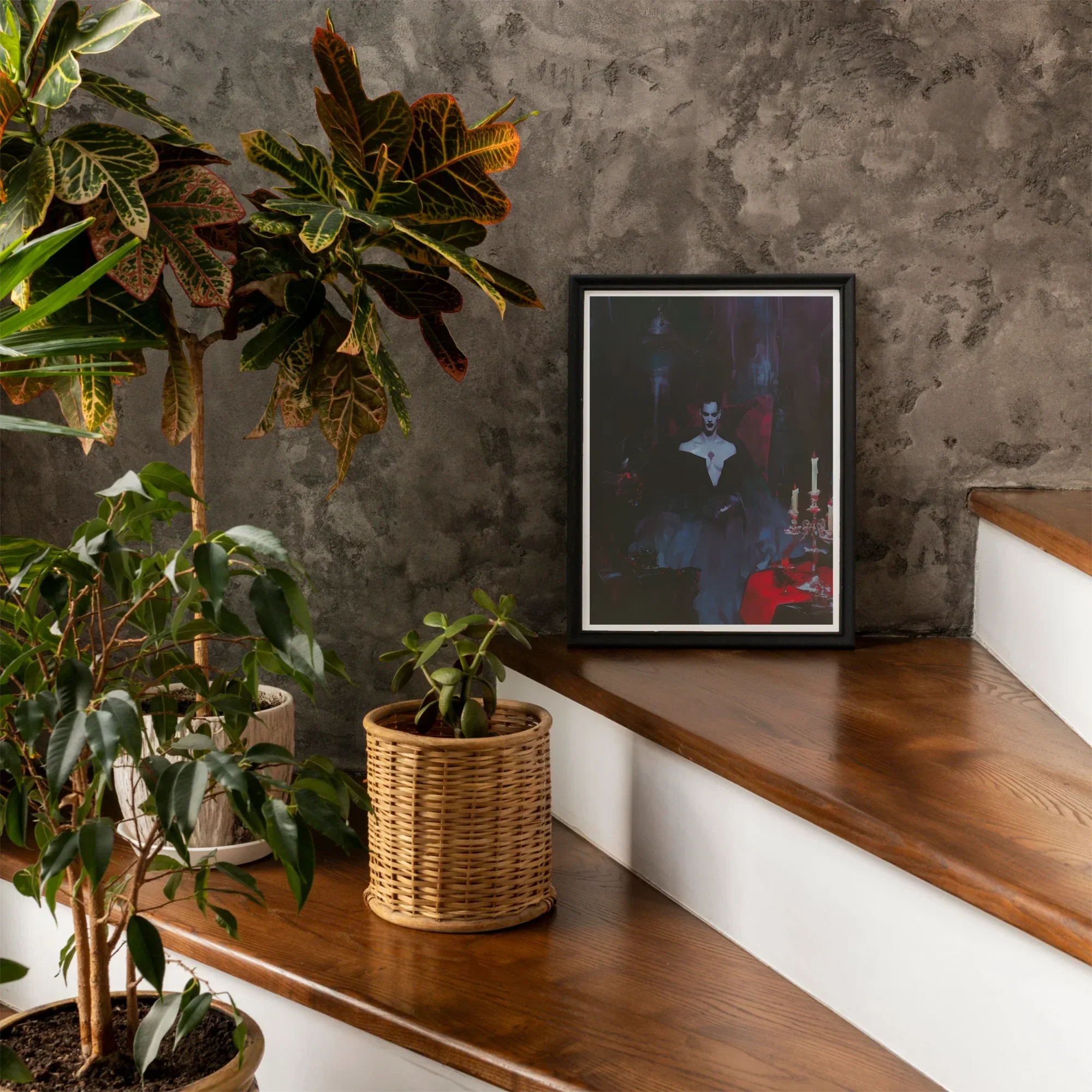 Lo sfarfallio di una singola candela lancia una leggera luce su un tableau sia bello che terrificante. I suoi occhi scuri ti attirano, comandando silenziosamente il tuo sguardo, sfidandoti ad avvicinarti anche mentre il velluto rosso tende dietro di lui si increspisce con un respiro invisibile di pericolo. Un promemoria morbido, delicato e mortale della danza vampirica tra vita e decadimento.