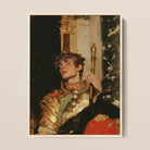 La luce scivola sulla sua armatura dorata in stile rinascimentale, illuminando ogni dettaglio intricato—gli ornamenti barocchi, le perle che parlano di antica grandezza, il mantello rifinito in velluto drappeggiato su spalle che portano più di un semplice tessuto. Questa stampa d'arte storica queer stampa d'arte cattura un momento di tensione: il peso della tradizione che preme contro la silenziosa sfida nella sua postura. Non si protende verso il trono. Si protende verso qualcosa di invisibile.