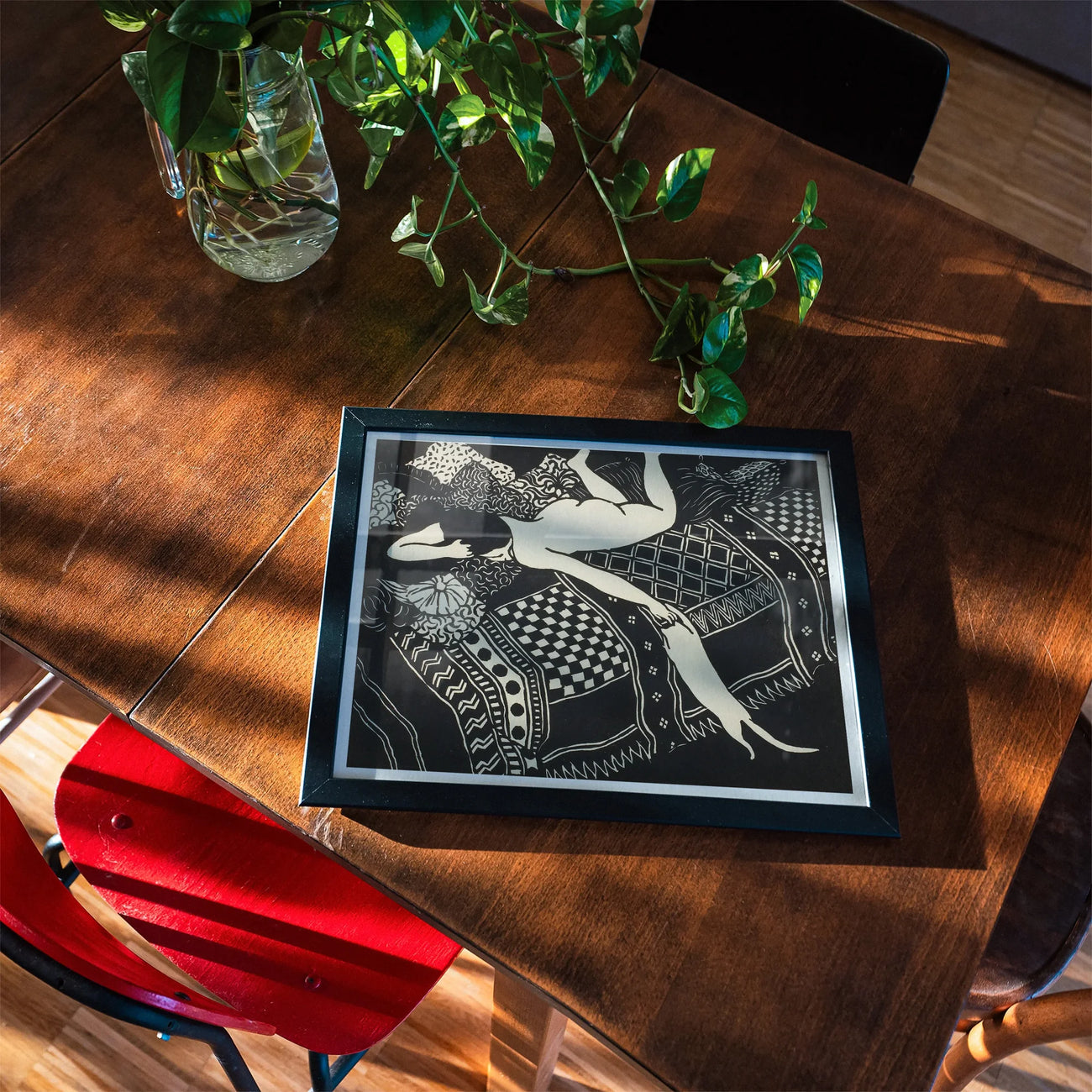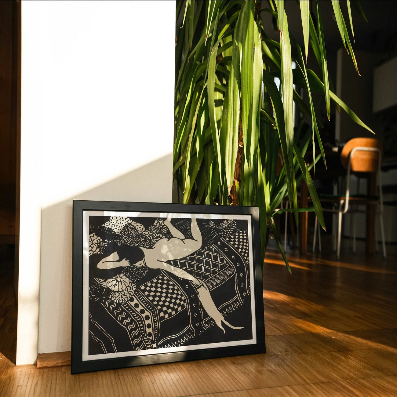 Mentre i tuoi occhi tracciano le curve sinuose del corpo reclinabile, verrai attratto in un mondo di contrasti: carne morbida contro i disegni geometrici, forme organiche giustapposte a motivi rigidi, la sua mano piena che si allunga per accarezzare la testa del suo gatto mentre la figa fa si fa strada sul letto. L'uso audace da parte dell'artista del bianco e nero non solo definisce la forma, ma crea anche un ritmo visivo ipnotico, guidandoti attraverso un paesaggio di tessuti e trame.