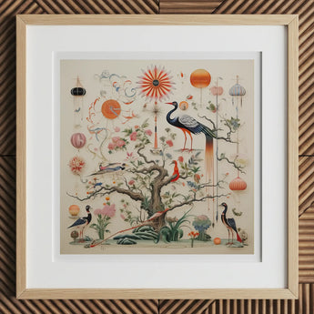 Questa composizione squisita si concentra su un albero nodoso che brulica di esotico Avian La vita, circondata da una fantasmagoria di lanterne galleggianti, fioriture vibranti e sfere celesti. La padronanza del colore dell'artista è evidente nella miscela armoniosa di rosa coralli, blu profondi e arance luminose su uno sfondo neutro. Ogni elemento, dai trampolieri a gambe lunghe agli intricati motivi floreali, è reso con dettagli meticolosi, invitando la contemplazione prolungata.