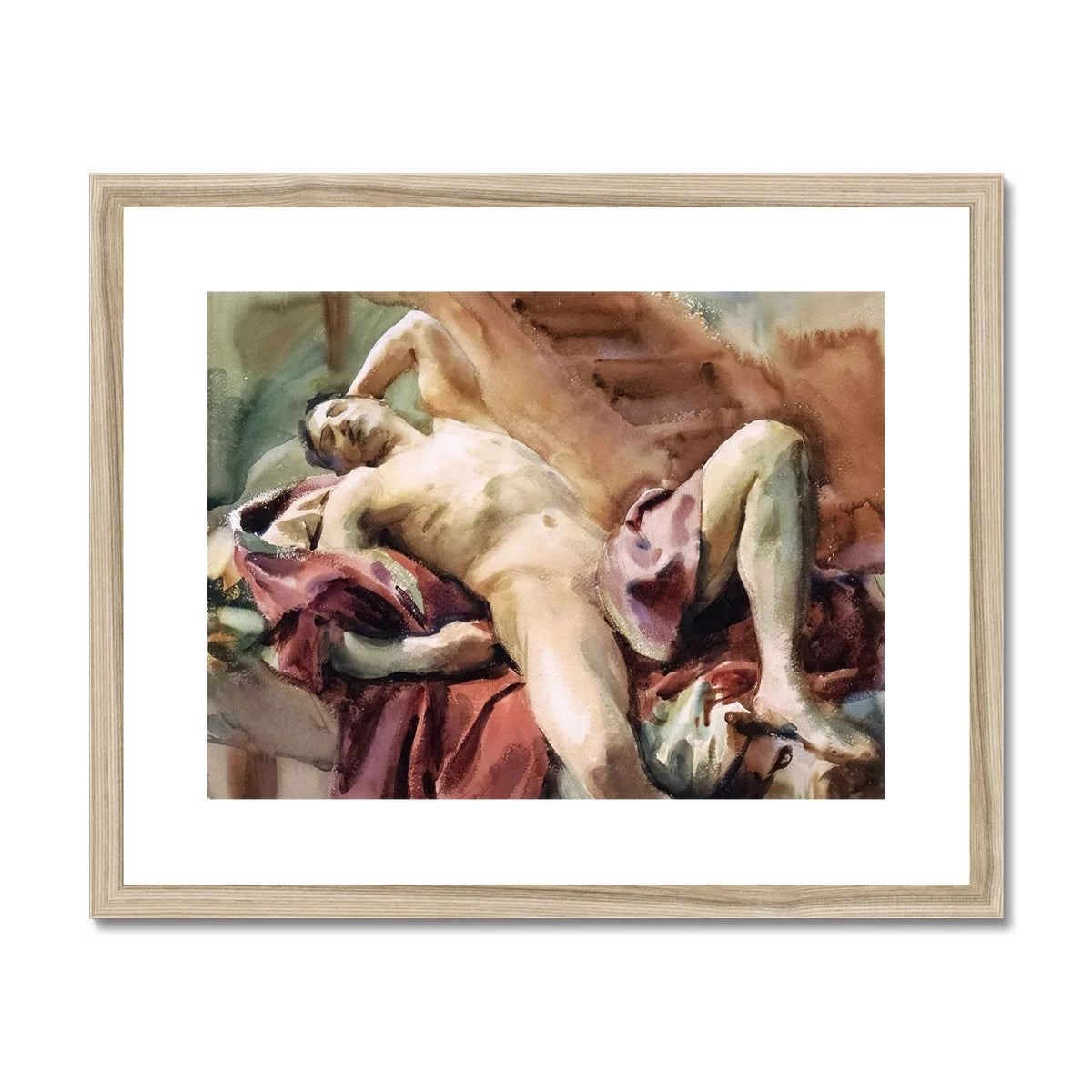 In "Nude Ritratto di Nicola d'Inverno" di John Singer Sargent, siamo attratti da un intimo tableau gay di languido riposo. Dove la forma del modello è sia un oggetto di bellezza serena che uno studio sulla vulnerabilità umana. La tecnica dell'acquerello di Sargent, con i suoi lavaggi fluidi e l'ombreggiatura delicata, cattura il gioco di luce e ombra attraverso il corpo rilassato e muscoloso di Nicola.