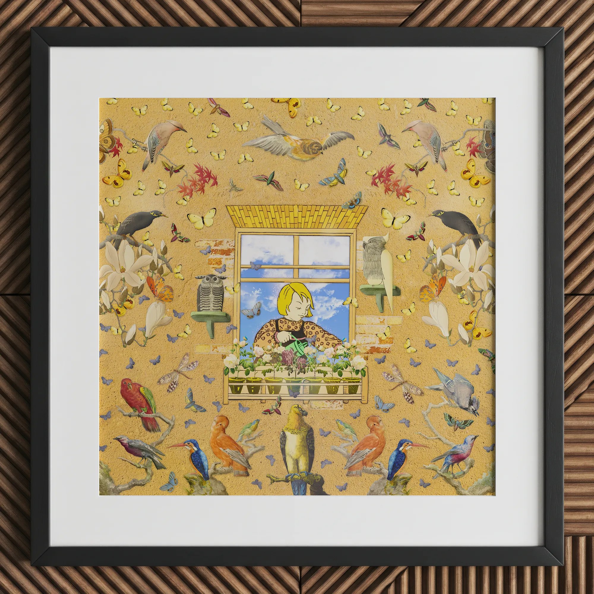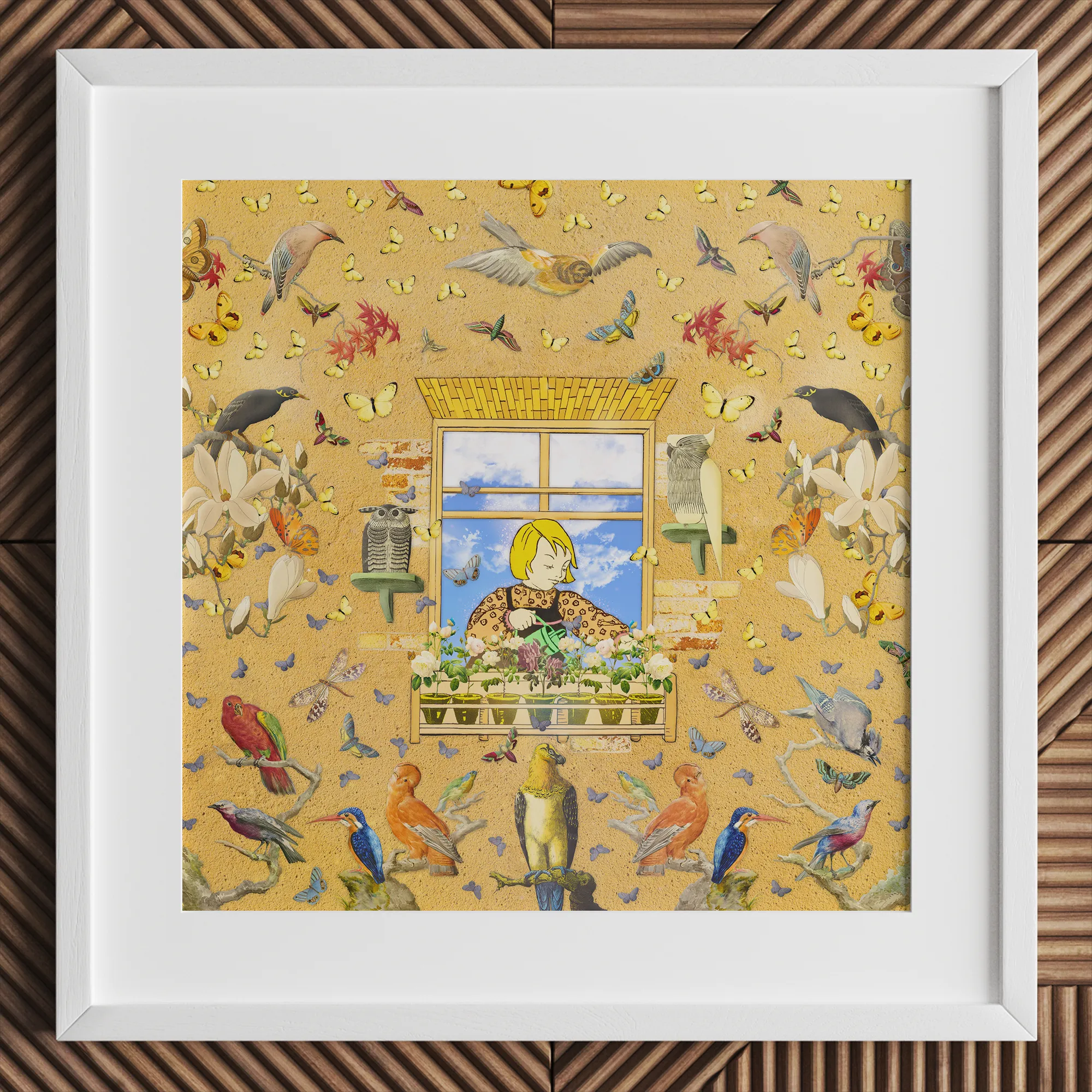 Il sogno giallo scoppia, una tela viva con flutter e canto. Sei attratto da Robyn pop art mondo, un surreale uccello Collage in cui la realtà si piega come raggi di sole attraverso le foglie. Una finestra dorata incornicia la sua essenza, catturata tra i regni del sonno e del veglia.