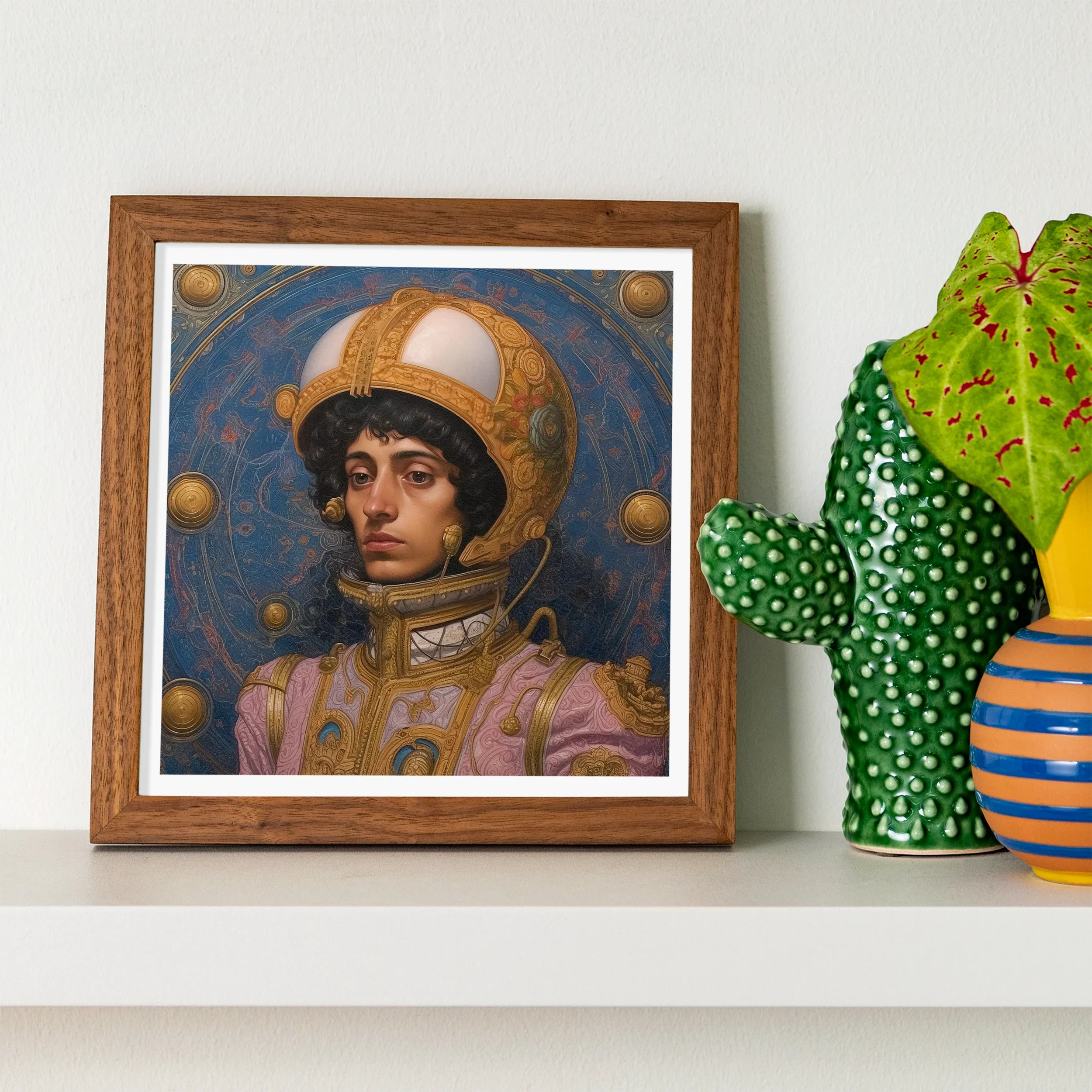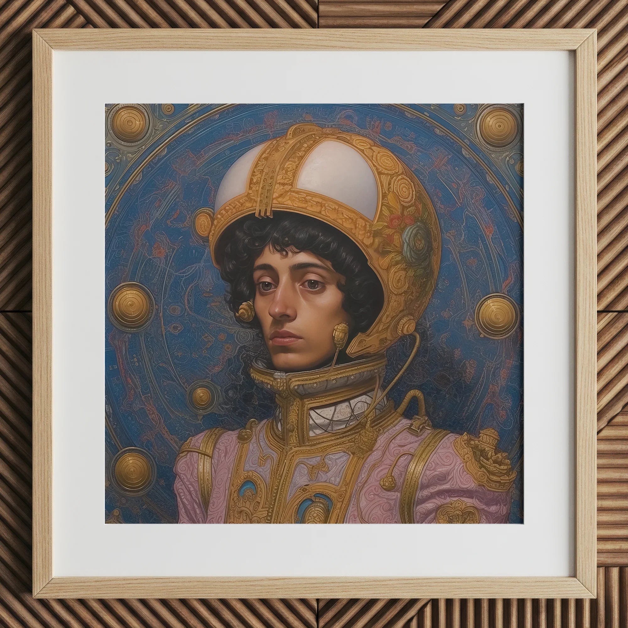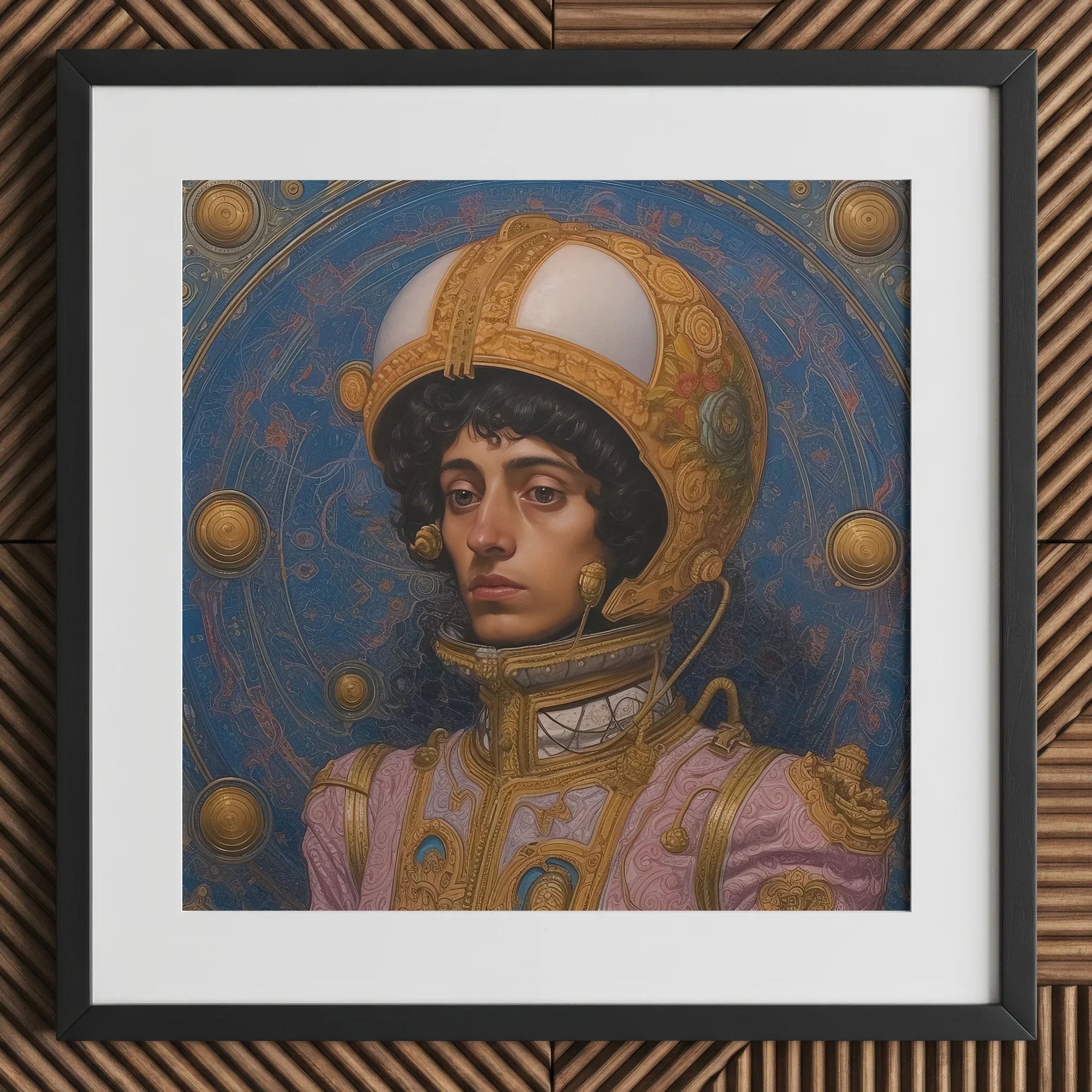Samir fluttua nell'immensa distesa silenziosa, né perso né in cerca—semplicemente diventando. Un gay astronauta musulmano, avvolto nel peso della storia e nell'assenza di peso dello spazio. La sua tuta cucita con gli echi calligrafici di sogni dimenticati. Evocando iscrizioni che un tempo adornavano le cupole di Damasco, i minareti di Samarcanda. Ogni filo dorato si avvolge come l'orbita di un pianeta errante, ogni linea un verso di poeti silenziati dal tempo ma mai dalla verità.