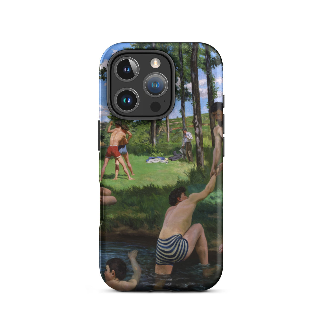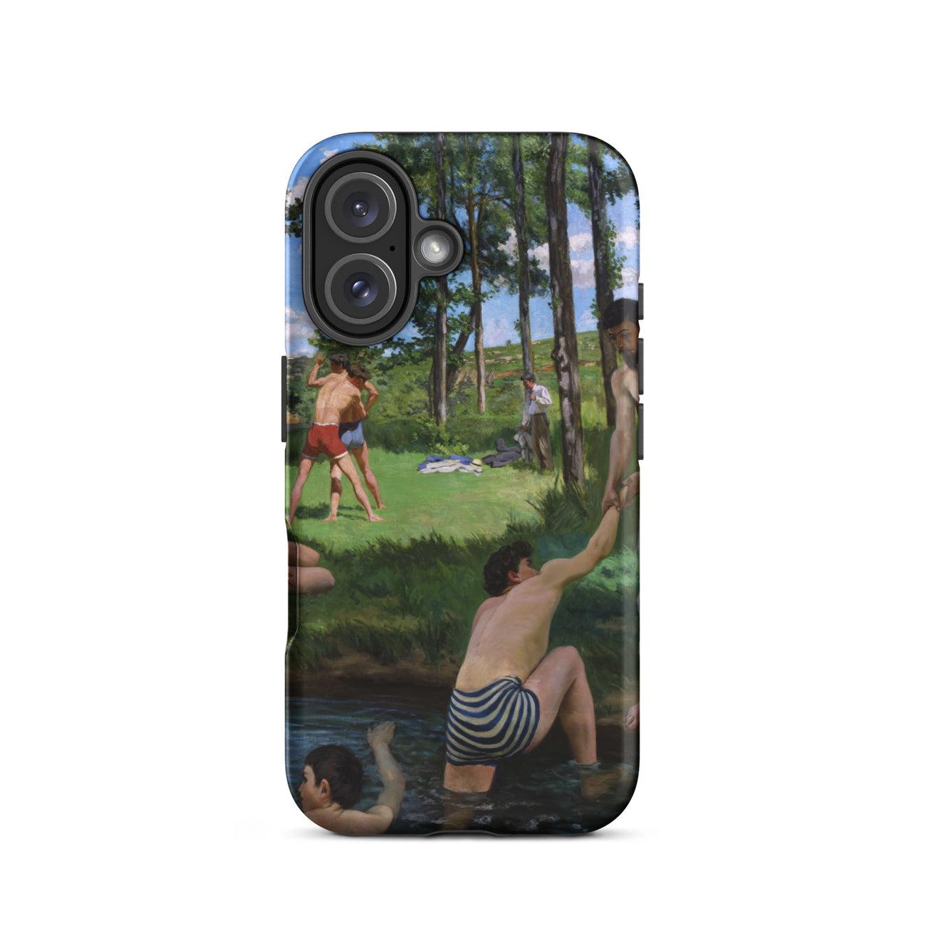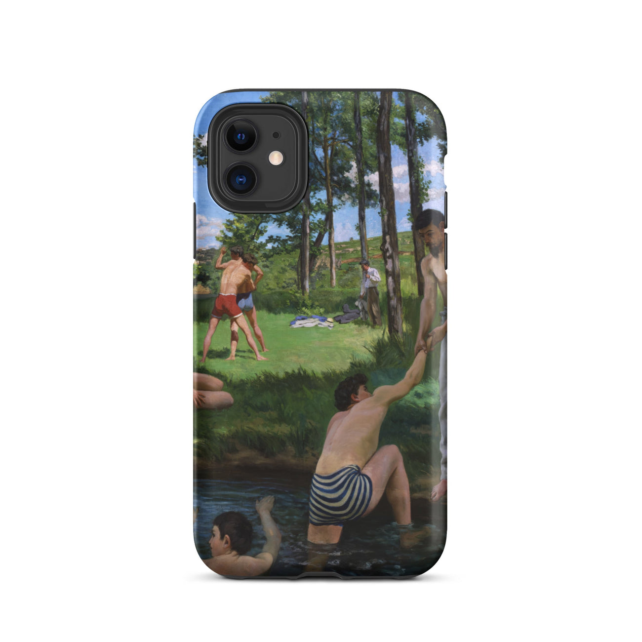 Summer Scene di Bazille si dispiega su questa custodia per iPhone come un frammento di svago sospeso nel tempo. Ragazzi in costumi da bagno a righe si immergono in acqua scura, uno si protende verso un amico sulla riva, mentre altri si allungano nei prati illuminati dal sole incorniciati da alberi alti.