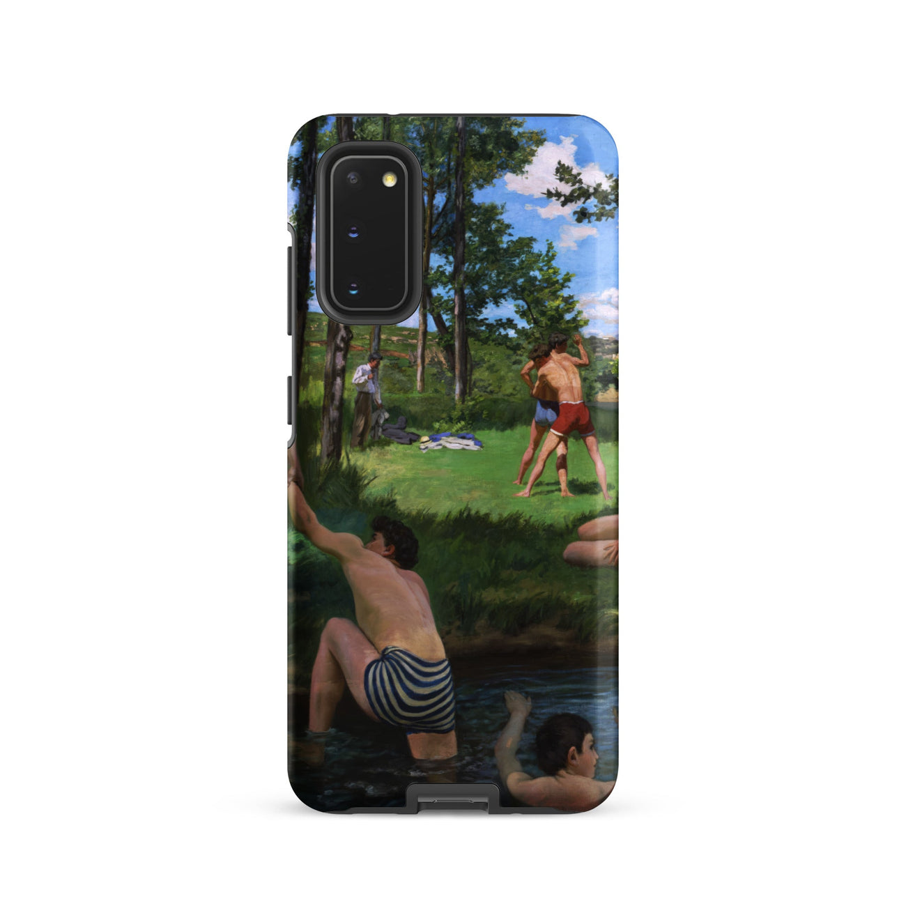 In questo case di Samsung, la scena estiva di Jean Frédéric Bazille trasforma un pomeriggio fugace lungo il fiume in un dipinto portatile. Un giovane emerge dall'acqua fresca, afferrando la mano di un uomo più anziano per stabilizzarsi nei pantaloncini a righe che aderiscono. Compagni sudati nuotano, si stirano o si rilassano nel prato. Gli alberi si ergono come sentinelle, tenendo il cielo blu e le nuvole in un reticolo di verde.