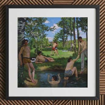 Un uomo si appoggia, schiena al betulla, fianco inclinato, tronco nudo—tronchi ocra che si aggrappano, ombreggiati nella corteccia verticale. Dietro di lui, una figura si distende in diagonale: cotone a righe sulle cosce, torso inclinato al sole, braccio piegato in una pendenza pittorica. A destra, un ragazzo in acqua solleva le braccia per scivolare—carne lucente, spina dorsale esposta, spalle squadrate.